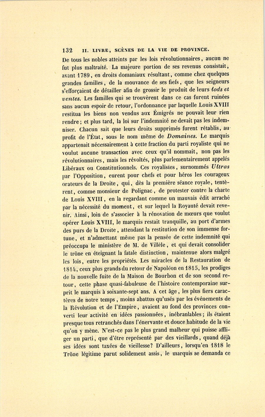 En 1822, malgré les bénéfices que la Restauration apportait aux émigrés, la fortune du marquis d’Esgrignon n’avait pas augmenté. {p. 132} De tous les nobles atteints par les lois révolutionnaires, aucun ne fut plus maltraité. La majeure portion de ses revenus consistait, avant 1789, en droits domaniaux résultant, comme chez quelques grandes familles, de la mouvance de ses fiefs, que les seigneurs s’efforçaient de détailler afin de grossir le produit de leurs lods et ventes. Les familles qui se trouvèrent dans ce cas furent ruinées sans aucun espoir de retour, l’ordonnance par laquelle Louis XVIII restitua les biens non vendus aux Émigrés ne pouvait leur rien rendre ; et plus tard, la loi sur l’indemnité ne devait pas les indemniser. Chacun sait que leurs droits supprimés furent rétablis, au profit de l’État, sous le nom même de Domaines. Le marquis appartenait nécessairement à cette fraction du parti royaliste qui ne voulut aucune transaction avec ceux qu’il nommait, non pas les révolutionnaires, mais les révoltés, plus parlementairement appelés Libéraux ou Constitutionnels. Ces royalistes, surnommés Ultras par l’Opposition, eurent pour chefs et pour héros les courageux orateurs de la Droite, qui, dès la première séance royale, tentèrent, comme monsieur de Polignac, de protester contre la charte de Louis XVIII, en la regardant comme un mauvais édit arraché par la nécessité du moment, et sur lequel la Royauté devait revenir. Ainsi, loin de s’associer à la rénovation de mœurs que voulut opérer Louis XVIII, le marquis restait tranquille, au port d’armes des purs de la Droite, attendant la restitution de son immense fortune, et n’admettant même pas la pensée de cette indemnité qui préoccupa le ministère de monsieur de Villèle, et qui devait consolider le trône en éteignant la fatale distinction, maintenue alors malgré les lois, entre les propriétés. Les miracles de la Restauration de 1814, ceux plus grands du retour de Napoléon en 1815, les prodiges de la nouvelle fuite de la Maison de Bourbon et de son second retour, cette phase quasi-fabuleuse de l’histoire contemporaine surprit le marquis à soixante-sept ans. À cet âge, les plus fiers caractères de notre temps, moins abattus qu’usés par les événements de la Révolution et de l’Empire, avaient au fond des provinces converti leur activité en idées passionnées, inébranlables ; ils étaient presque tous retranchés dans l’énervante et douce habitude de la vie qu’on y mène. N’est-ce pas le plus grand malheur qui puisse affliger un parti, que d’être représenté par des vieillards, quand déjà ses idées sont taxées de vieillesse ? D’ailleurs, lorsqu’en 1818 le Trône légitime parut solidement assis, le marquis se demanda ce {p. 133} qu’un septuagénaire irait faire à la cour, quelle charge, quel emploi pouvait-il y exercer ? Le noble et fier d’Esgrignon se contenta donc, et dut se contenter du triomphe de la Monarchie et de la Religion, en attendant les résultats de cette victoire inespérée, disputée, qui fut simplement un armistice. Il continuait donc alors à trôner dans son salon, si bien nommé le Cabinet des Antiques. Sous la Restauration, ce surnom de douce moquerie s’envenima lorsque les vaincus de 1793 se trouvèrent les vainqueurs.