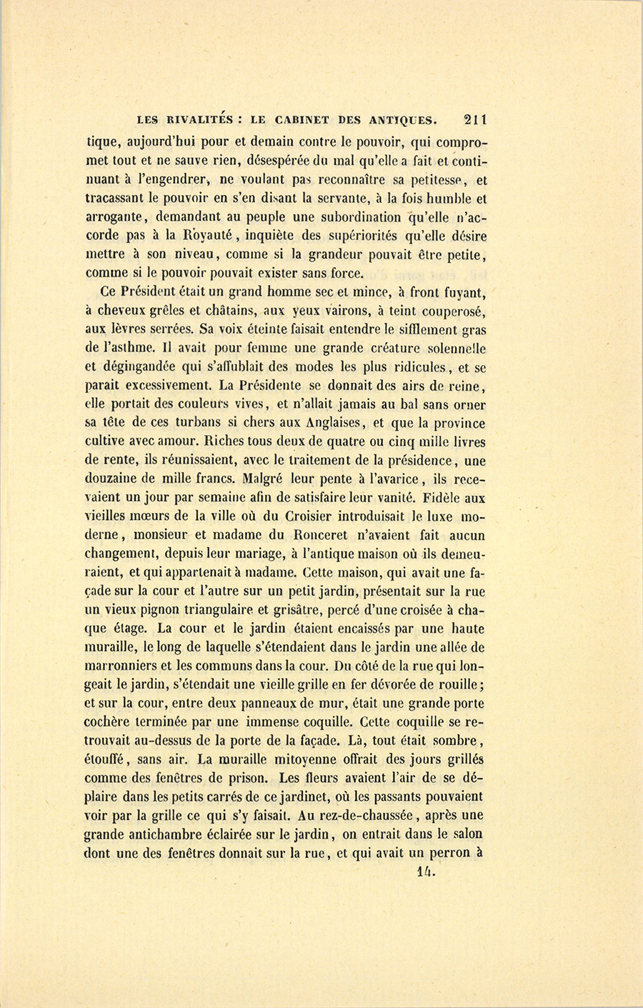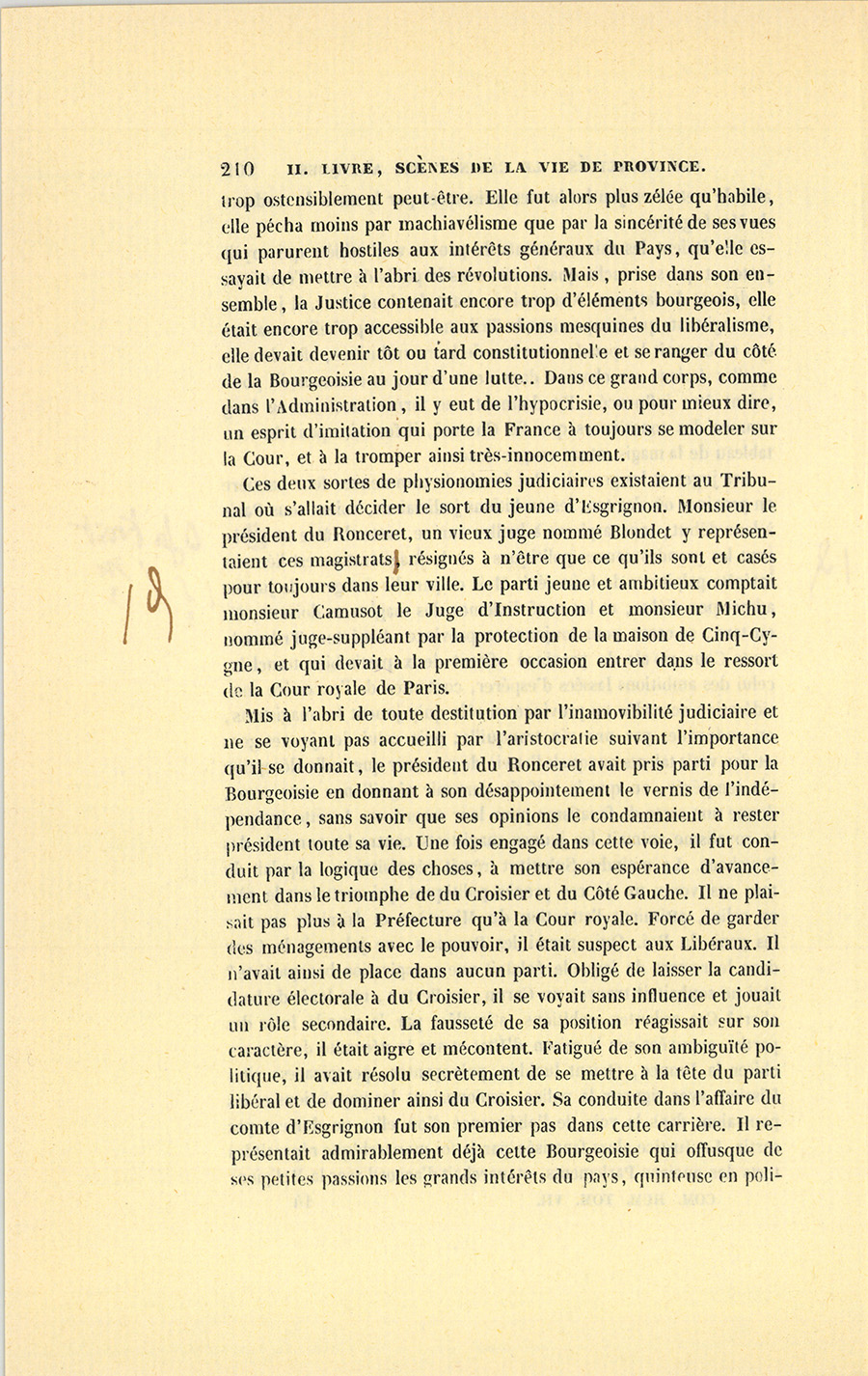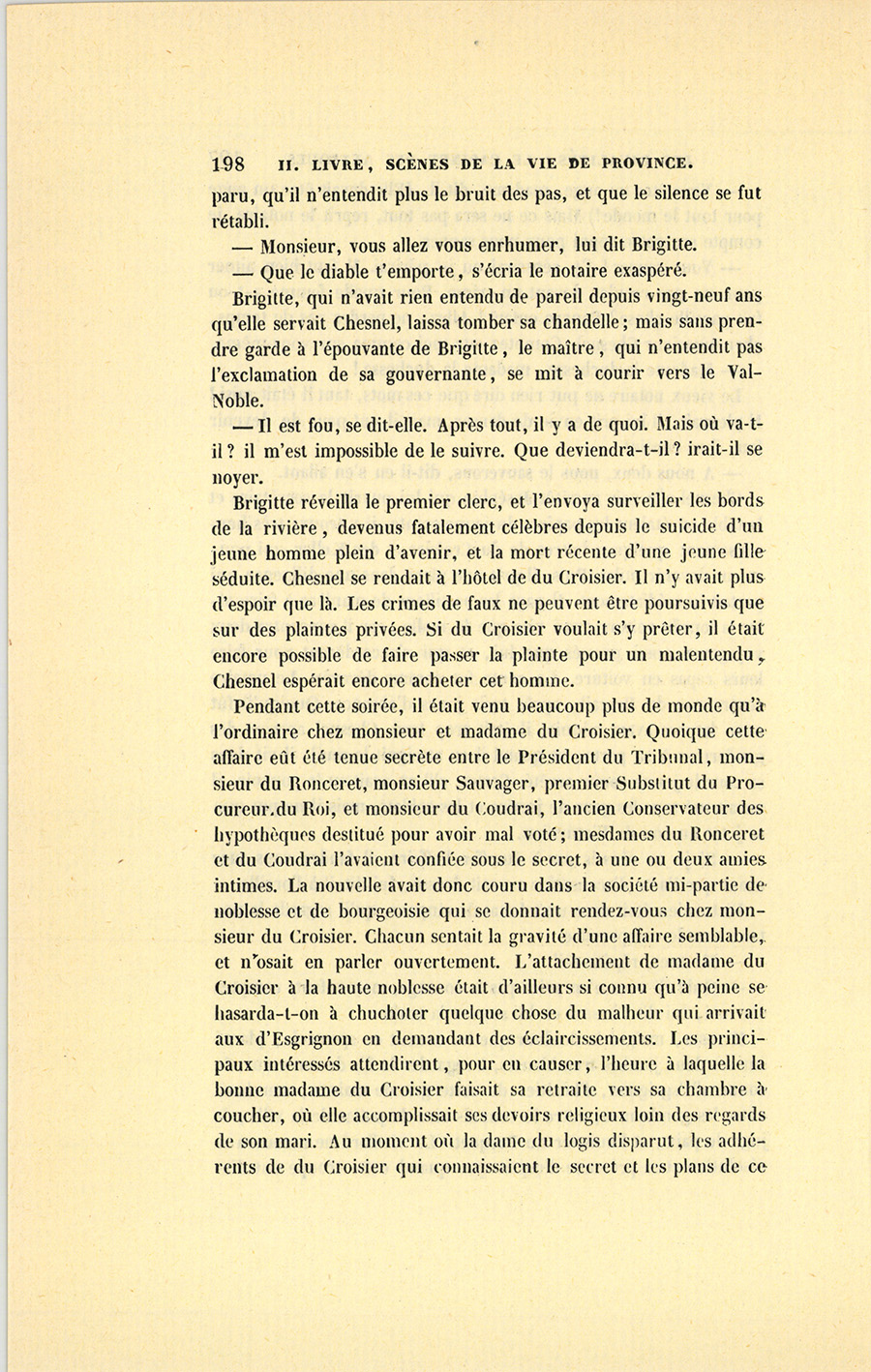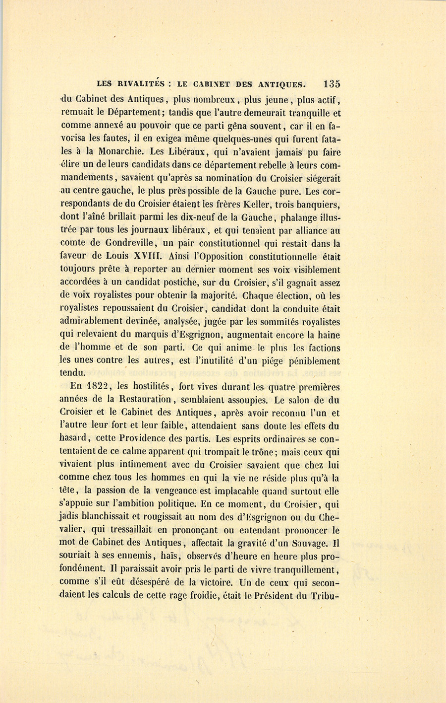 En 1822, les hostilités, fort vives durant les quatre premières années de la Restauration, semblaient assoupies. Le salon de du Croisier et le Cabinet des Antiques, après avoir reconnu l’un et l’autre leur fort et leur faible, attendaient sans doute les effets du hasard, cette Providence des partis. Les esprits ordinaires se contentaient de ce calme apparent qui trompait le trône ; mais ceux qui vivaient plus intimement avec du Croisier savaient que chez lui comme chez tous les hommes en qui la vie ne réside plus qu’à la tête, la passion de la vengeance est implacable quand surtout elle s’appuie sur l’ambition politique. En ce moment, du Croisier, qui jadis blanchissait et rougissait au nom des d’Esgrignon ou du Chevalier, qui tressaillait en prononçant ou entendant prononcer le mot de Cabinet des Antiques, affectait la gravité d’un Sauvage. Il souriait à ses ennemis, haïs, observés d’heure en heure plus profondément. Il paraissait avoir pris le parti de vivre tranquillement, comme s’il eût désespéré de la victoire. Un de ceux qui secondaient les calculs de cette rage froidie, était le Président du {p. 136} Tribunal, monsieur du Ronceret, un hobereau qui avait prétendu aux honneurs du Cabinet des Antiques sans avoir pu les obtenir.