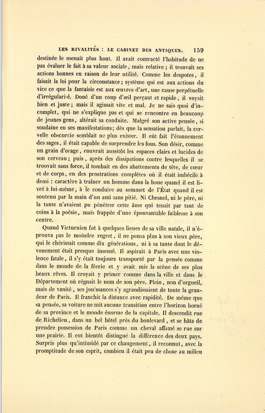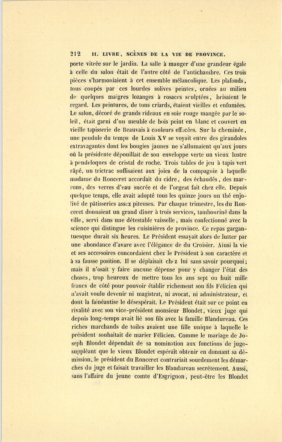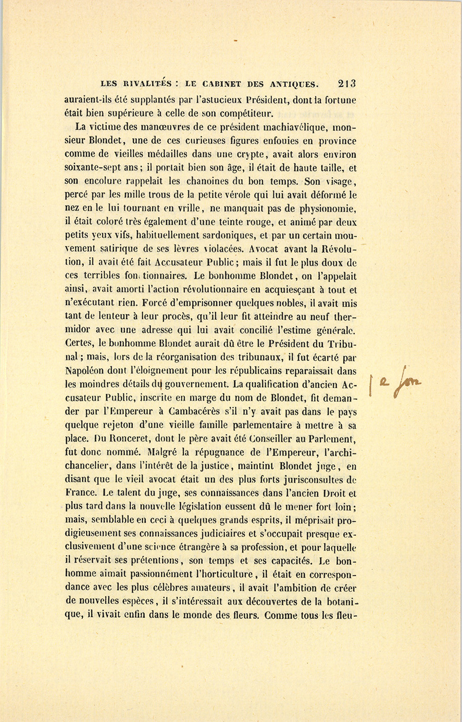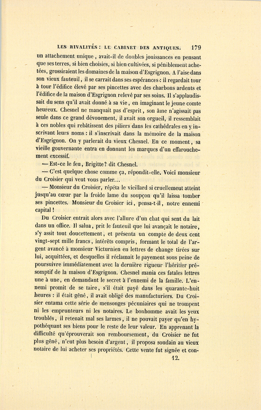 En 1822, les hostilités, fort vives durant les quatre premières années de la Restauration, semblaient assoupies. Le salon de du Croisier et le Cabinet des Antiques, après avoir reconnu l’un et l’autre leur fort et leur faible, attendaient sans doute les effets du hasard, cette Providence des partis. Les esprits ordinaires se contentaient de ce calme apparent qui trompait le trône ; mais ceux qui vivaient plus intimement avec du Croisier savaient que chez lui comme chez tous les hommes en qui la vie ne réside plus qu’à la tête, la passion de la vengeance est implacable quand surtout elle s’appuie sur l’ambition politique. En ce moment, du Croisier, qui jadis blanchissait et rougissait au nom des d’Esgrignon ou du Chevalier, qui tressaillait en prononçant ou entendant prononcer le mot de Cabinet des Antiques, affectait la gravité d’un Sauvage. Il souriait à ses ennemis, haïs, observés d’heure en heure plus profondément. Il paraissait avoir pris le parti de vivre tranquillement, comme s’il eût désespéré de la victoire. Un de ceux qui secondaient les calculs de cette rage froidie, était le Président du {p. 136} Tribunal, monsieur du Ronceret, un hobereau qui avait prétendu aux honneurs du Cabinet des Antiques sans avoir pu les obtenir.