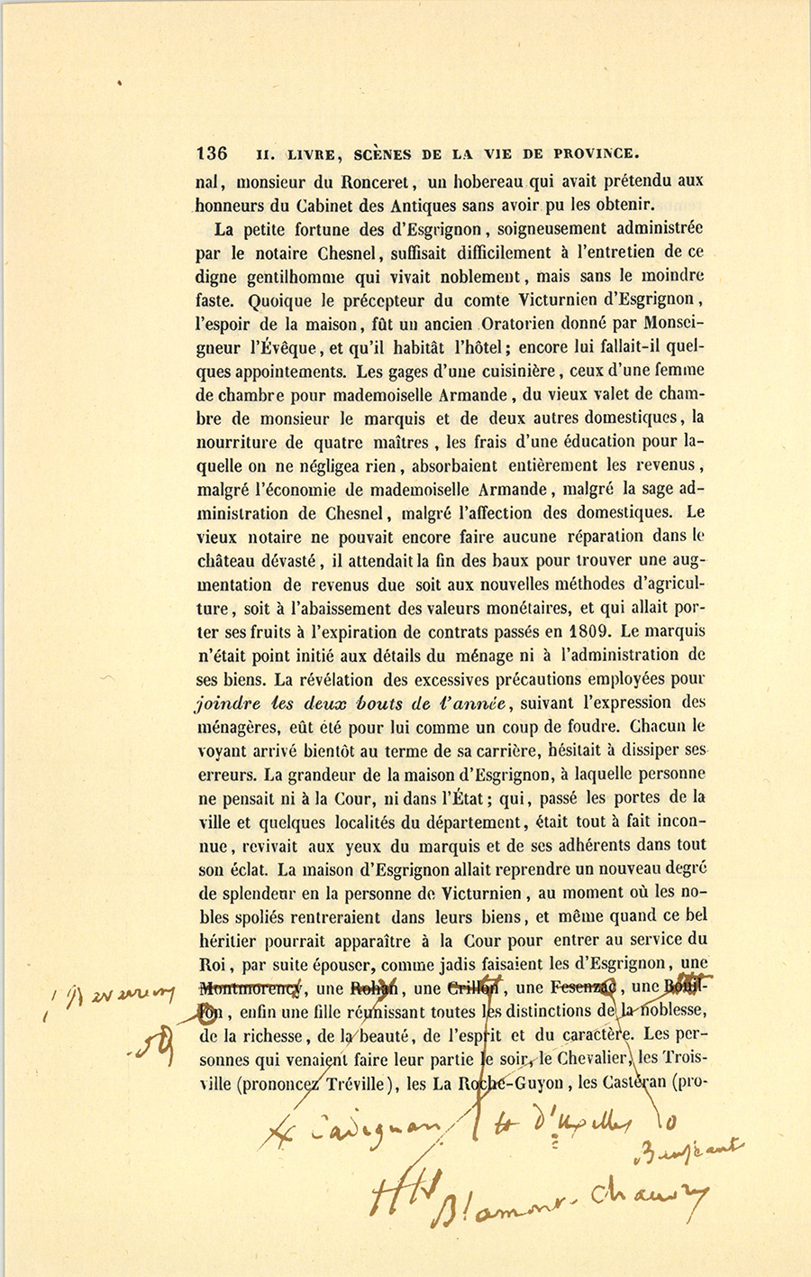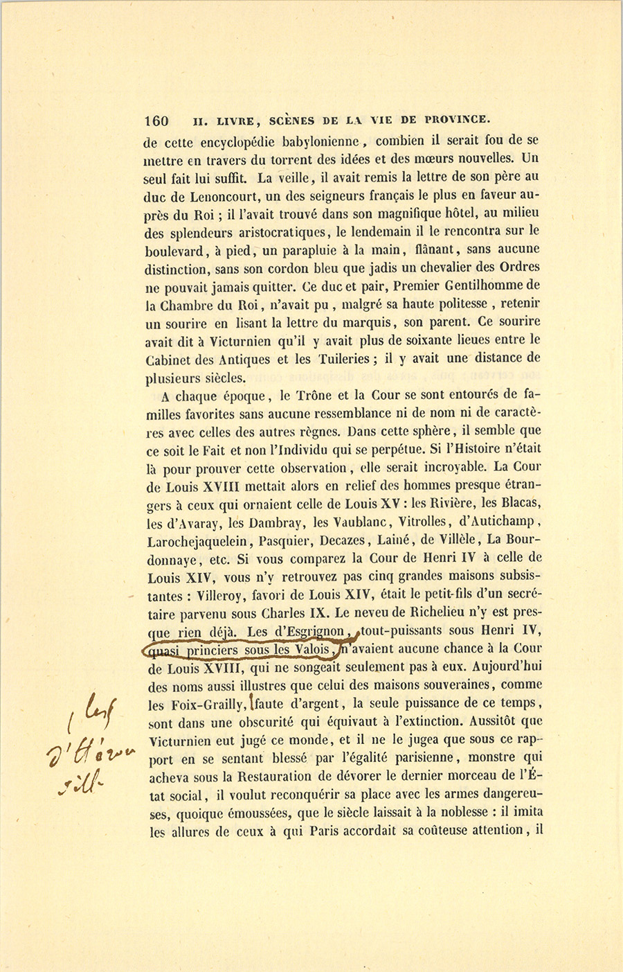 La petite fortune des d’Esgrignon, soigneusement administrée par le notaire Chesnel, suffisait difficilement à l’entretien de ce digne gentilhomme qui vivait noblement, mais sans le moindre faste. Quoique le précepteur du comte Victurnien d’Esgrignon, l’espoir de la maison, fût un ancien Oratorien donné par Monseigneur l’Évêque, et qu’il habitât l’hôtel ; encore lui fallait-il quelques appointements. Les gages d’une cuisinière, ceux d’une femme de chambre pour mademoiselle Armande, du vieux valet de chambre de monsieur le marquis et de deux autres domestiques, la nourriture de quatre maîtres, les frais d’une éducation pour laquelle on ne négligea rien, absorbaient entièrement les revenus, malgré l’économie de mademoiselle Armande, malgré la sage administration de Chesnel, malgré l’affection des domestiques. Le vieux notaire ne pouvait encore faire aucune réparation dans le château dévasté, il attendait la fin des baux pour trouver une augmentation de revenus due soit aux nouvelles méthodes d’agriculture, soit à l’abaissement des valeurs monétaires, et qui allait porter ses fruits à l’expiration de contrats passés en 1809. Le marquis n’était point initié aux détails du ménage ni à l’administration de ses biens. La révélation des excessives précautions employées pour joindre les deux bouts de l’année, suivant l’expression des ménagères, eût été pour lui comme un coup de foudre. Chacun le voyant arrivé bientôt au terme de sa carrière, hésitait à dissiper ses erreurs. La grandeur de la maison d’Esgrignon, à laquelle personne ne pensait ni à la Cour, ni dans l’État ; qui, passé les portes de la ville et quelques localités du département, était tout à fait inconnue, revivait aux yeux du marquis et de ses adhérents dans tout son éclat. La maison d’Esgrignon allait reprendre un nouveau degré de splendeur en la personne de Victurnien, au moment où les nobles spoliés rentreraient dans leurs biens, et même quand ce bel héritier pourrait apparaître à la Cour pour entrer au service du Roi, par suite épouser, comme jadis faisaient les d’Esgrignon, une Navarreins, une Cadignan, une d’Uxelles, une Beauséant, une Blamont-Chauvry, enfin une fille réunissant toutes les distinctions de la noblesse, de la richesse, de la beauté, de l’esprit et du caractère. Les personnes qui venaient faire leur partie le soir, le Chevalier, les Troisville (prononcez Tréville), les La Roche-Guyon, les Castéran {p. 137} (prononcez Catéran), le duc de Verneuil habitués depuis long-temps à considérer le grand marquis comme un immense personnage, l’entretenaient dans ses idées. Il n’y avait rien de mensonger dans cette croyance, elle eût été juste si l’on avait pu effacer les quarante dernières années de l’histoire de France. Mais les consécrations les plus respectables, les plus vraies du Droit, comme Louis XVIII avait essayé de les inscrire en datant la Charte de la vingt-et-unième année de son règne, n’existent que ratifiées par un consentement universel : il manquait aux d’Esgrignon le fond de la langue politique actuelle, l’argent, ce grand relief de l’aristocratie moderne ; il leur manquait aussi la continuation de l’historique, cette renommée qui se prend à la Cour aussi bien que sur les champs de bataille, dans les salons de la diplomatie comme à la Tribune, à l’aide d’un livre comme à propos d’une aventure, et qui est comme une Sainte-Ampoule versée sur la tête de chaque génération nouvelle. Une famille noble, inactive, oubliée est une fille sotte, laide, pauvre et sage, les quatre points cardinaux du malheur. Le mariage d’une demoiselle de Troisville avec le général Montcornet, loin d’éclairer le Cabinet des Antiques, faillit causer une rupture entre les Troisville et le salon d’Esgrignon qui déclara que les Troisville se galvaudaient.