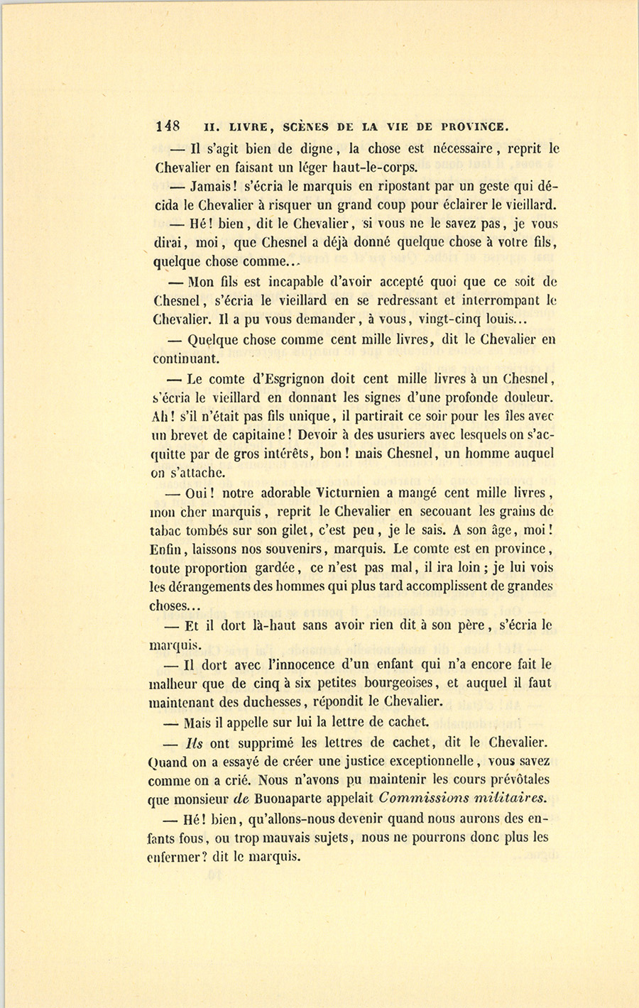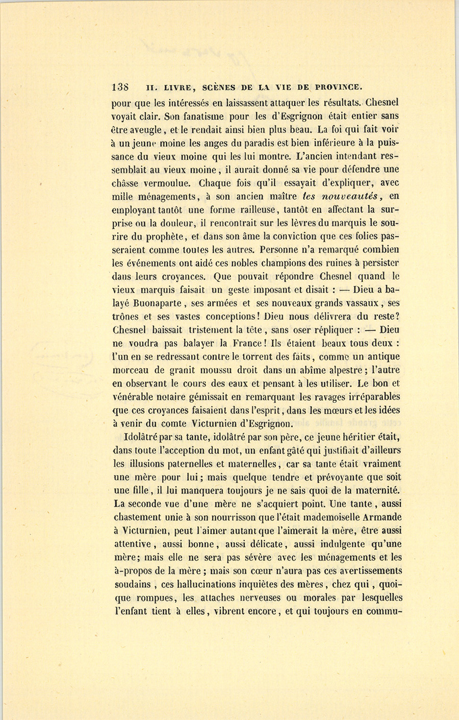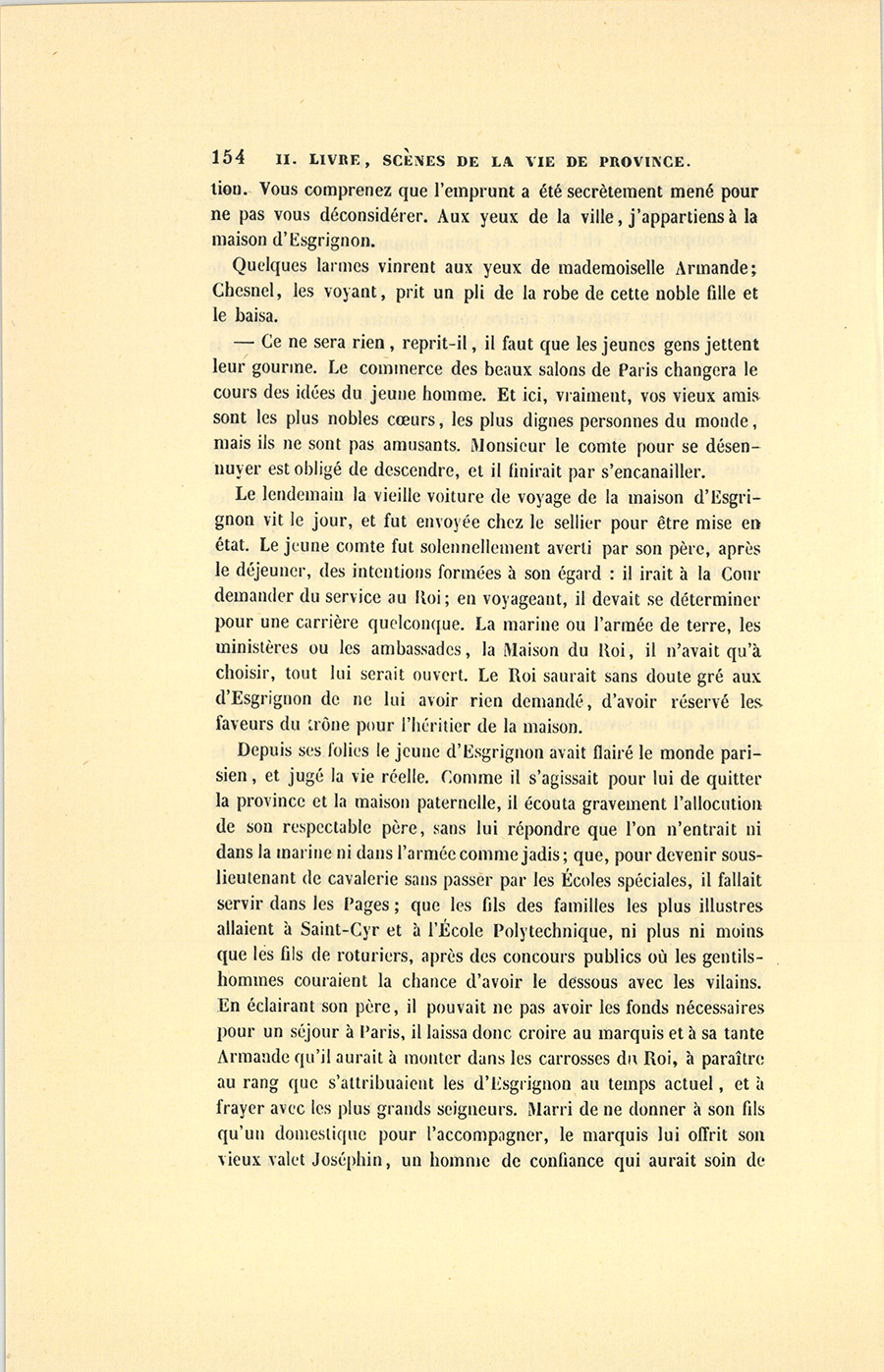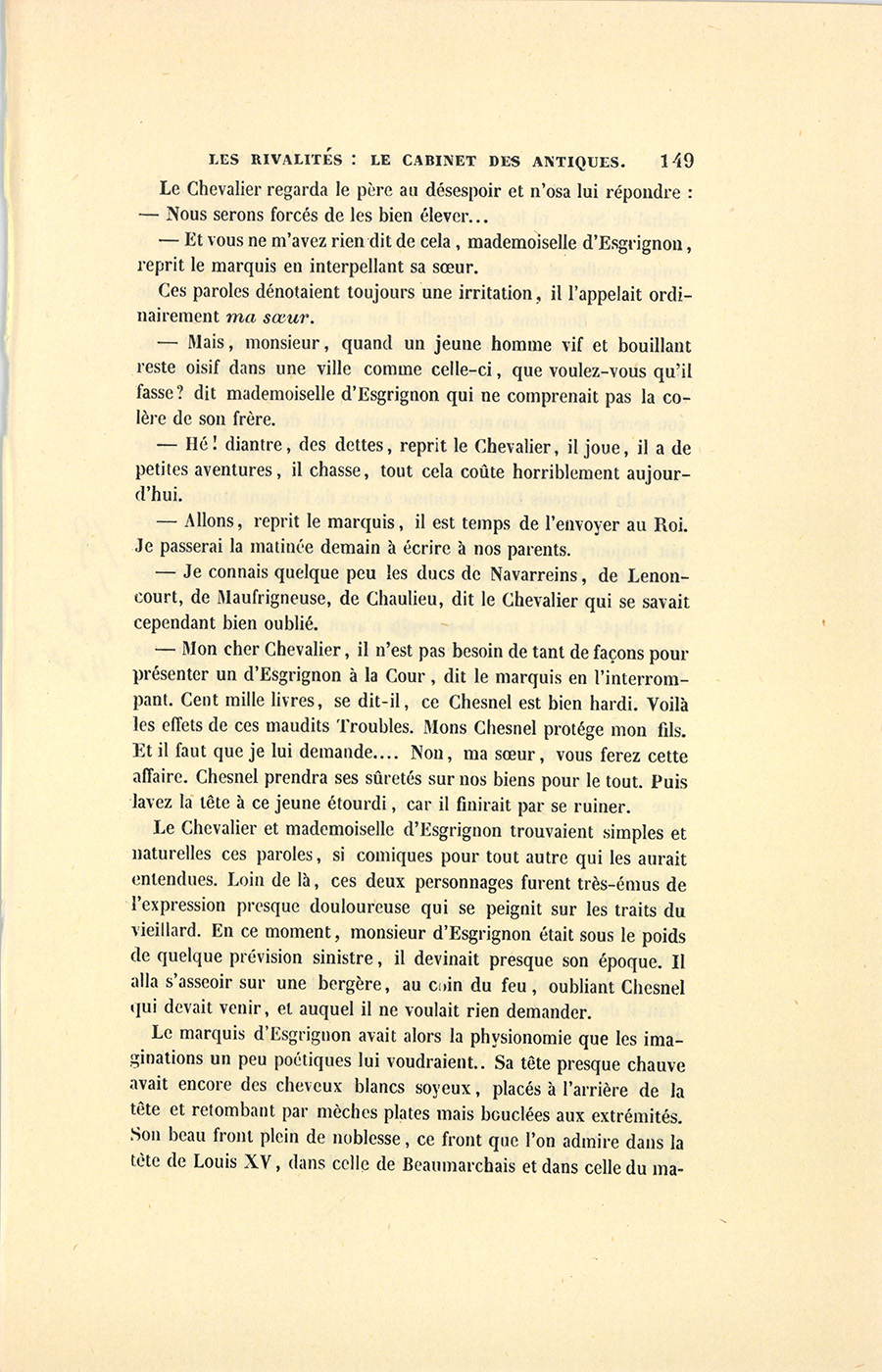 – Mon cher Chevalier, il n’est pas besoin de tant de façons pour présenter un d’Esgrignon à la Cour, dit le marquis en l’interrompant. Cent mille livres, se dit-il, ce Chesnel est bien hardi. Voilà les effets de ces maudits Troubles. Mons Chesnel protége mon fils. Et il faut que je lui demande… Non, ma sœur, vous ferez cette affaire. Chesnel prendra ses sûretés sur nos biens pour le tout. Puis lavez la tête à ce jeune étourdi, car il finirait par se ruiner.