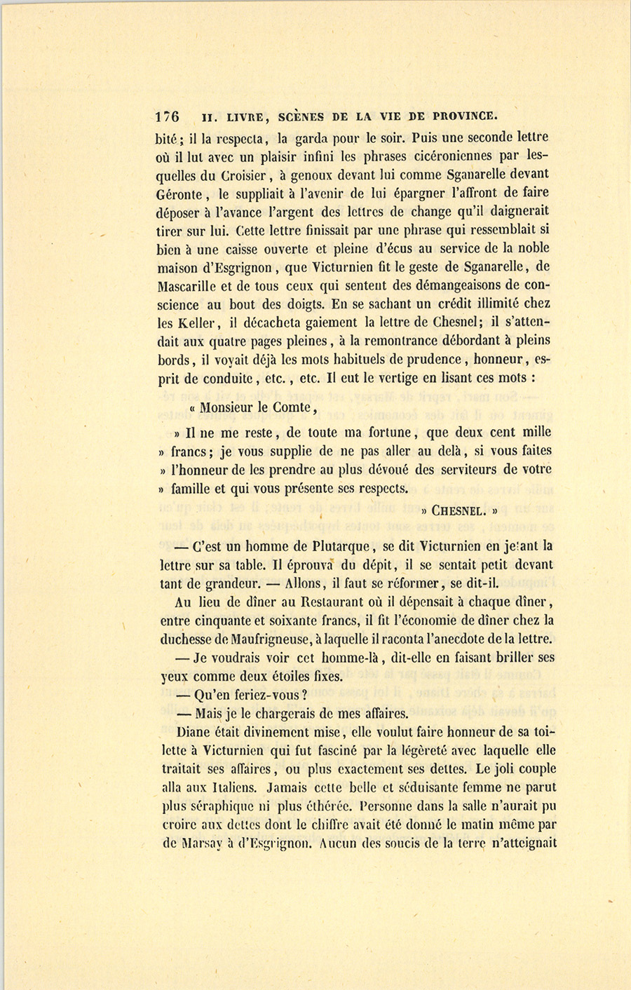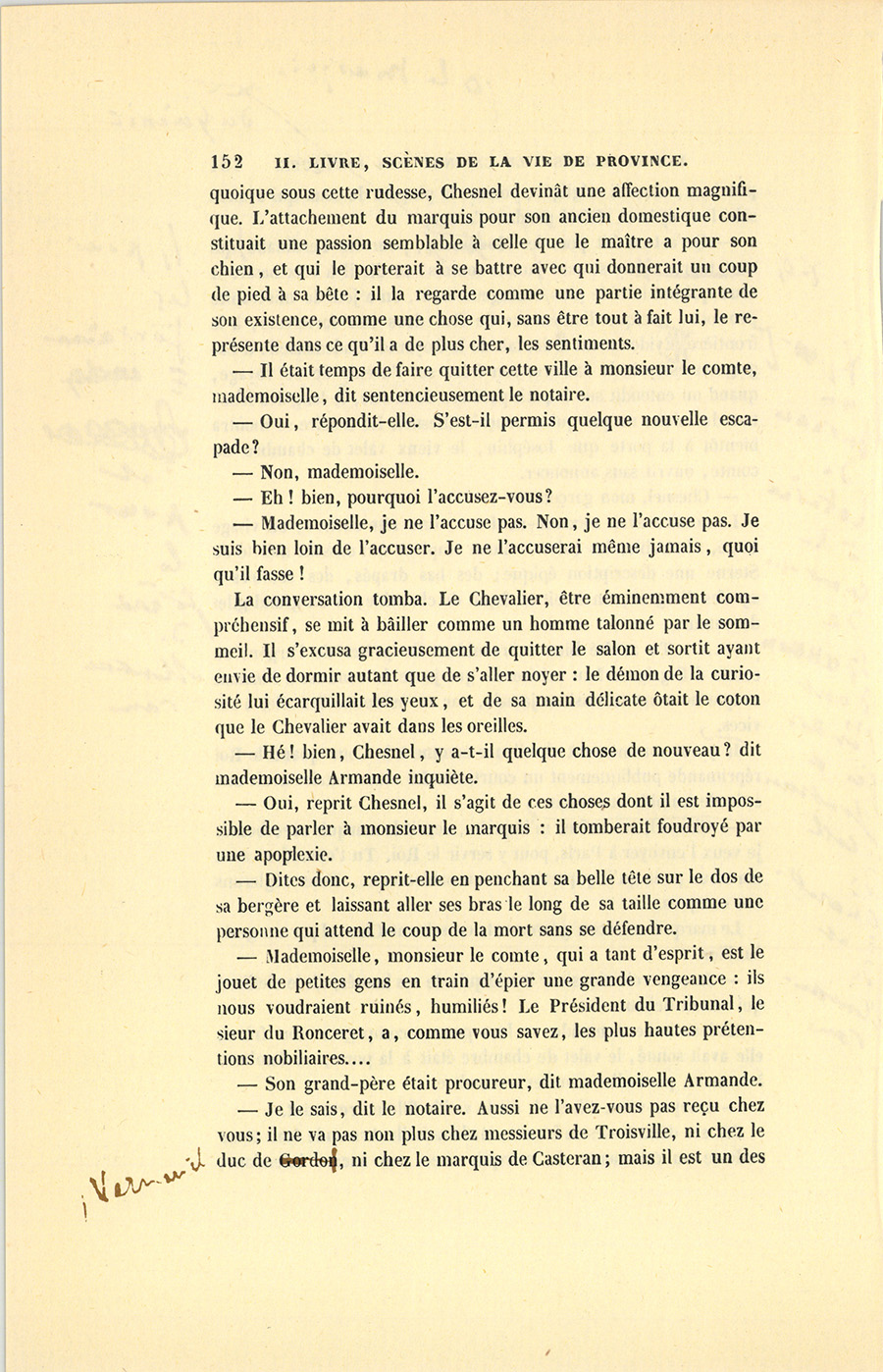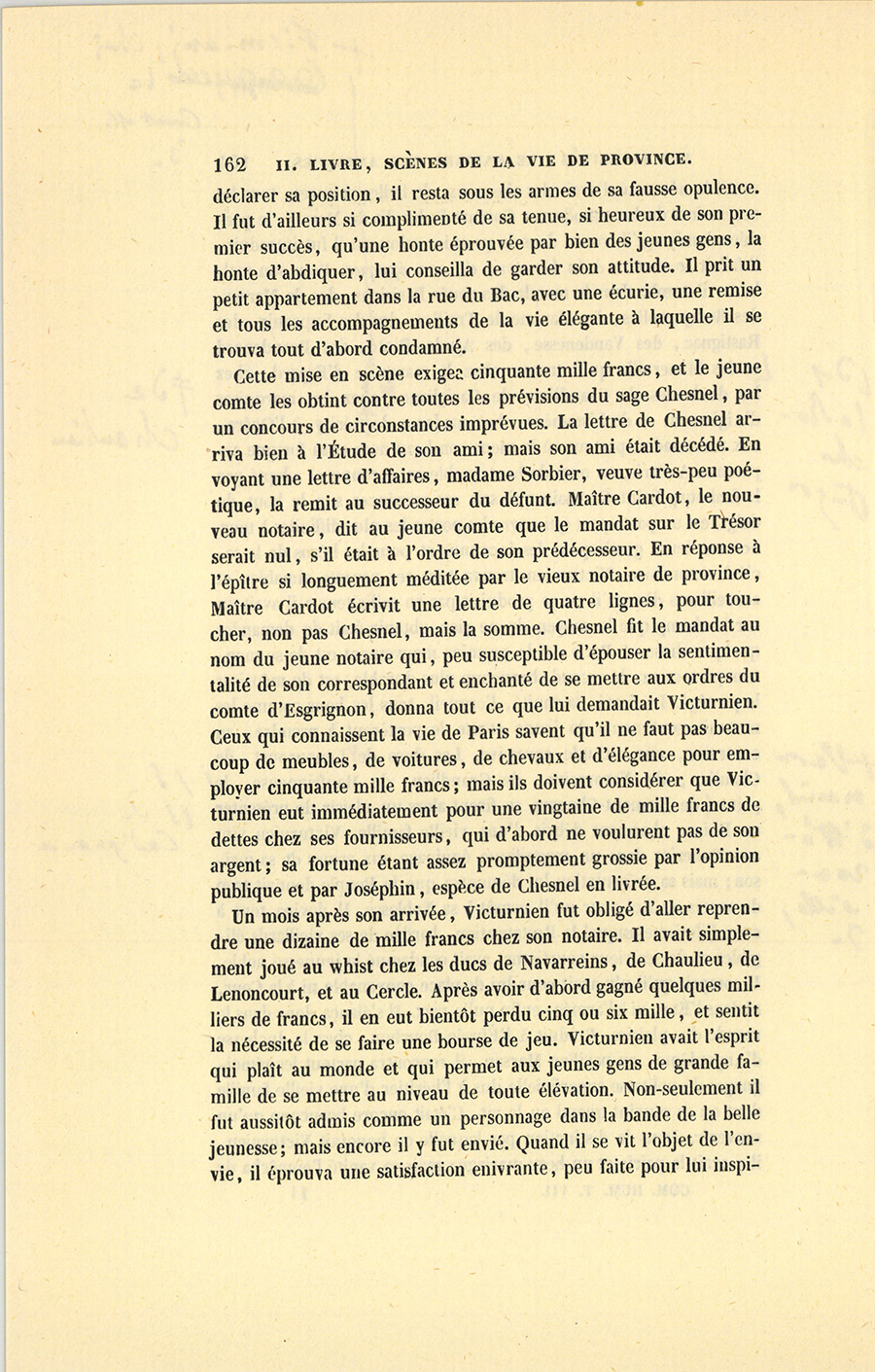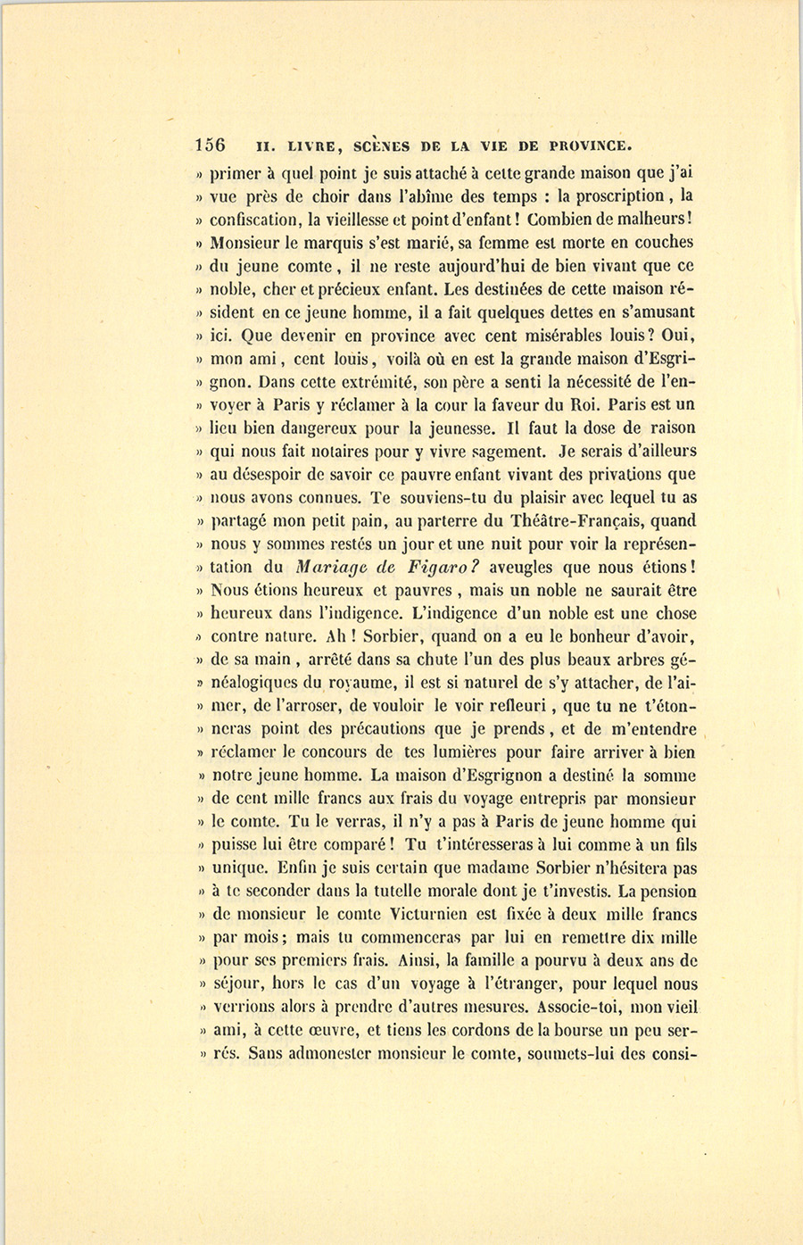 – Mon cher Chevalier, il n’est pas besoin de tant de façons pour présenter un d’Esgrignon à la Cour, dit le marquis en l’interrompant. Cent mille livres, se dit-il, ce Chesnel est bien hardi. Voilà les effets de ces maudits Troubles. Mons Chesnel protége mon fils. Et il faut que je lui demande… Non, ma sœur, vous ferez cette affaire. Chesnel prendra ses sûretés sur nos biens pour le tout. Puis lavez la tête à ce jeune étourdi, car il finirait par se ruiner.