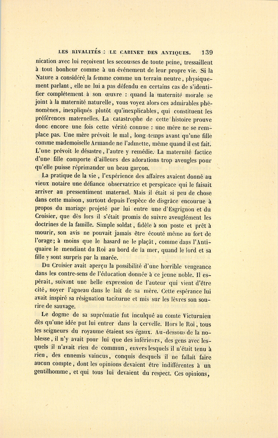Idolâtré par sa tante, idolâtré par son père, ce jeune héritier était, dans toute l’acception du mot, un enfant gâté qui justifiait d’ailleurs les illusions paternelles et maternelles, car sa tante était vraiment une mère pour lui ; mais quelque tendre et prévoyante que soit une fille, il lui manquera toujours je ne sais quoi de la maternité. La seconde vue d’une mère ne s’acquiert point. Une tante, aussi chastement unie à son nourrisson que l’était mademoiselle Armande à Victurnien, peut l’aimer autant que l’aimerait la mère, être aussi attentive, aussi bonne, aussi délicate, aussi indulgente qu’une mère ; mais elle ne sera pas sévère avec les ménagements et les à-propos de la mère ; mais son cœur n’aura pas ces avertissements soudains, ces hallucinations inquiètes des mères, chez qui, quoique rompues, les attaches nerveuses ou morales par lesquelles l’enfant tient à elles, vibrent encore, et qui toujours en {p. 139} communication avec lui reçoivent les secousses de toute peine, tressaillent à tout bonheur comme à un événement de leur propre vie. Si la Nature a considéré la femme comme un terrain neutre, physiquement parlant, elle ne lui a pas défendu en certains cas de s’identifier complétement à son œuvre : quand la maternité morale se joint à la maternité naturelle, vous voyez alors ces admirables phénomènes, inexpliqués plutôt qu’inexplicables, qui constituent les préférences maternelles. La catastrophe de cette histoire prouve donc encore une fois cette vérité connue : une mère ne se remplace pas. Une mère prévoit le mal, long-temps avant qu’une fille comme mademoiselle Armande ne l’admette, même quand il est fait. L’une prévoit le désastre, l’autre y remédie. La maternité factice d’une fille comporte d’ailleurs des adorations trop aveugles pour qu’elle puisse réprimander un beau garçon.