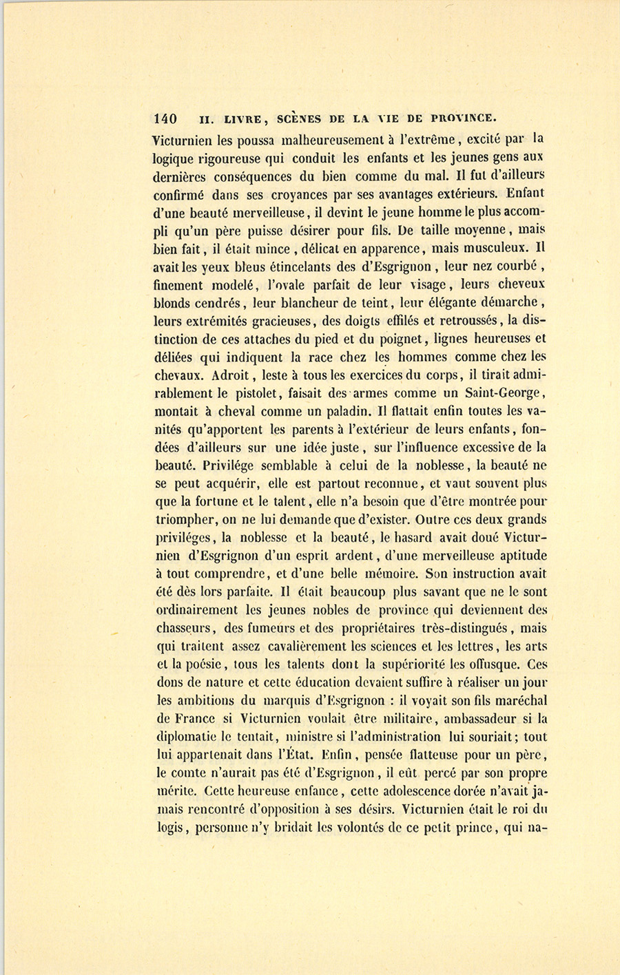 Le dogme de sa suprématie fut inculqué au comte Victurnien dès qu’une idée put lui entrer dans la cervelle. Hors le Roi, tous les seigneurs du royaume étaient ses égaux. Au-dessous de la noblesse, il n’y avait pour lui que des inférieurs, des gens avec lesquels il n’avait rien de commun, envers lesquels il n’était tenu à rien, des ennemis vaincus, conquis desquels il ne fallait faire aucun compte, dont les opinions devaient être indifférentes à un gentilhomme, et qui tous lui devaient du respect. Ces opinions, {p. 140} Victurnien les poussa malheureusement à l’extrême, excité par la logique rigoureuse qui conduit les enfants et les jeunes gens aux dernières conséquences du bien comme du mal. Il fut d’ailleurs confirmé dans ses croyances par ses avantages extérieurs. Enfant d’une beauté merveilleuse, il devint le jeune homme le plus accompli qu’un père puisse désirer pour fils. De taille moyenne, mais bien fait, il était mince, délicat en apparence, mais musculeux. Il avait les yeux bleus étincelants des d’Esgrignon, leur nez courbé, finement modelé, l’ovale parfait de leur visage, leurs cheveux blond cendré3, leur blancheur de teint, leur élégante démarche, leurs extrémités gracieuses, des doigts effilés et retroussés, la distinction de ces attaches du pied et du poignet, lignes heureuses et déliées qui indiquent la race chez les hommes comme chez les chevaux. Adroit, leste à tous les exercices du corps, il tirait admirablement le pistolet, faisait des armes comme un Saint-Georges4, montait à cheval comme un paladin. Il flattait enfin toutes les vanités qu’apportent les parents à l’extérieur de leurs enfants, fondées d’ailleurs sur une idée juste, sur l’influence excessive de la beauté. Privilége semblable à celui de la noblesse, la beauté ne se peut acquérir, elle est partout reconnue, et vaut souvent plus que la fortune et le talent, elle n’a besoin que d’être montrée pour triompher, on ne lui demande que d’exister. Outre ces deux grands priviléges, la noblesse et la beauté, le hasard avait doué Victurnien d’Esgrignon d’un esprit ardent, d’une merveilleuse aptitude à tout comprendre, et d’une belle mémoire. Son instruction avait été dès lors parfaite. Il était beaucoup plus savant que ne le sont ordinairement les jeunes nobles de province qui deviennent des chasseurs, des fumeurs et des propriétaires très-distingués, mais qui traitent assez cavalièrement les sciences et les lettres, les arts et la poésie, tous les talents dont la supériorité les offusque. Ces dons de nature et cette éducation devaient suffire à réaliser un jour les ambitions du marquis d’Esgrignon : il voyait son fils maréchal de France si Victurnien voulait être militaire, ambassadeur si la diplomatie le tentait, ministre si l’administration lui souriait ; tout lui appartenait dans l’État. Enfin, pensée flatteuse pour un père, le comte n’aurait pas été d’Esgrignon, il eût percé par son propre mérite. Cette heureuse enfance, cette adolescence dorée n’avait jamais rencontré d’opposition à ses désirs. Victurnien était le roi du logis, personne n’y bridait les volontés de ce petit prince, qui {p. 141} naturellement devint égoïste comme un prince, entier comme le plus fougueux cardinal du moyen-âge, impertinent et audacieux, vices que chacun divinisait en y voyant les qualités essentielles au noble.