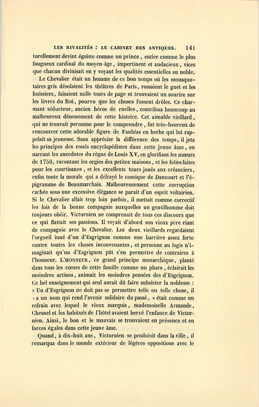 Le Chevalier était un homme de ce bon temps où les mousquetaires gris désolaient les théâtres de Paris, rossaient le guet et les huissiers, faisaient mille tours de page et trouvaient un sourire sur les lèvres du Roi, pourvu que les choses fussent drôles. Ce charmant séducteur, ancien héros de ruelles, contribua beaucoup au malheureux dénouement de cette histoire. Cet aimable vieillard, qui ne trouvait personne pour le comprendre, fut très-heureux de rencontrer cette adorable figure de Faublas en herbe qui lui rappelait sa jeunesse. Sans apprécier la différence des temps, il jeta les principes des roués encyclopédistes dans cette jeune âme, en narrant les anecdotes du règne de Louis XV, en glorifiant les mœurs de 1750, racontant les orgies des petites maisons, et les folies faites pour les courtisanes, et les excellents tours joués aux créanciers, enfin toute la morale qui a défrayé le comique de Dancourt et l’épigramme de Beaumarchais. Malheureusement cette corruption cachée sous une excessive élégance se parait d’un esprit voltairien. Si le Chevalier allait trop loin parfois, il mettait comme correctif les lois de la bonne compagnie auxquelles un gentilhomme doit toujours obéir. Victurnien ne comprenait de tous ces discours que ce qui flattait ses passions. Il voyait d’abord son vieux père riant de compagnie avec le Chevalier. Les deux vieillards regardaient l’orgueil inné d’un d’Esgrignon comme une barrière assez forte contre toutes les choses inconvenantes, et personne au logis n’imaginait qu’un d’Esgrignon pût s’en permettre de contraires à l’honneur. L’honneur, ce grand principe monarchique, planté dans tous les cœurs de cette famille comme un phare, éclairait les moindres actions, animait les moindres pensées des d’Esgrignon. Ce bel enseignement qui seul aurait dû faire subsister la noblesse : « Un d’Esgrignon ne doit pas se permettre telle ou telle chose, il a un nom qui rend l’avenir solidaire du passé », était comme un refrain avec lequel le vieux marquis, mademoiselle Armande, Chesnel et les habitués de l’hôtel avaient bercé l’enfance de Victurnien. Ainsi, le bon et le mauvais se trouvaient en présence et en forces égales dans cette jeune âme.