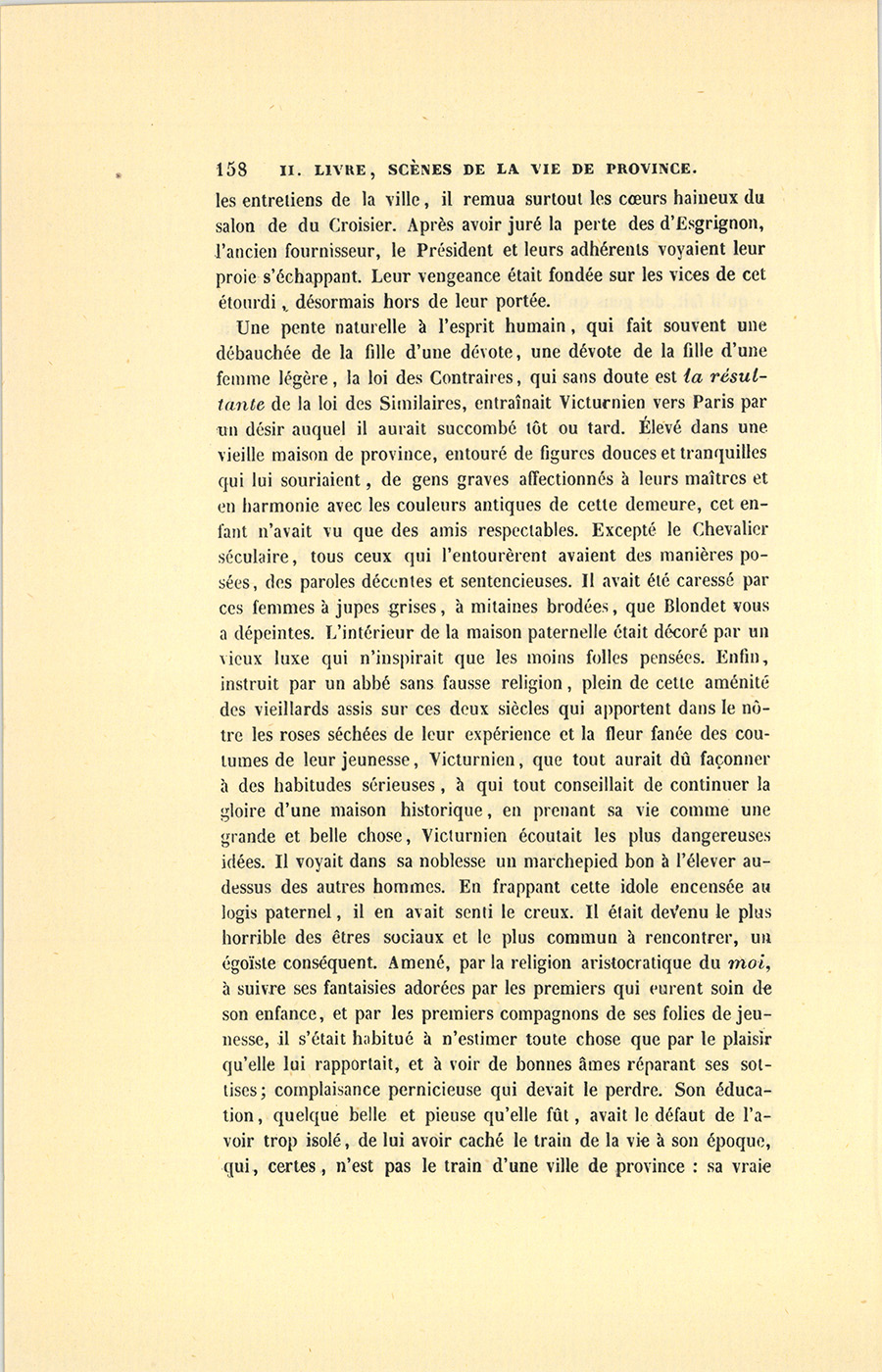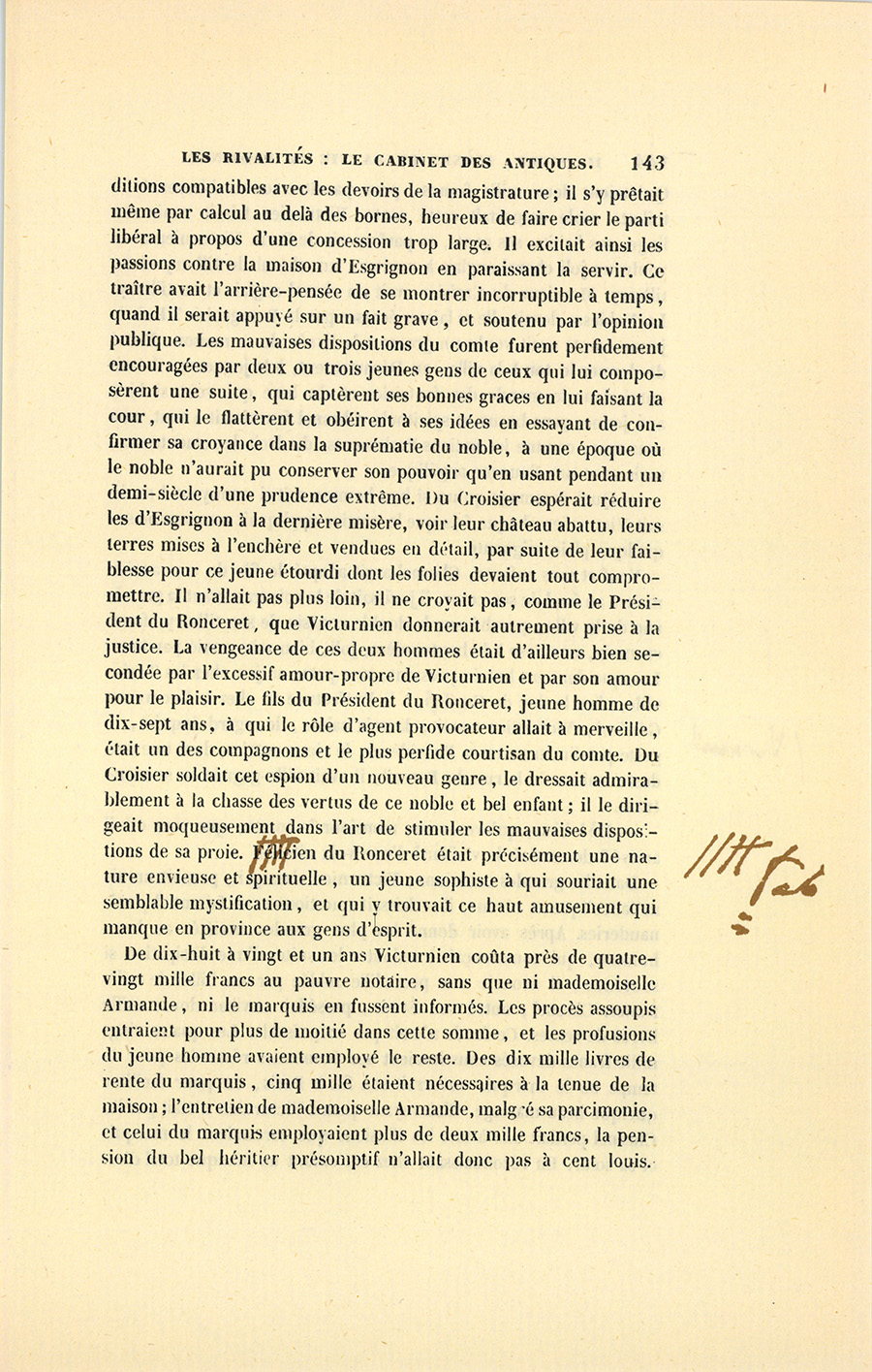 Quand, à dix-huit ans, Victurnien se produisit dans la ville, il remarqua dans le monde extérieur de légères oppositions avec le {p. 142} monde intérieur de l’hôtel d’Esgrignon, mais il n’en chercha point les causes. Les causes étaient à Paris. Il ne savait pas encore que les personnes, si hardies en pensée et en discours le soir chez son père, étaient très-circonspectes en présence des ennemis avec lesquels leurs intérêts les obligeaient de frayer. Son père avait conquis son franc parler. Personne ne songeait à contredire un vieillard de soixante-dix ans, et d’ailleurs tout le monde passait volontiers à un homme violemment dépouillé, sa fidélité à l’ancien ordre de choses. Trompé par les apparences, Victurnien se conduisit de manière à se mettre à dos toute la bourgeoisie de la ville. Il eut à la chasse des difficultés poussées un peu trop loin par son impétuosité, qui se terminèrent par des procès graves, étouffés à prix d’argent par Chesnel, et desquels on n’osait parler au marquis. Jugez de son étonnement si le marquis d’Esgrignon eût appris que son fils était poursuivi pour avoir chassé sur ses terres, dans ses domaines, dans ses forêts, sous le règne d’un fils de saint Louis ! On craignait trop ce qui pouvait s’ensuivre pour l’initier à ces misères, disait Chesnel. Le jeune comte se permit en ville quelques autres escapades, traitées d’amourettes par le Chevalier, mais qui finirent par coûter à Chesnel des dots données à des jeunes filles séduites par d’imprudentes promesses de mariage : autres procès, nommés dans le Code, détournements de mineures ; lesquels, par suite de la brutalité de la nouvelle justice, eussent conduit on ne sait où le jeune comte, sans la prudente intervention de Chesnel. Ces victoires sur la justice bourgeoise enhardissaient Victurnien. Habitué à se tirer de ces mauvais pas, le jeune comte ne reculait point devant une plaisanterie. Il regardait les tribunaux comme des épouvantails à peuple qui n’avaient point prise sur lui. Ce qu’il eût blâmé chez les roturiers était un excusable amusement pour lui. Cette conduite, ce caractère, cette pente à mépriser les lois nouvelles pour n’obéir qu’aux maximes du code noble, furent étudiés, analysés, éprouvés par quelques personnes habiles appartenant au parti du Croisier. Ces gens s’en appuyèrent pour faire croire au peuple que les calomnies du libéralisme étaient des révélations, et que le retour à l’ancien ordre de choses dans toute sa pureté, se trouvait au fond de la politique ministérielle. Quel bonheur, pour eux, d’avoir une semi-preuve de leurs assertions ! Le Président du Ronceret se prêtait admirablement, aussi bien que le Procureur du Roi, à toutes les {p. 143} conditions compatibles avec les devoirs de la magistrature ; il s’y prêtait même par calcul au delà des bornes, heureux de faire crier le parti libéral à propos d’une concession trop large. Il excitait ainsi les passions contre la maison d’Esgrignon en paraissant la servir. Ce traître avait l’arrière-pensée de se montrer incorruptible à temps, quand il serait appuyé sur un fait grave, et soutenu par l’opinion publique. Les mauvaises dispositions du comte furent perfidement encouragées par deux ou trois jeunes gens de ceux qui lui composèrent une suite, qui captèrent ses bonnes grâces5 en lui faisant la cour, qui le flattèrent et obéirent à ses idées en essayant de confirmer sa croyance dans la suprématie du noble, à une époque où le noble n’aurait pu conserver son pouvoir qu’en usant pendant un demi-siècle d’une prudence extrême. Du Croisier espérait réduire les d’Esgrignon à la dernière misère, voir leur château abattu, leurs terres mises à l’enchère et vendues en détail, par suite de leur faiblesse pour ce jeune étourdi dont les folies devaient tout compromettre. Il n’allait pas plus loin, il ne croyait pas, comme le Président du Ronceret, que Victurnien donnerait autrement prise à la justice. La vengeance de ces deux hommes était d’ailleurs bien secondée par l’excessif amour-propre de Victurnien et par son amour pour le plaisir. Le fils du Président du Ronceret, jeune homme de dix-sept ans, à qui le rôle d’agent provocateur allait à merveille, était un des compagnons et le plus perfide courtisan du comte. Du Croisier soldait cet espion d’un nouveau genre, le dressait admirablement à la chasse des vertus de ce noble et bel enfant ; il le dirigeait moqueusement dans l’art de stimuler les mauvaises dispositions de sa proie. Fabien du Ronceret était précisément une nature envieuse et spirituelle, un jeune sophiste à qui souriait une semblable mystification, et qui y trouvait ce haut amusement qui manque en province aux gens d’esprit.