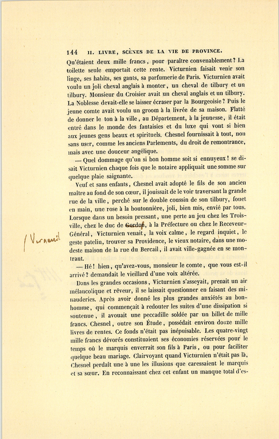 De dix-huit à vingt et un ans Victurnien coûta près de quatre-vingt mille francs au pauvre notaire, sans que ni mademoiselle Armande, ni le marquis en fussent informés. Les procès assoupis entraient pour plus de moitié dans cette somme, et les profusions du jeune homme avaient employé le reste. Des dix mille livres de rente du marquis, cinq mille étaient nécessaires à la tenue de la maison ; l’entretien de mademoiselle Armande, malgré sa parcimonie, et celui du marquis employaient plus de deux mille francs, la pension du bel héritier présomptif n’allait donc pas à cent louis. {p. 144} Qu’étaient deux mille francs, pour paraître convenablement ? La toilette seule emportait cette rente. Victurnien faisait venir son linge, ses habits, ses gants, sa parfumerie de Paris. Victurnien avait voulu un joli cheval anglais à monter, un cheval de tilbury et un tilbury. Monsieur du Croisier avait un cheval anglais et un tilbury. La Noblesse devait-elle se laisser écraser par la Bourgeoisie ? Puis le jeune comte avait voulu un groom à la livrée de sa maison. Flatté de donner le ton à la ville, au Département, à la jeunesse, il était entré dans le monde des fantaisies et du luxe qui vont si bien aux jeunes gens beaux et spirituels. Chesnel fournissait à tout, non sans user, comme les anciens Parlements, du droit de remontrance, mais avec une douceur angélique.