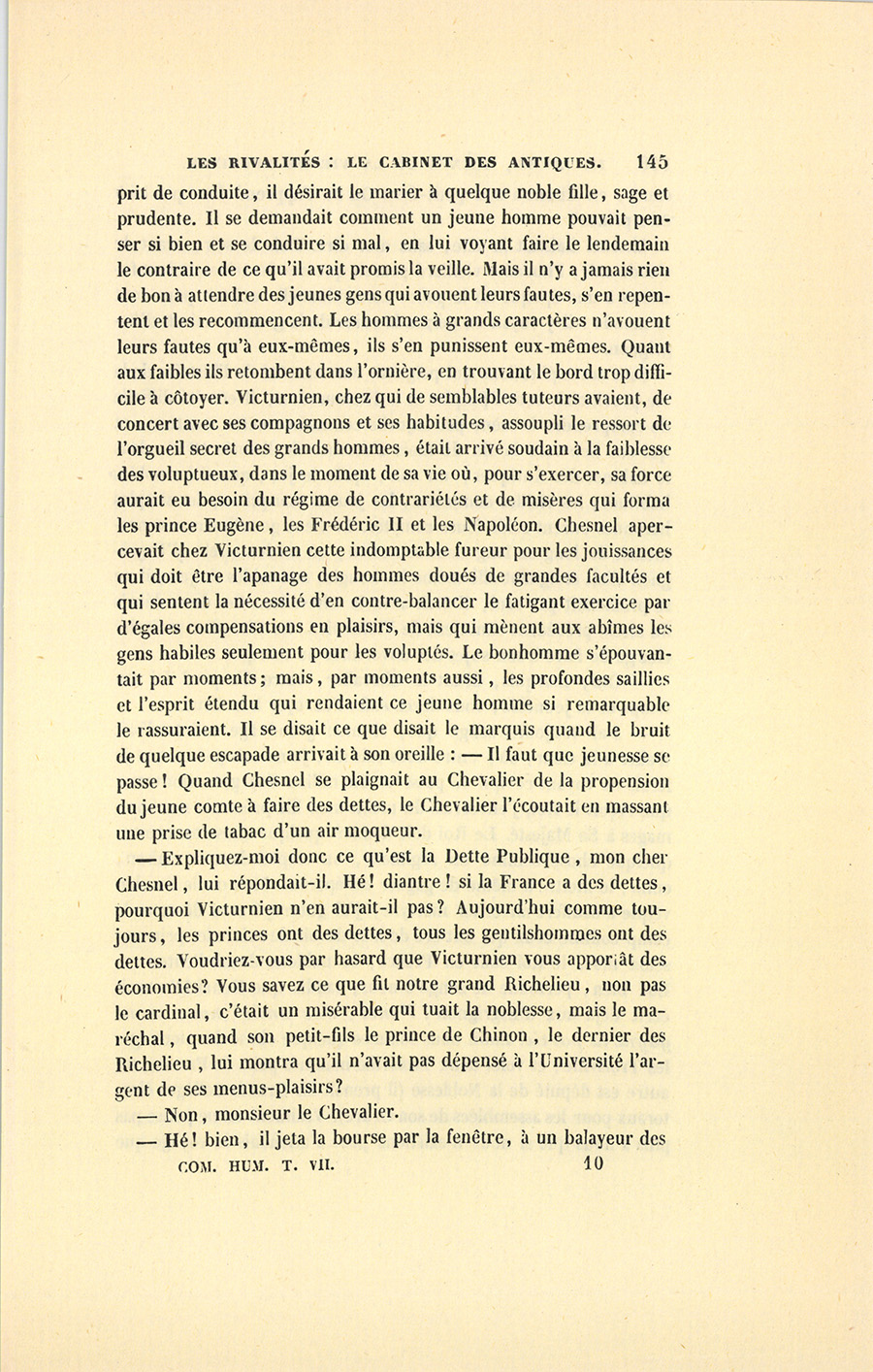 – Expliquez-moi donc ce qu’est la Dette Publique, mon cher Chesnel, lui répondait-il. Hé ! diantre ! si la France a des dettes, pourquoi Victurnien n’en aurait-il pas ? Aujourd’hui comme toujours, les princes ont des dettes, tous les gentilshommes ont des dettes. Voudriez-vous par hasard que Victurnien vous apportât des économies ? Vous savez ce que fit notre grand Richelieu, non pas le cardinal, c’était un misérable qui tuait la noblesse, mais le maréchal, quand son petit-fils le prince de Chinon, le dernier des Richelieu, lui montra qu’il n’avait pas dépensé à l’Université l’argent de ses menus-plaisirs ?