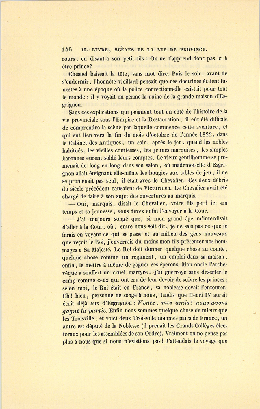 – J’ai toujours songé que, si mon grand âge m’interdisait d’aller à la Cour, où, entre nous soit dit, je ne sais pas ce que je ferais en voyant ce qui se passe et au milieu des gens nouveaux que reçoit le Roi, j’enverrais du moins mon fils présenter nos hommages à Sa Majesté. Le Roi doit donner quelque chose au comte, quelque chose comme un régiment, un emploi dans sa maison, enfin, le mettre à même de gagner ses éperons. Mon oncle l’archevêque a souffert un cruel martyre, j’ai guerroyé sans déserter le camp comme ceux qui ont cru de leur devoir de suivre les princes : selon moi, le Roi était en France, sa noblesse devait l’entourer. Eh ! bien, personne ne songe à nous, tandis que Henri IV aurait écrit déjà aux d’Esgrignon : Venez, mes amis ! nous avons gagné la partie. Enfin nous sommes quelque chose de mieux que les Troisville, et voici deux Troisville nommés pairs de France, un autre est député de la Noblesse (il prenait les Grands Colléges électoraux pour les assemblées de son ordre). Vraiment on ne pense pas plus à nous que si nous n’existions pas ! J’attendais le voyage que {p. 147} les princes devaient faire par ici ; mais les princes ne viennent pas à nous, il faut donc aller à eux…
