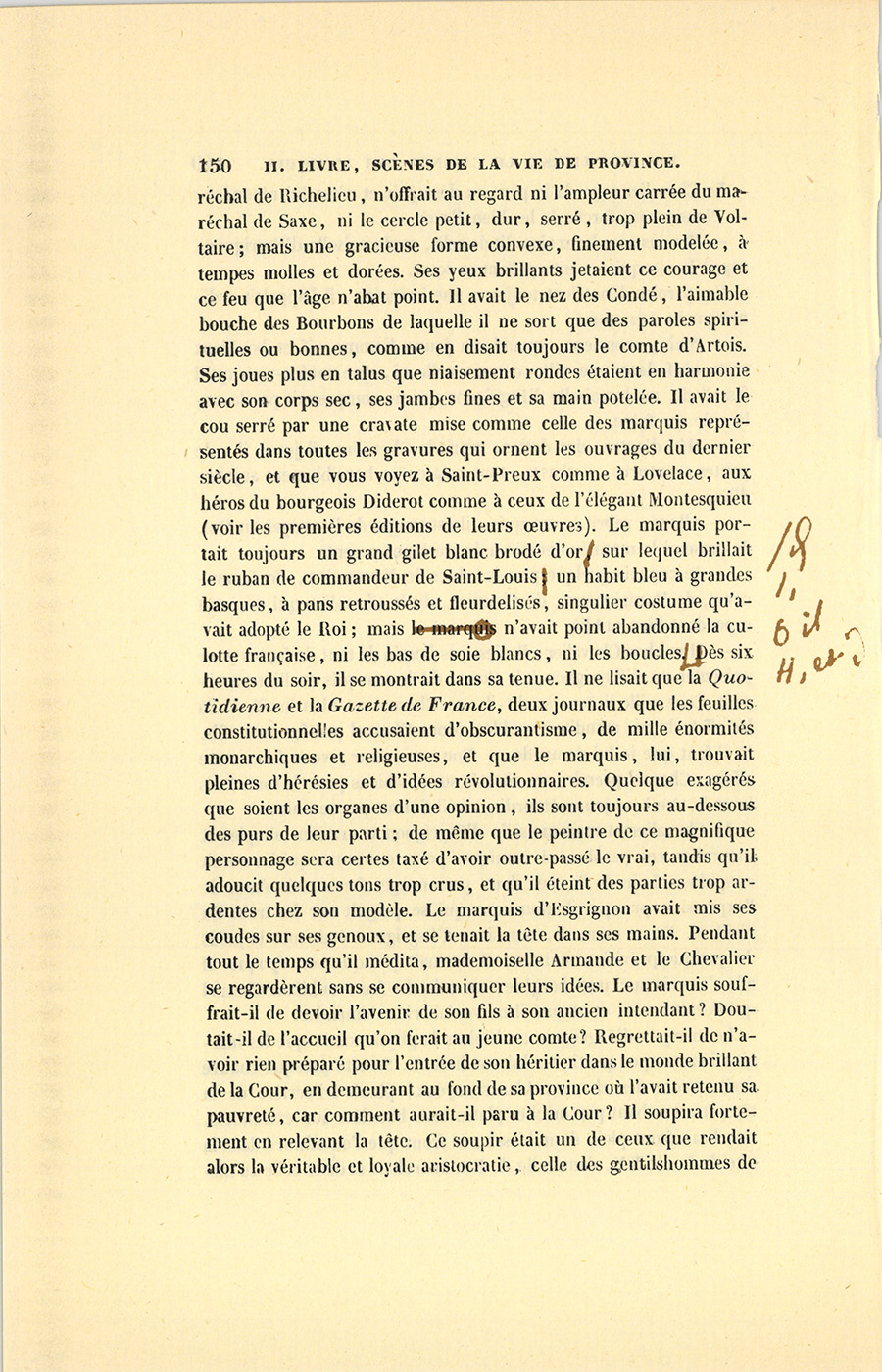 Le marquis d’Esgrignon avait alors la physionomie que les imaginations un peu poétiques lui voudraient. Sa tête presque chauve avait encore des cheveux blancs soyeux, placés à l’arrière de la tête et retombant par mèches plates mais bouclées aux extrémités. Son beau front plein de noblesse, ce front que l’on admire dans la tête de Louis XV, dans celle de Beaumarchais et dans celle du {p. 150} maréchal de Richelieu, n’offrait au regard ni l’ampleur carrée du maréchal de Saxe, ni le cercle petit, dur, serré, trop plein de Voltaire ; mais une gracieuse forme convexe, finement modelée, à tempes molles et dorées. Ses yeux brillants jetaient ce courage et ce feu que l’âge n’abat point. Il avait le nez des Condé, l’aimable bouche des Bourbons de laquelle il ne sort que des paroles spirituelles ou bonnes, comme en disait toujours le comte d’Artois. Ses joues plus en talus que niaisement rondes étaient en harmonie avec son corps sec, ses jambes fines et sa main potelée. Il avait le cou serré par une cravate mise comme celle des marquis représentés dans toutes les gravures qui ornent les ouvrages du dernier siècle, et que vous voyez à Saint-Preux comme à Lovelace, aux héros du bourgeois Diderot comme à ceux de l’élégant Montesquieu (voir les premières éditions de leurs œuvres). Le marquis portait toujours un grand gilet blanc brodé d’or sur lequel brillait le ruban de commandeur de Saint-Louis, un habit bleu à grandes basques, à pans retroussés et fleurdelisés, singulier costume qu’avait adopté le Roi ; mais il n’avait point abandonné la culotte française, ni les bas de soie blancs, ni les boucles, et dès six heures du soir, il se montrait dans sa tenue. Il ne lisait que la Quotidienne et la Gazette de France, deux journaux que les feuilles constitutionnelles accusaient d’obscurantisme, de mille énormités monarchiques et religieuses, et que le marquis, lui, trouvait pleines d’hérésies et d’idées révolutionnaires. Quelque exagérés que soient les organes d’une opinion, ils sont toujours au-dessous des purs de leur parti ; de même que le peintre de ce magnifique personnage sera certes taxé d’avoir outre-passé le vrai, tandis qu’il adoucit quelques tons trop crus, et qu’il éteint des parties trop ardentes chez son modèle. Le marquis d’Esgrignon avait mis ses coudes sur ses genoux, et se tenait la tête dans ses mains. Pendant tout le temps qu’il médita, mademoiselle Armande et le Chevalier se regardèrent sans se communiquer leurs idées. Le marquis souffrait-il de devoir l’avenir de son fils à son ancien intendant ? Doutait-il de l’accueil qu’on ferait au jeune comte ? Regrettait-il de n’avoir rien préparé pour l’entrée de son héritier dans le monde brillant de la Cour, en demeurant au fond de sa province où l’avait retenu sa pauvreté, car comment aurait-il paru à la Cour ? Il soupira fortement en relevant la tête. Ce soupir était un de ceux que rendait alors la véritable et loyale aristocratie, celle des gentilshommes de {p. 151} province, alors si négligés, comme la plupart de ceux qui avaient saisi leur épée et résisté pendant l’orage.