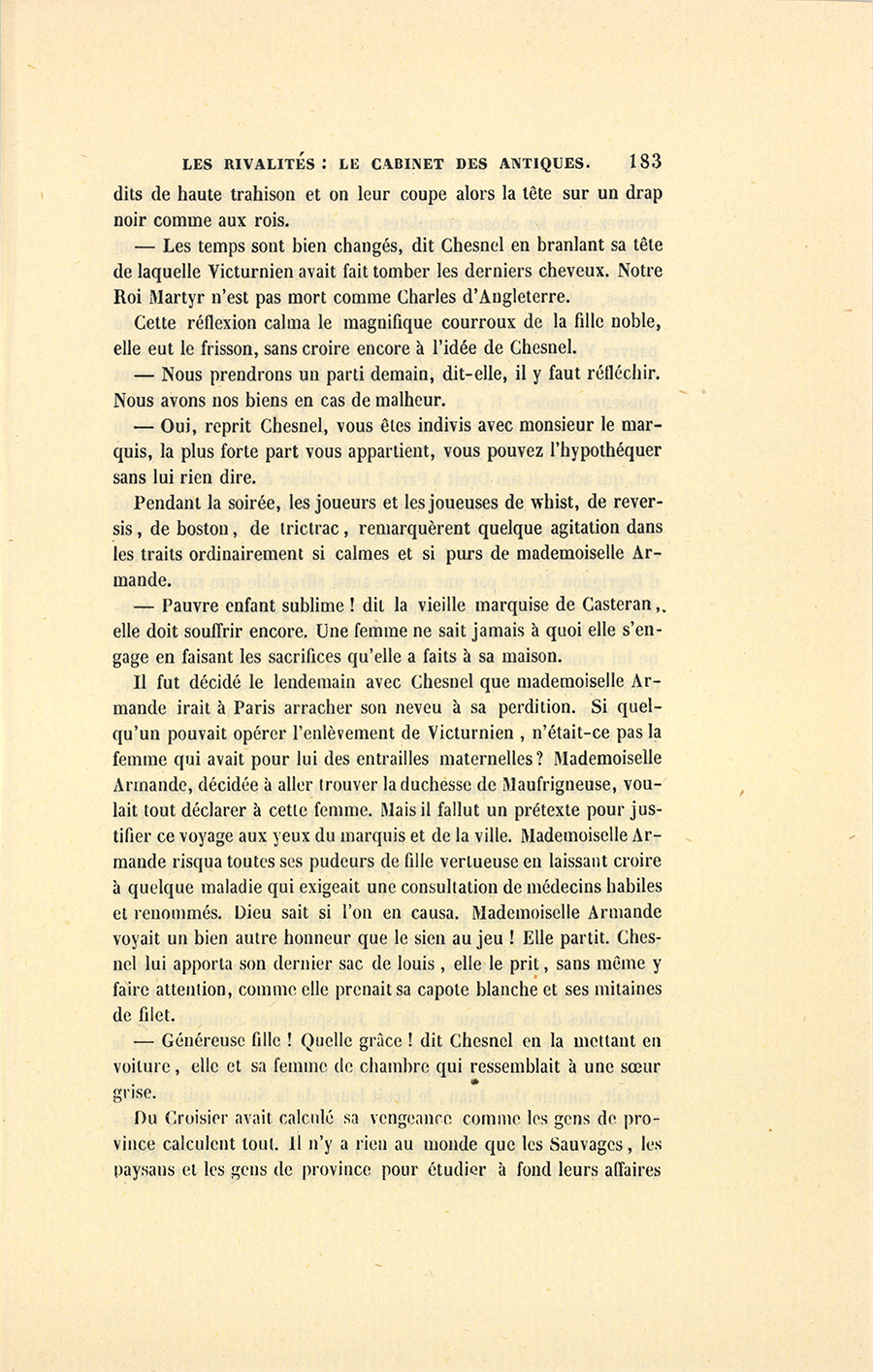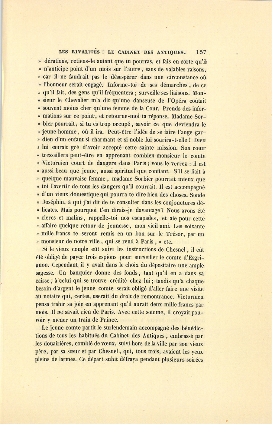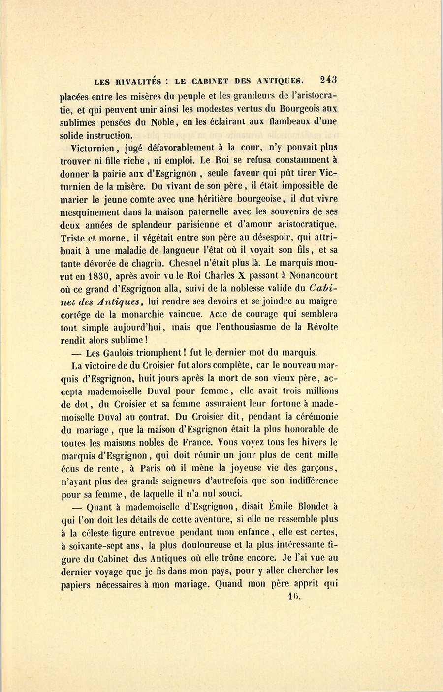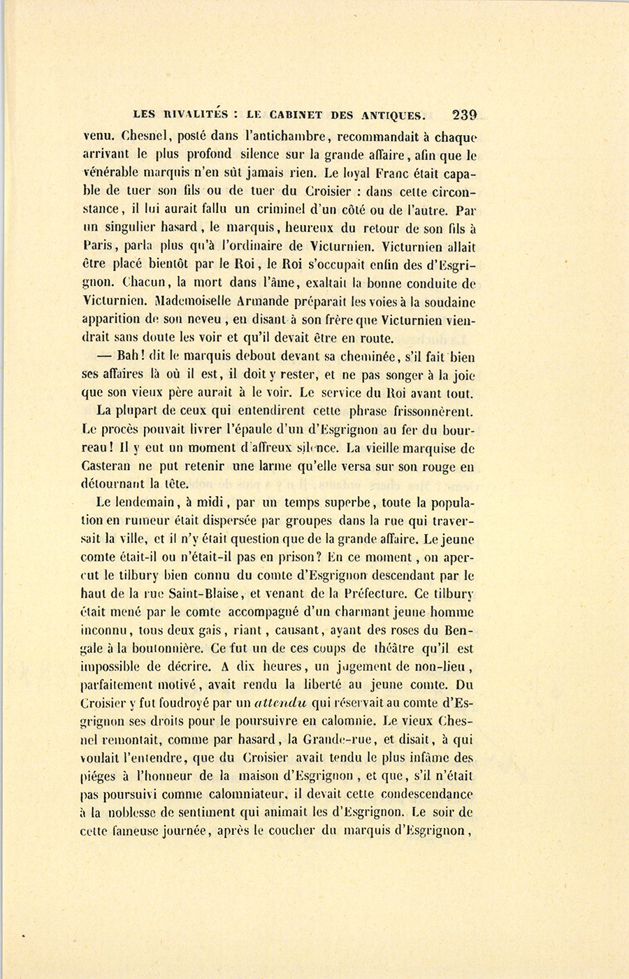 Mademoiselle Armande descendit au salon, et trouva le Cabinet des Antiques au grand complet. Autant pour fêter Monseigneur que pour entourer le marquis d’Esgrignon, chacun des habitués était {p. 239} venu. Chesnel, posté dans l’antichambre, recommandait à chaque arrivant le plus profond silence sur la grande affaire, afin que le vénérable marquis n’en sût jamais rien. Le loyal Franc était capable de tuer son fils ou de tuer du Croisier : dans cette circonstance, il lui aurait fallu un criminel d’un côté ou de l’autre. Par un singulier hasard, le marquis, heureux du retour de son fils à Paris, parla plus qu’à l’ordinaire de Victurnien. Victurnien allait être placé bientôt par le Roi, le Roi s’occupait enfin des d’Esgrignon. Chacun, la mort dans l’âme, exaltait la bonne conduite de Victurnien. Mademoiselle Armande préparait les voies à la soudaine apparition de son neveu, en disant à son frère que Victurnien viendrait sans doute les voir et qu’il devait être en route.
