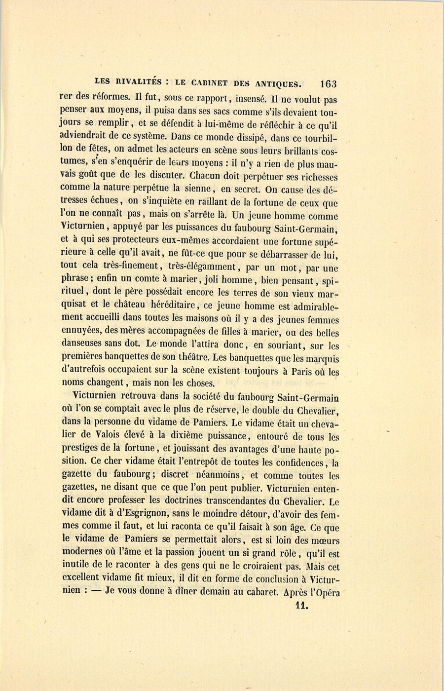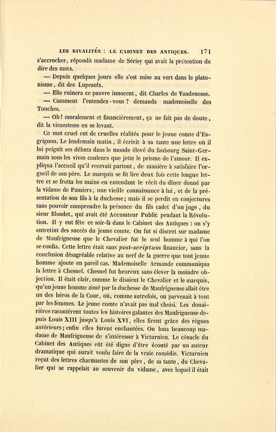 Sans ces explications qui peignent tout un côté de l’histoire de la vie provinciale sous l’Empire et la Restauration, il eût été difficile de comprendre la scène par laquelle commence cette aventure, et qui eut lieu vers la fin du mois d’octobre de l’année 1822, dans le Cabinet des Antiques, un soir, après le jeu, quand les nobles habitués, les vieilles comtesses, les jeunes marquises, les simples baronnes eurent soldé leurs comptes. Le vieux gentilhomme se promenait de long en long dans son salon, où mademoiselle d’Esgrignon allait éteignant elle-même les bougies aux tables de jeu, il ne se promenait pas seul, il était avec le Chevalier. Ces deux débris du siècle précédent causaient de Victurnien. Le Chevalier avait été chargé de faire à son sujet des ouvertures au marquis.
