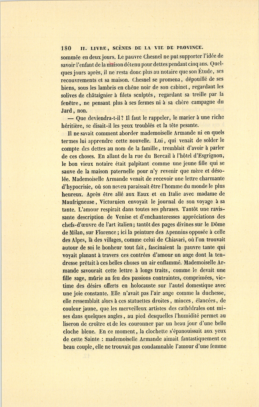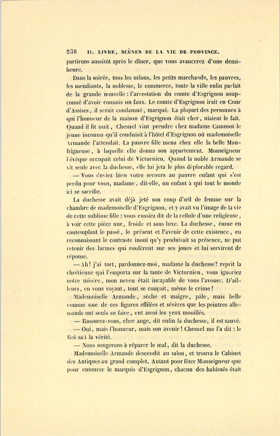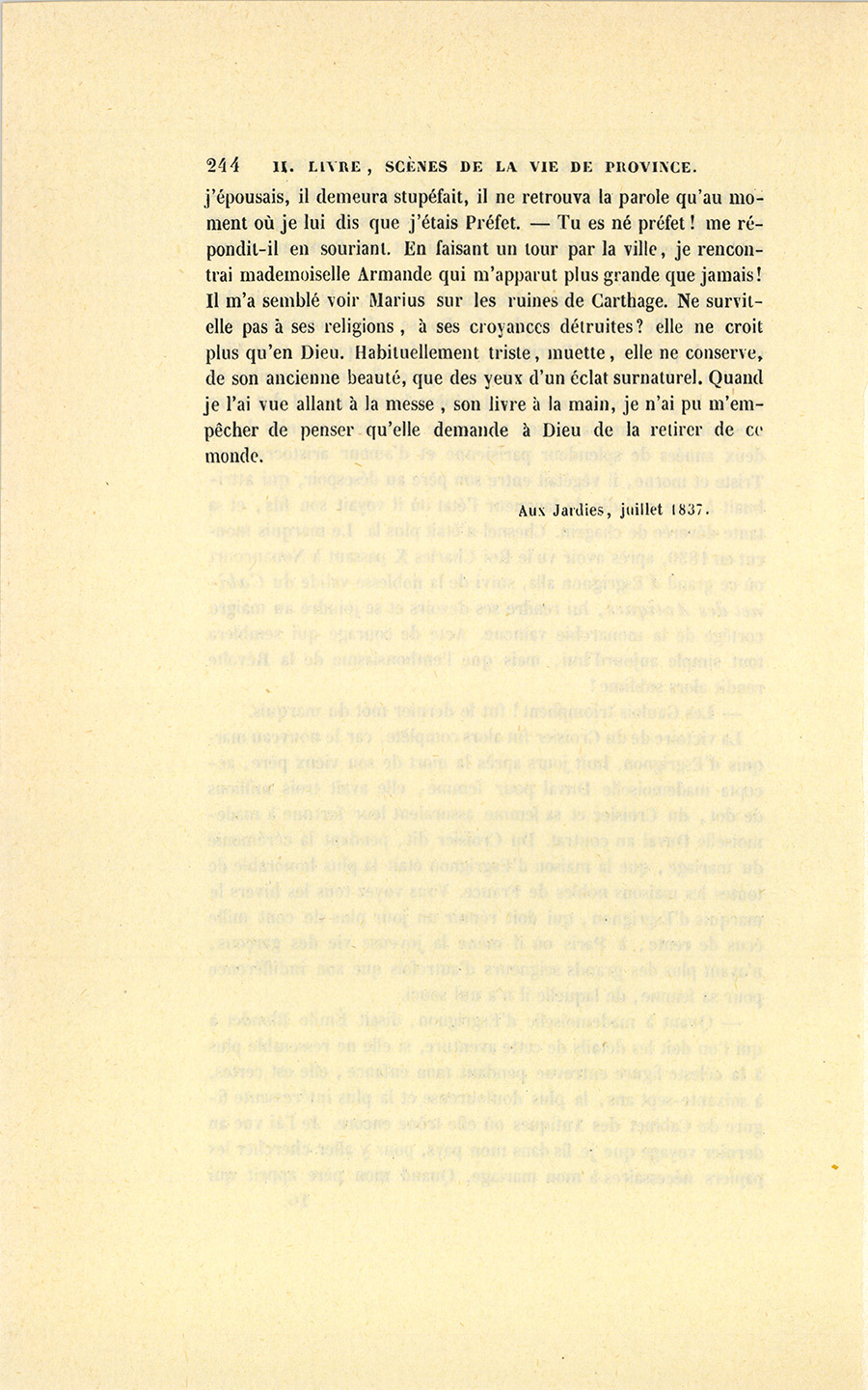 – Quant à mademoiselle d’Esgrignon, disait Émile Blondet à qui l’on doit les détails de cette aventure, si elle ne ressemble plus à la céleste figure entrevue pendant mon enfance, elle est certes, à soixante-sept ans, la plus douloureuse et la plus intéressante figure du Cabinet des Antiques où elle trône encore. Je l’ai vue au dernier voyage que je fis dans mon pays, pour y aller chercher les papiers nécessaires à mon mariage. Quand mon père apprit qui {p. 244} j’épousais, il demeura stupéfait, il ne retrouva la parole qu’au moment où je lui dis que j’étais Préfet. – Tu es né préfet ! me répondit-il en souriant. En faisant un tour par la ville, je rencontrai mademoiselle Armande qui m’apparut plus grande que jamais ! Il m’a semblé voir Marius sur les ruines de Carthage. Ne survit-elle pas à ses religions, à ses croyances détruites ? elle ne croit plus qu’en Dieu. Habituellement triste, muette, elle ne conserve, de son ancienne beauté, que des yeux d’un éclat surnaturel. Quand je l’ai vue allant à la messe, son livre à la main, je n’ai pu m’empêcher de penser qu’elle demande à Dieu de la retirer de ce monde.