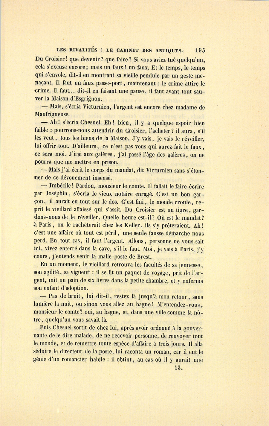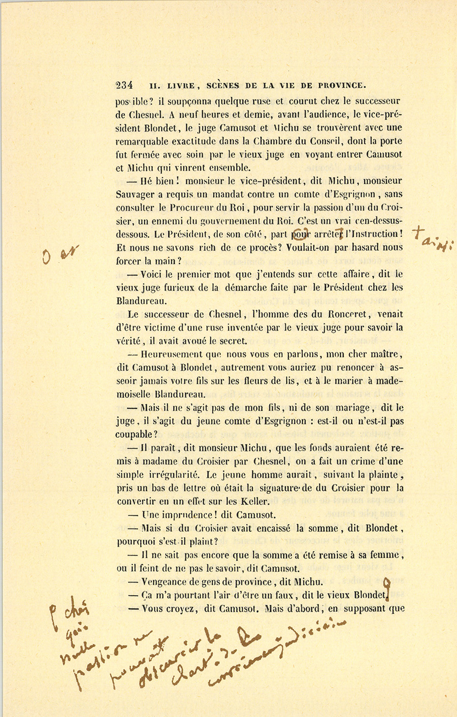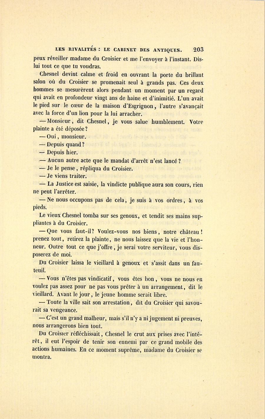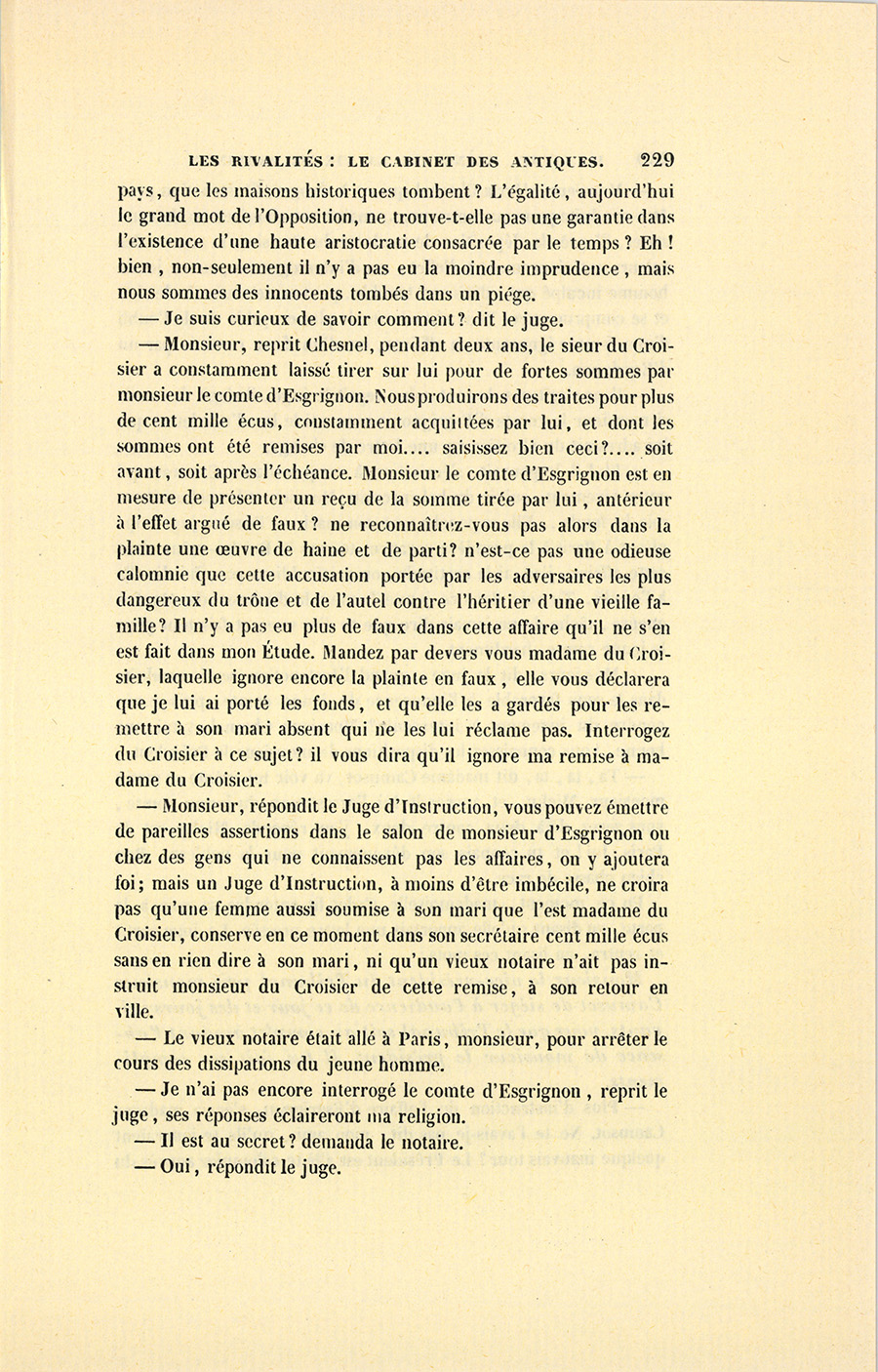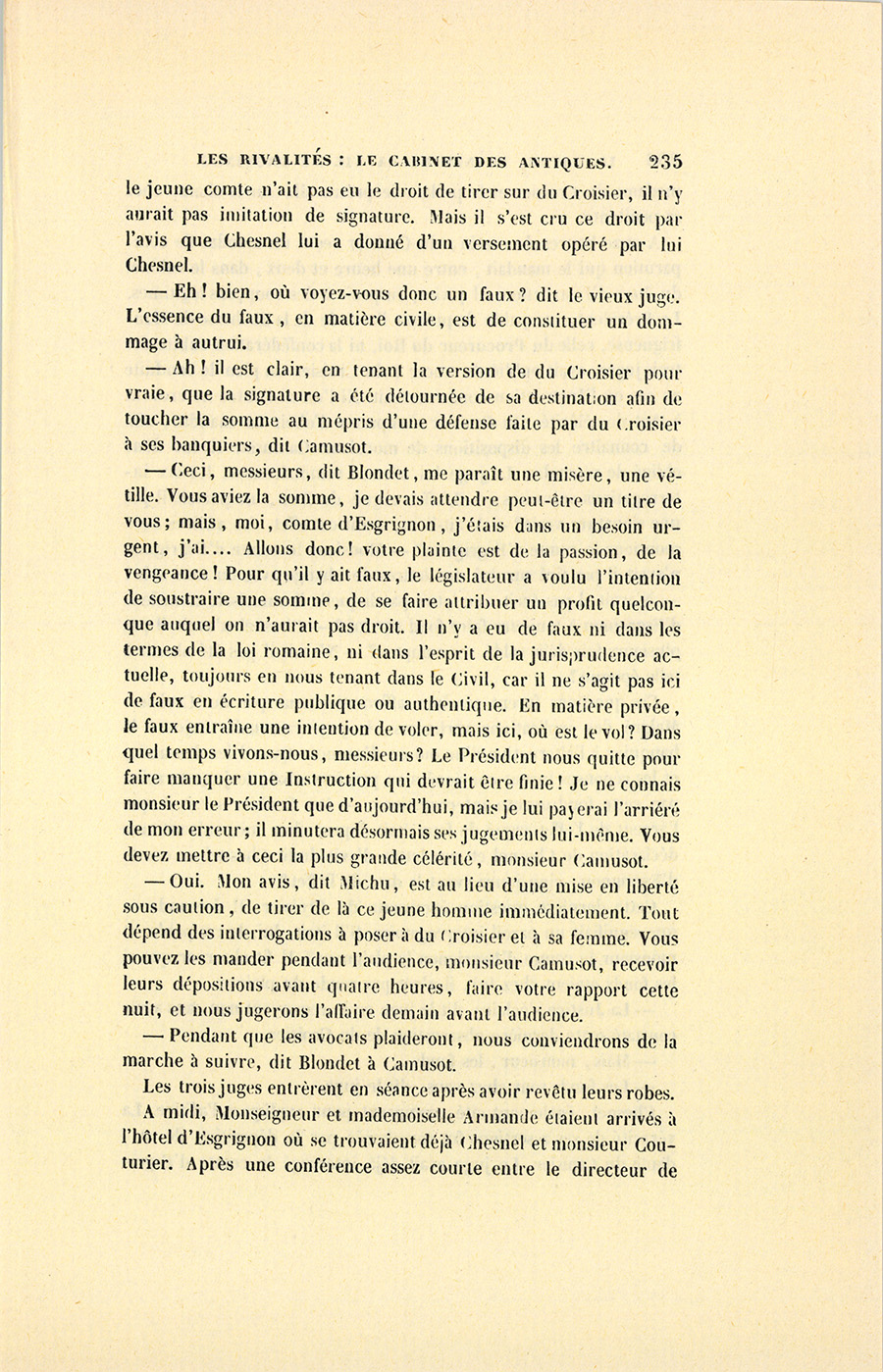 – Vous croyez, dit Camusot. Mais d’abord, en supposant que {p. 235} le jeune comte n’ait pas eu le droit de tirer sur du Croisier, il n’y aurait pas imitation de signature. Mais il s’est cru ce droit par l’avis que Chesnel lui a donné d’un versement opéré par lui Chesnel.