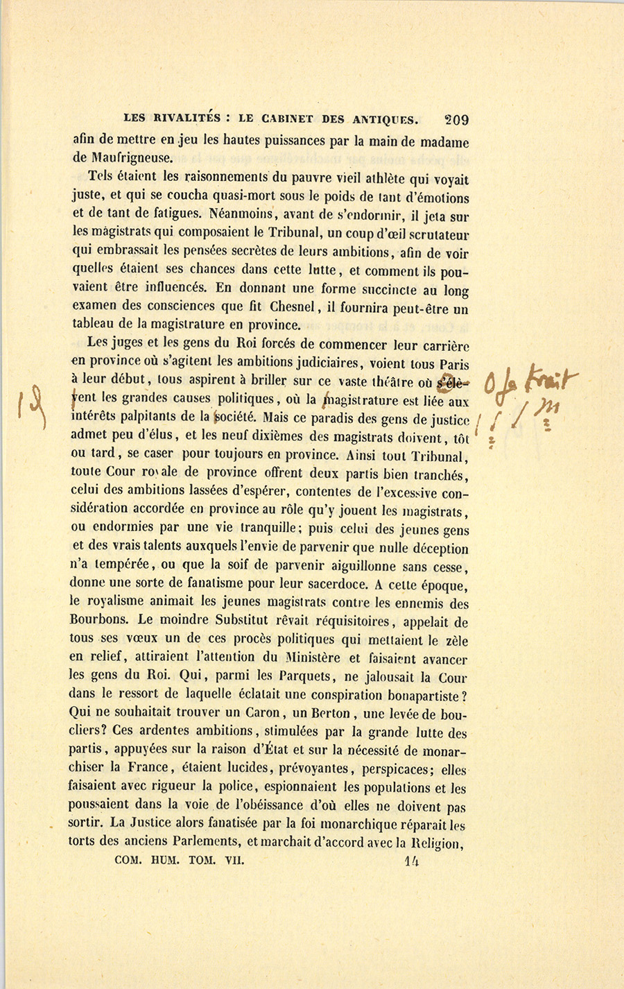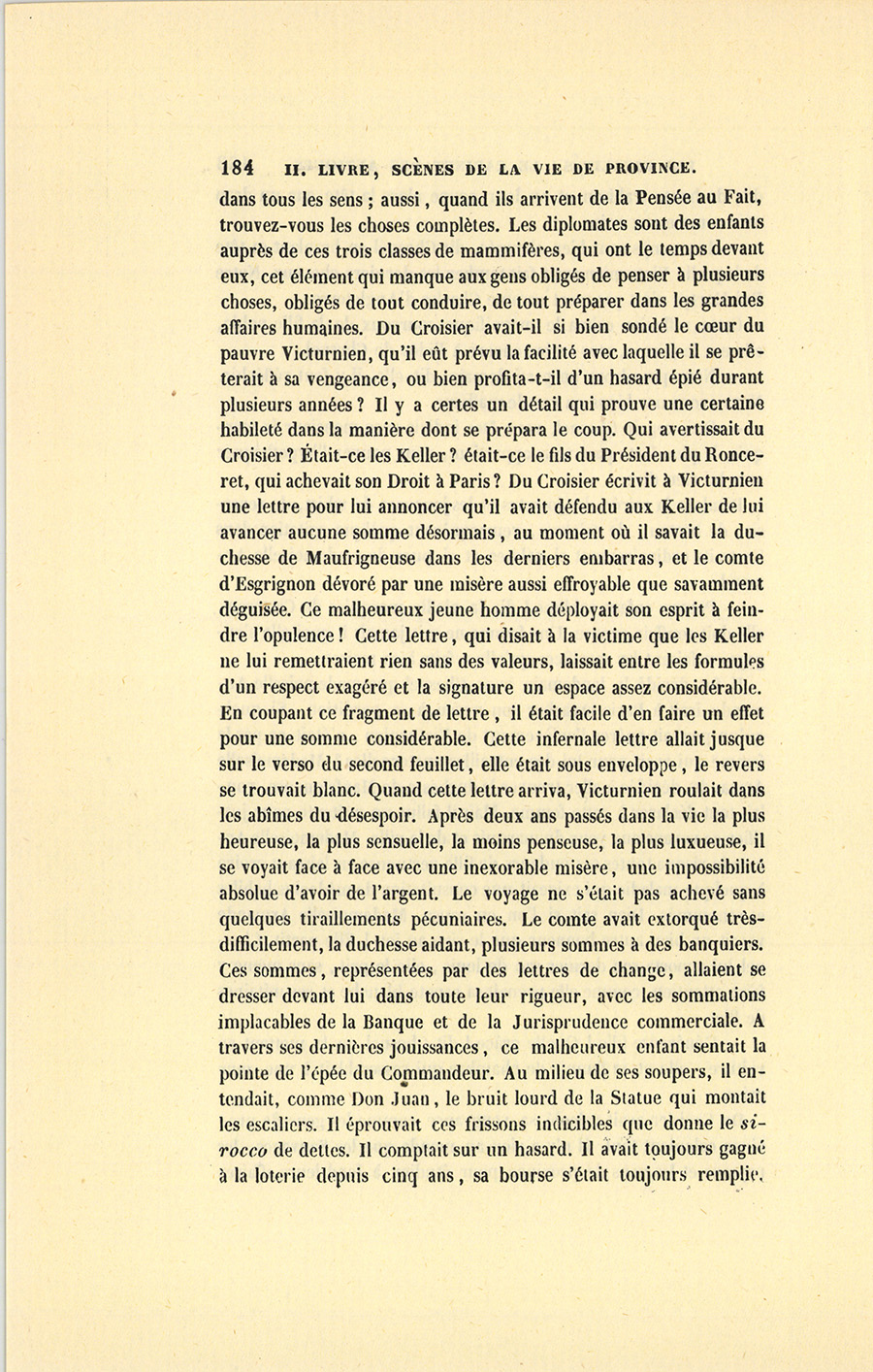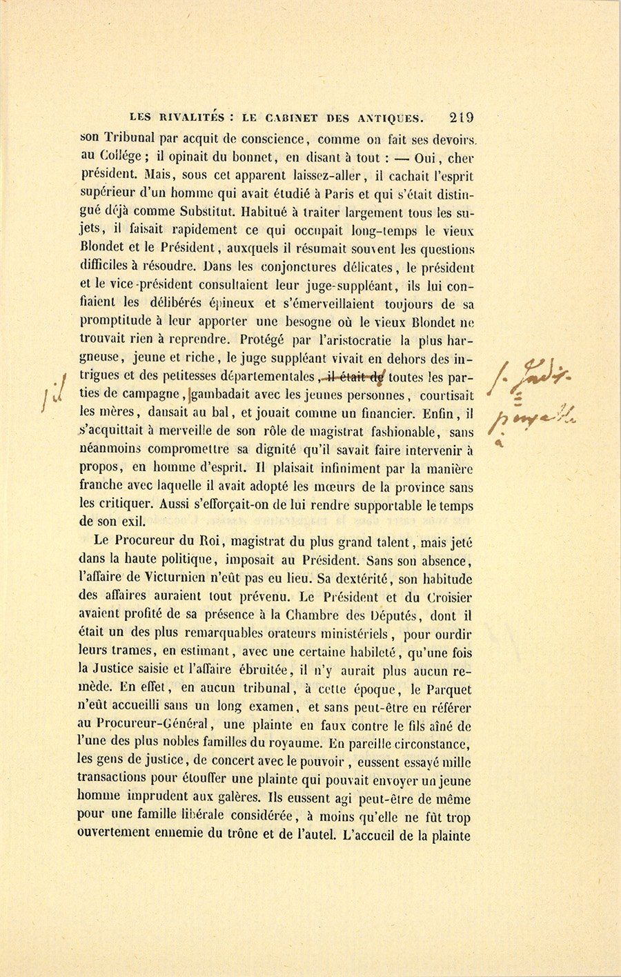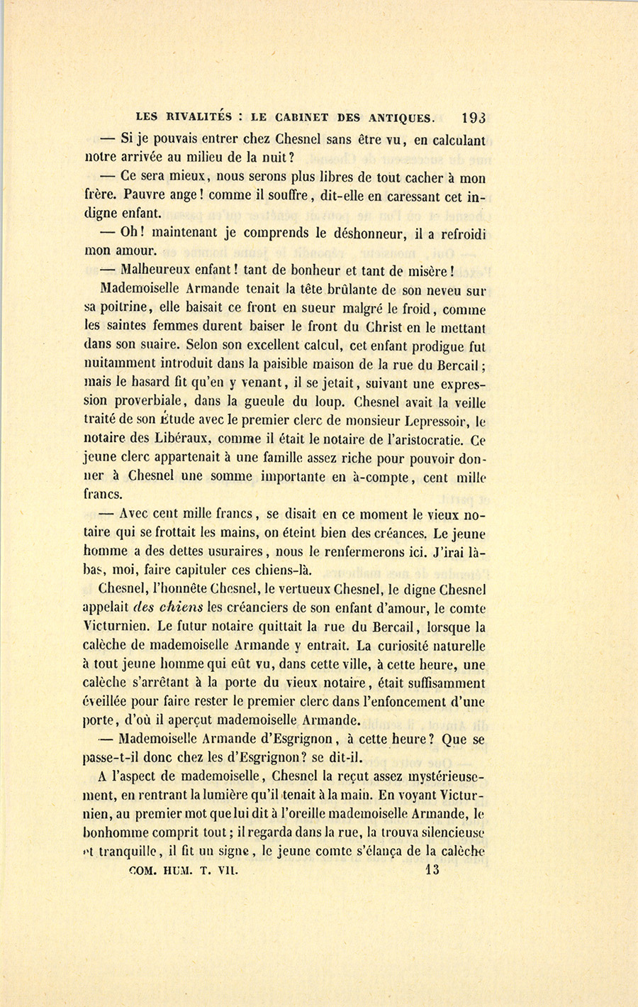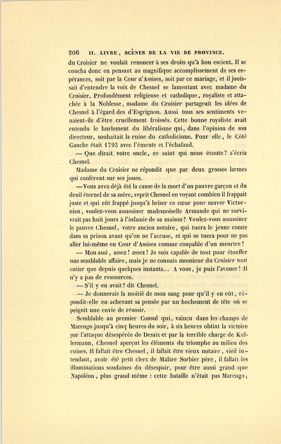 – Vous croyez, dit Camusot. Mais d’abord, en supposant que {p. 235} le jeune comte n’ait pas eu le droit de tirer sur du Croisier, il n’y aurait pas imitation de signature. Mais il s’est cru ce droit par l’avis que Chesnel lui a donné d’un versement opéré par lui Chesnel.