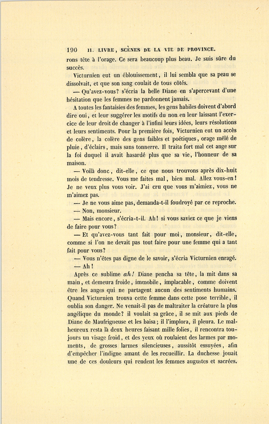 Diane avait disparu. Le fouet du postillon disait à Victurnien que le beau roman de sa première passion était fini. En danger, Diane avait encore pu voir dans le jeune comte son amant ; mais, sauvé, la duchesse le méprisait comme un homme faible qu’il était.