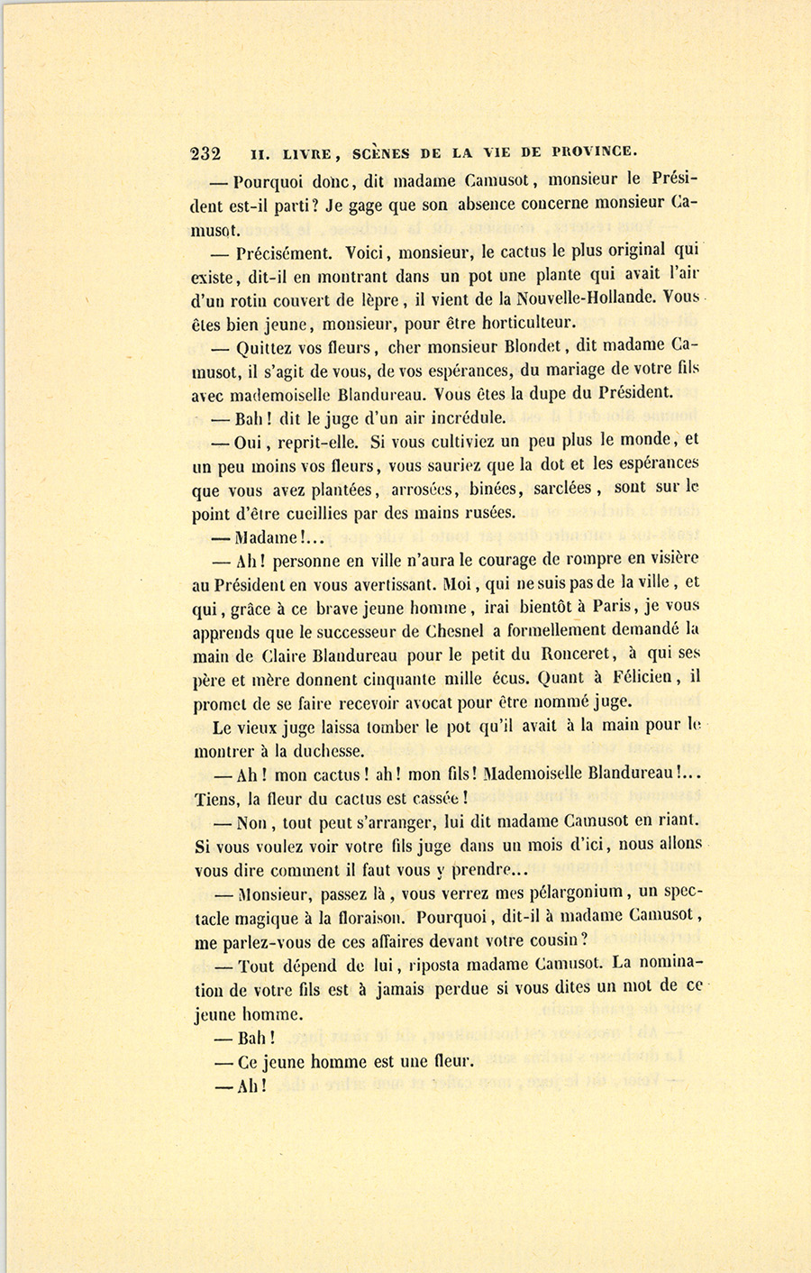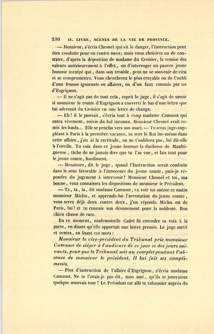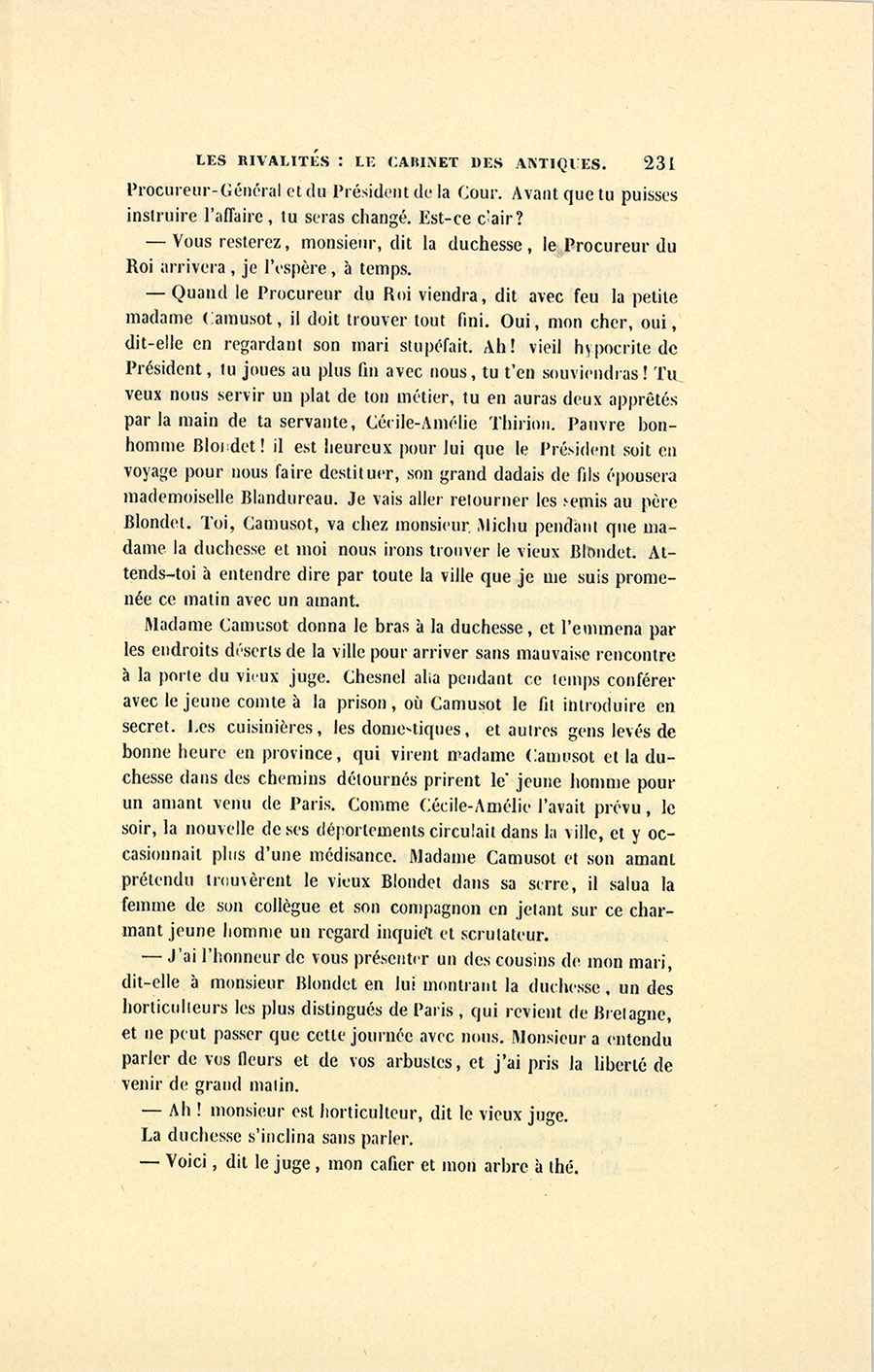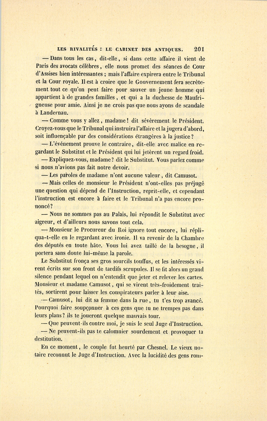 {p. 232} – Pourquoi donc, dit madame Camusot, monsieur le Président est-il parti ? Je gage que son absence concerne monsieur Camusot.