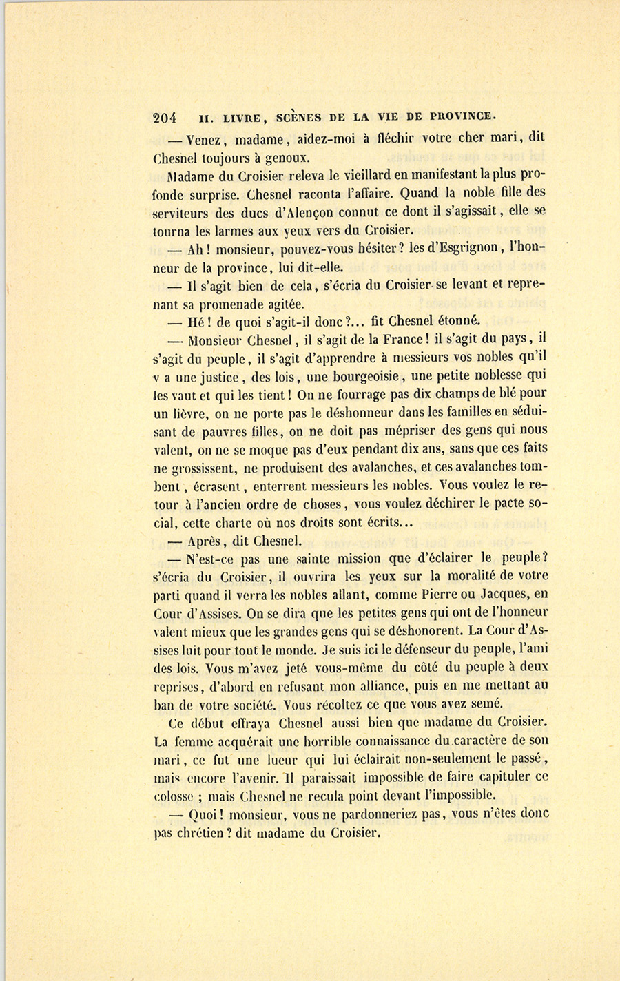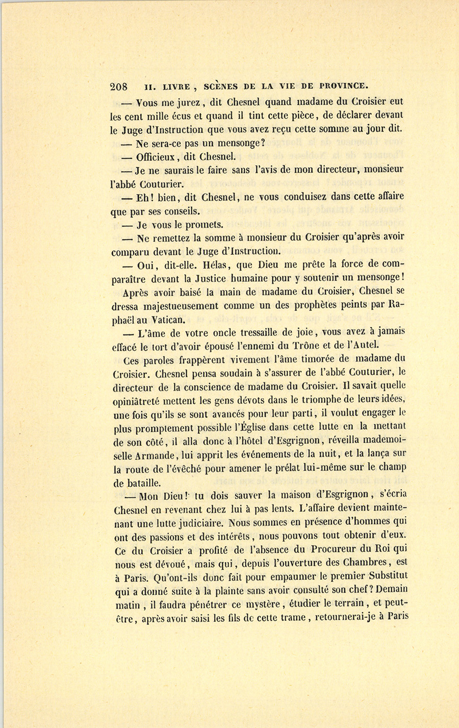 À midi, Monseigneur et mademoiselle Armande étaient arrivés à l’hôtel d’Esgrignon où se trouvaient déjà Chesnel et monsieur Couturier. Après une conférence assez courte entre le directeur de {p. 236} madame du Croisier et le prélat, le prêtre alla sur-le-champ chez sa pénitente.