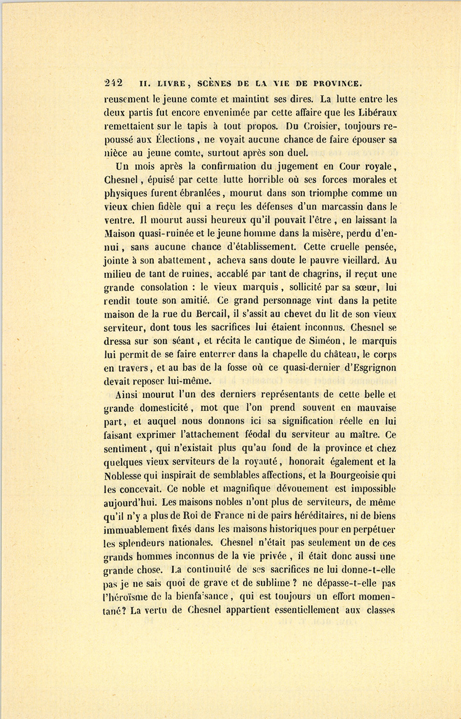 Ainsi mourut l’un des derniers représentants de cette belle et grande domesticité, mot que l’on prend souvent en mauvaise part, et auquel nous donnons ici sa signification réelle en lui faisant exprimer l’attachement féodal du serviteur au maître. Ce sentiment, qui n’existait plus qu’au fond de la province et chez quelques vieux serviteurs de la royauté, honorait également et la Noblesse qui inspirait de semblables affections, et la Bourgeoisie qui les concevait. Ce noble et magnifique dévouement est impossible aujourd’hui. Les maisons nobles n’ont plus de serviteurs, de même qu’il n’y a plus de Roi de France ni de pairs héréditaires, ni de biens immuablement fixés dans les maisons historiques pour en perpétuer les splendeurs nationales. Chesnel n’était pas seulement un de ces grands hommes inconnus de la vie privée, il était donc aussi une grande chose. La continuité de ses sacrifices ne lui donne-t-elle pas je ne sais quoi de grave et de sublime ? ne dépasse-t-elle pas l’héroïsme de la bienfaisance, qui est toujours un effort momentané ? La vertu de Chesnel appartient essentiellement aux classes {p. 243} placées entre les misères du peuple et les grandeurs de l’aristocratie, et qui peuvent unir ainsi les modestes vertus du Bourgeois aux sublimes pensées du Noble, en les éclairant aux flambeaux d’une solide instruction.
