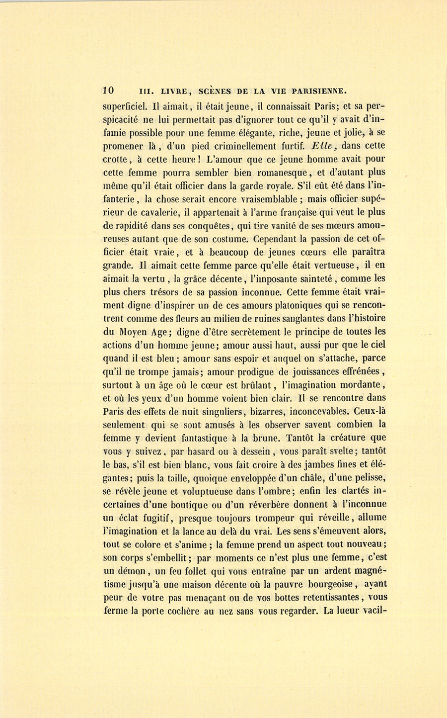 À huit heures et demie du soir, rue Pagevin, dans un temps où la rue Pagevin n’avait pas un mur qui ne répétât un mot infâme, et dans la direction de la rue Soly, la plus étroite et la moins praticable de toutes les rues de Paris, sans en excepter le coin le plus fréquenté de la rue la plus déserte ; au commencement du mois de février, il y a de cette aventure environ treize ans, un jeune homme, par l’un de ces hasards qui n’arrivent pas deux fois dans la vie, tournait, à pied, le coin de la rue Pagevin pour entrer dans la rue des Vieux-Augustins, du côté droit, où se trouve précisément la rue Soly. Là, ce jeune homme, qui demeurait, lui, rue de Bourbon, trouva dans la femme, à quelques pas de laquelle il marchait fort insouciamment, de vagues ressemblances avec la plus jolie femme de Paris, une chaste et délicieuse personne de laquelle il était en secret passionnément amoureux, et amoureux sans espoir : elle était mariée. En un moment son cœur bondit, une chaleur intolérable sourdit de son diaphragme et passa dans toutes ses veines, il eut froid dans le dos, et sentit dans sa tête un frémissement {p. 10} superficiel. Il aimait, il était jeune, il connaissait Paris ; et sa perspicacité ne lui permettait pas d’ignorer tout ce qu’il y avait d’infamie possible pour une femme élégante, riche, jeune et jolie, à se promener là, d’un pied criminellement furtif. Elle, dans cette crotte, à cette heure ! L’amour que ce jeune homme avait pour cette femme pourra sembler bien romanesque, et d’autant plus même qu’il était officier dans la garde royale. S’il eût été dans l’infanterie, la chose serait encore vraisemblable ; mais officier supérieur de cavalerie, il appartenait à l’arme française qui veut le plus de rapidité dans ses conquêtes, qui tire vanité de ses mœurs amoureuses autant que de son costume. Cependant la passion de cet officier était vraie, et à beaucoup de jeunes cœurs elle paraîtra grande. Il aimait cette femme parce qu’elle était vertueuse, il en aimait la vertu, la grâce décente, l’imposante sainteté, comme les plus chers trésors de sa passion inconnue. Cette femme était vraiment digne d’inspirer un de ces amours platoniques qui se rencontrent comme des fleurs au milieu de ruines sanglantes dans l’histoire du Moyen Âge ; digne d’être secrètement le principe de toutes les actions d’un homme jeune ; amour aussi haut, aussi pur que le ciel quand il est bleu ; amour sans espoir et auquel on s’attache, parce qu’il ne trompe jamais ; amour prodigue de jouissances effrénées, surtout à un âge où le cœur est brûlant, l’imagination mordante, et où les yeux d’un homme voient bien clair. Il se rencontre dans Paris des effets de nuit singuliers, bizarres, inconcevables. Ceux-là seulement qui se sont amusés à les observer savent combien la femme y devient fantastique à la brune. Tantôt la créature que vous y suivez, par hasard ou à dessein, vous paraît svelte ; tantôt le bas, s’il est bien blanc, vous fait croire à des jambes fines et élégantes ; puis la taille, quoique enveloppée d’un châle, d’une pelisse, se révèle jeune et voluptueuse dans l’ombre ; enfin les clartés incertaines d’une boutique ou d’un réverbère donnent à l’inconnue un éclat fugitif, presque toujours trompeur qui réveille, allume l’imagination et la lance au delà du vrai. Les sens s’émeuvent alors, tout se colore et s’anime ; la femme prend un aspect tout nouveau ; son corps s’embellit ; par moments ce n’est plus une femme, c’est un démon, un feu follet qui vous entraîne par un ardent magnétisme jusqu’à une maison décente où la pauvre bourgeoise, ayant peur de votre pas menaçant ou de vos bottes retentissantes, vous ferme la porte cochère au nez sans vous regarder. La lueur {p. 11} vacillante que projetait le vitrage d’une boutique de cordonnier illumina soudain, précisément à la chute des reins, la taille de la femme qui se trouvait devant le jeune homme. Ah ! certes, elle seule était ainsi cambrée ! Elle seule avait le secret de cette chaste démarche qui met innocemment en relief les beautés des formes les plus attrayantes. C’était et son châle du matin et le chapeau de velours du matin. À son bas de soie gris, pas une mouche, à son soulier pas une éclaboussure. Le châle était bien collé sur le buste, il en dessinait vaguement les délicieux contours, et le jeune homme en avait vu les blanches épaules au bal ; il savait tout ce que ce châle couvrait de trésors. À la manière dont s’entortille une Parisienne dans son châle, à la manière dont elle lève le pied dans la rue, un homme d’esprit devine le secret de sa course mystérieuse. Il y a je ne sais quoi de frémissant, de léger dans la personne et dans la démarche : la femme semble peser moins, elle va, elle va, ou mieux elle file comme une étoile, et vole emportée par une pensée que trahissent les plis et les jeux de sa robe. Le jeune homme hâta le pas, devança la femme, se retourna pour la voir… Pst ! elle avait disparu dans une allée dont la porte à claire-voie et à grelot claquait et sonnait. Le jeune homme revint, et vit cette femme montant au fond de l’allée, non sans recevoir l’obséquieux salut d’une vieille portière, un tortueux escalier dont les premières marches étaient fortement éclairées ; et madame montait lestement, vivement, comme doit monter une femme impatiente.
