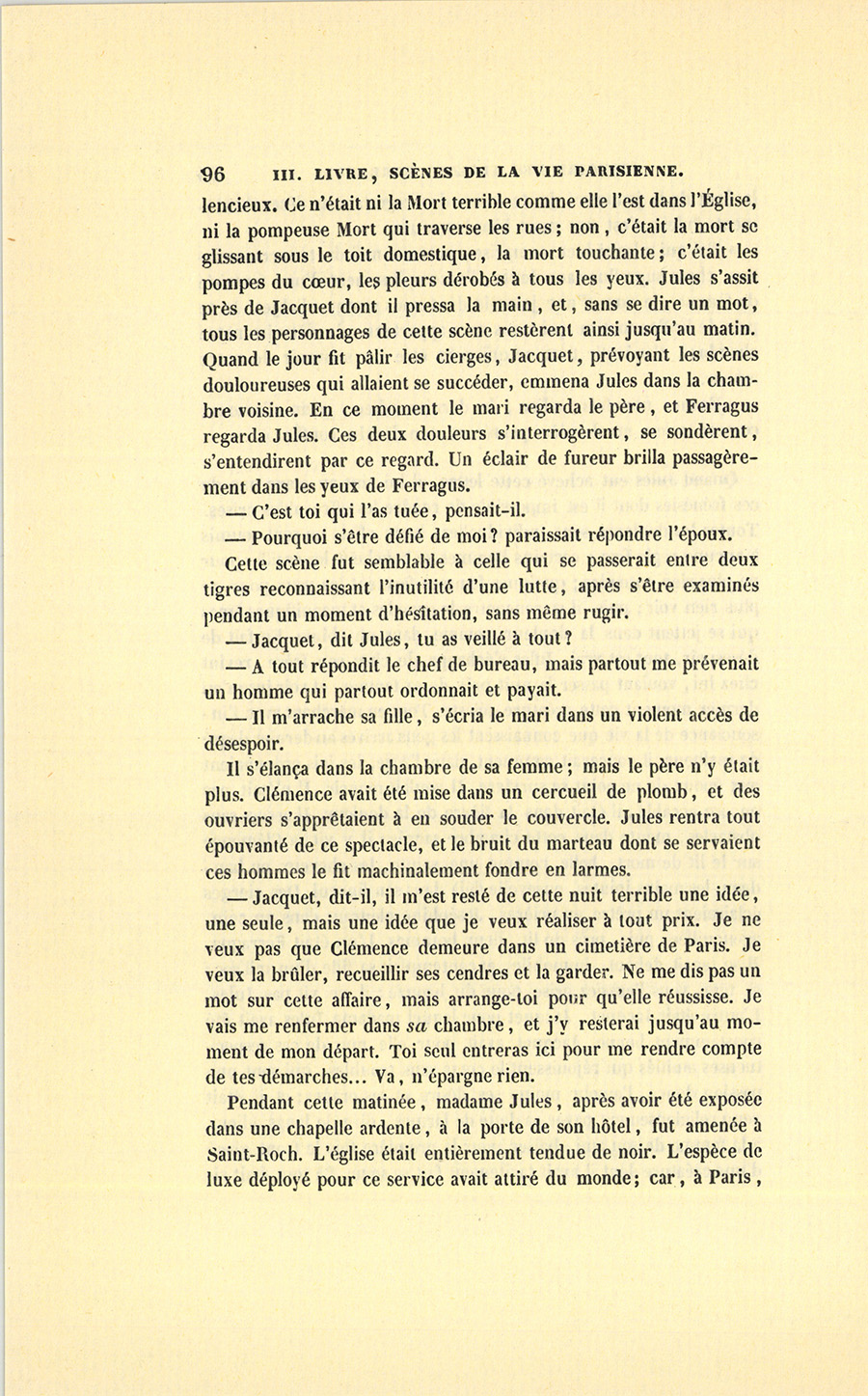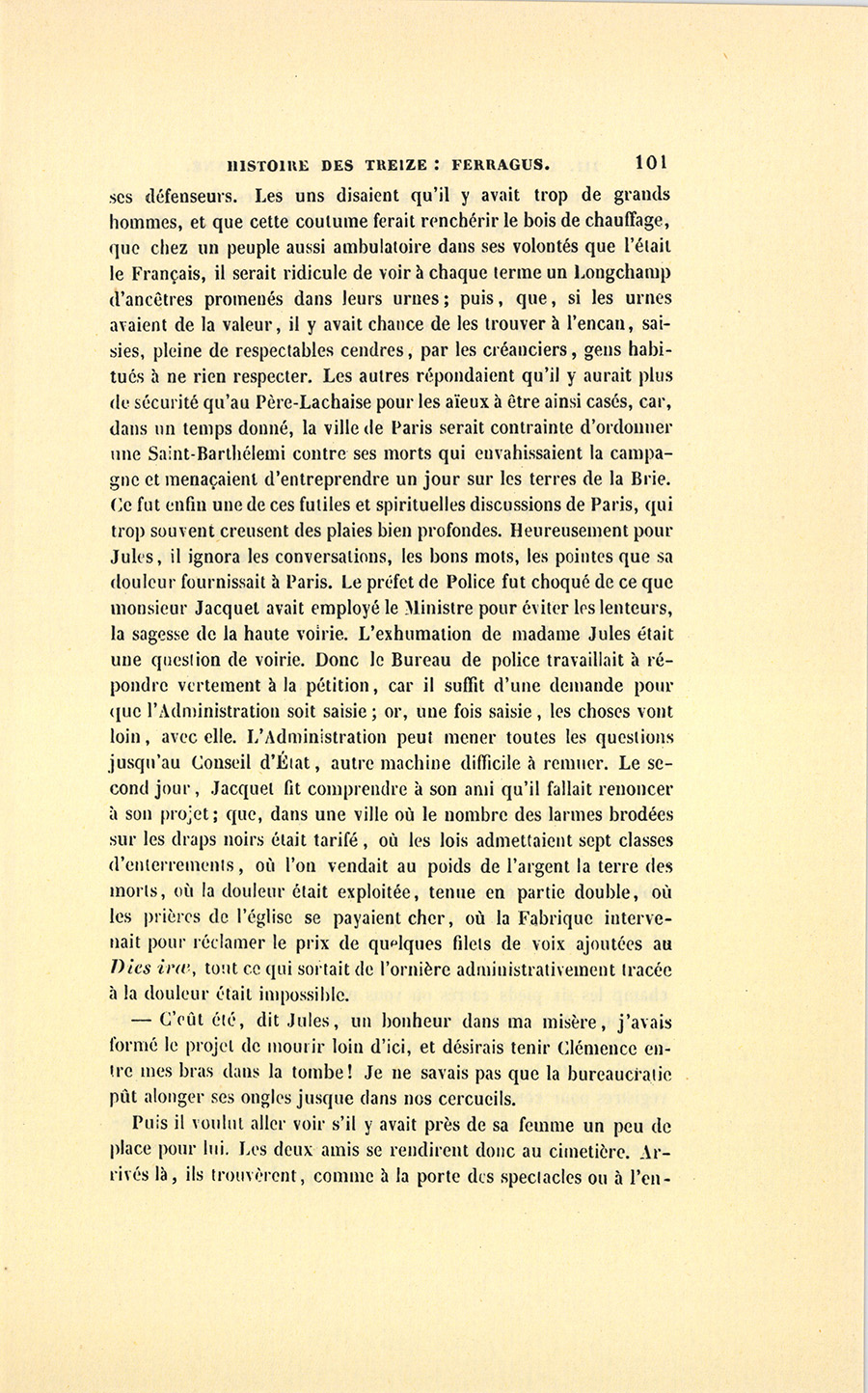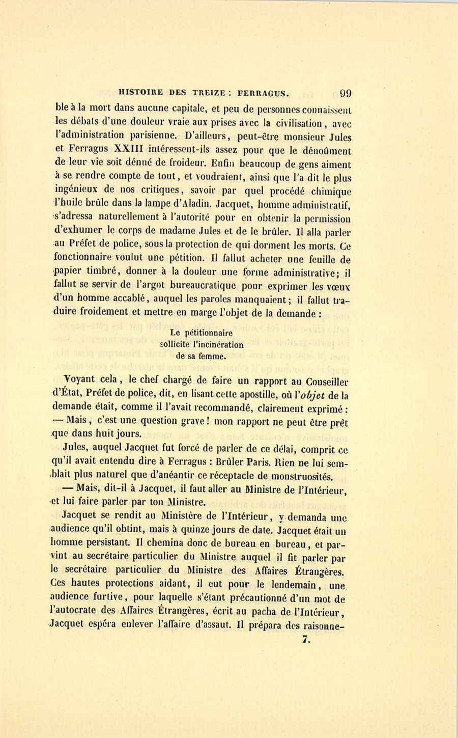 Ici semble finir le récit de cette histoire ; mais peut-être serait-elle incomplète si, après avoir donné un léger croquis de la vie parisienne, si, après en avoir suivi les capricieuses ondulations, les effets de la mort y étaient oubliés. La mort, dans Paris, ne {p. 99} ressemble à la mort dans aucune capitale, et peu de personnes connaissent les débats d’une douleur vraie aux prises avec la civilisation, avec l’administration parisienne. D’ailleurs, peut-être monsieur Jules et Ferragus XXIII intéressent-ils assez pour que le dénoûment de leur vie soit dénué de froideur. Enfin beaucoup de gens aiment à se rendre compte de tout, et voudraient, ainsi que l’a dit le plus ingénieux de nos critiques, savoir par quel procédé chimique l’huile brûle dans la lampe d’Aladin. Jacquet, homme administratif, s’adressa naturellement à l’autorité pour en obtenir la permission d’exhumer le corps de madame Jules et de le brûler. Il alla parler au Préfet de police, sous la protection de qui dorment les morts. Ce fonctionnaire voulut une pétition. Il fallut acheter une feuille de papier timbré, donner à la douleur une forme administrative ; il fallut se servir de l’argot bureaucratique pour exprimer les vœux d’un homme accablé, auquel les paroles manquaient ; il fallut traduire froidement et mettre en marge l’objet de la demande :