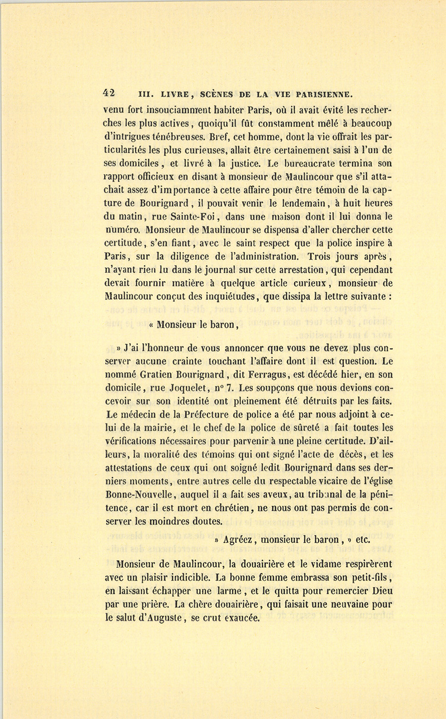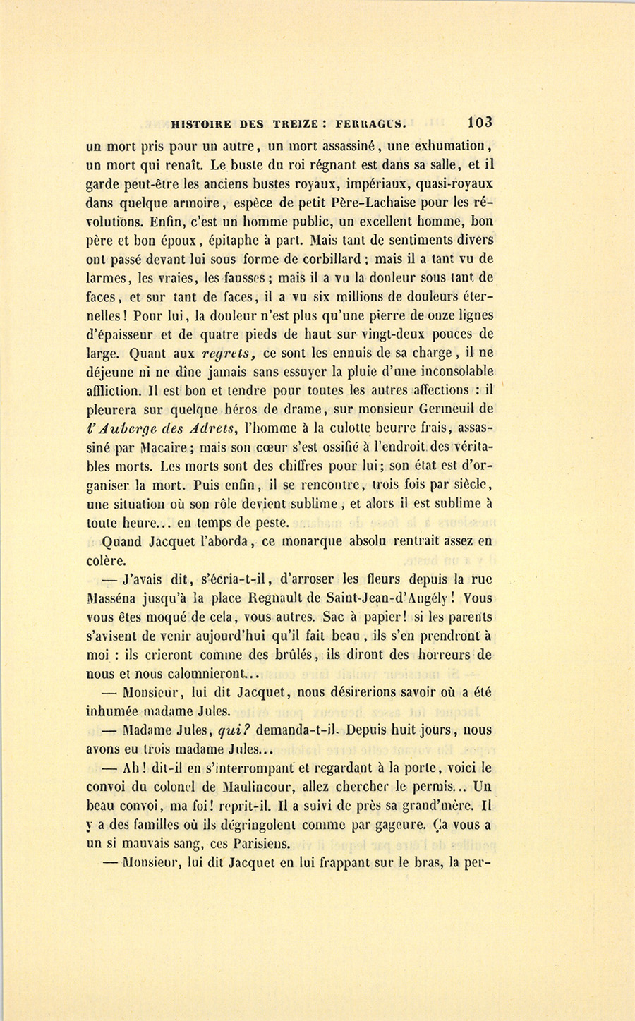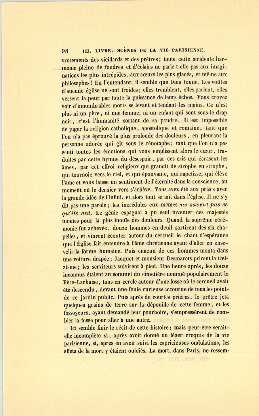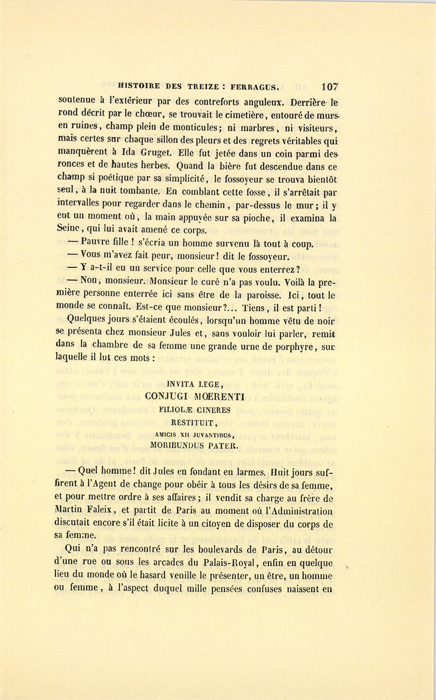 Ici semble finir le récit de cette histoire ; mais peut-être serait-elle incomplète si, après avoir donné un léger croquis de la vie parisienne, si, après en avoir suivi les capricieuses ondulations, les effets de la mort y étaient oubliés. La mort, dans Paris, ne {p. 99} ressemble à la mort dans aucune capitale, et peu de personnes connaissent les débats d’une douleur vraie aux prises avec la civilisation, avec l’administration parisienne. D’ailleurs, peut-être monsieur Jules et Ferragus XXIII intéressent-ils assez pour que le dénoûment de leur vie soit dénué de froideur. Enfin beaucoup de gens aiment à se rendre compte de tout, et voudraient, ainsi que l’a dit le plus ingénieux de nos critiques, savoir par quel procédé chimique l’huile brûle dans la lampe d’Aladin. Jacquet, homme administratif, s’adressa naturellement à l’autorité pour en obtenir la permission d’exhumer le corps de madame Jules et de le brûler. Il alla parler au Préfet de police, sous la protection de qui dorment les morts. Ce fonctionnaire voulut une pétition. Il fallut acheter une feuille de papier timbré, donner à la douleur une forme administrative ; il fallut se servir de l’argot bureaucratique pour exprimer les vœux d’un homme accablé, auquel les paroles manquaient ; il fallut traduire froidement et mettre en marge l’objet de la demande :