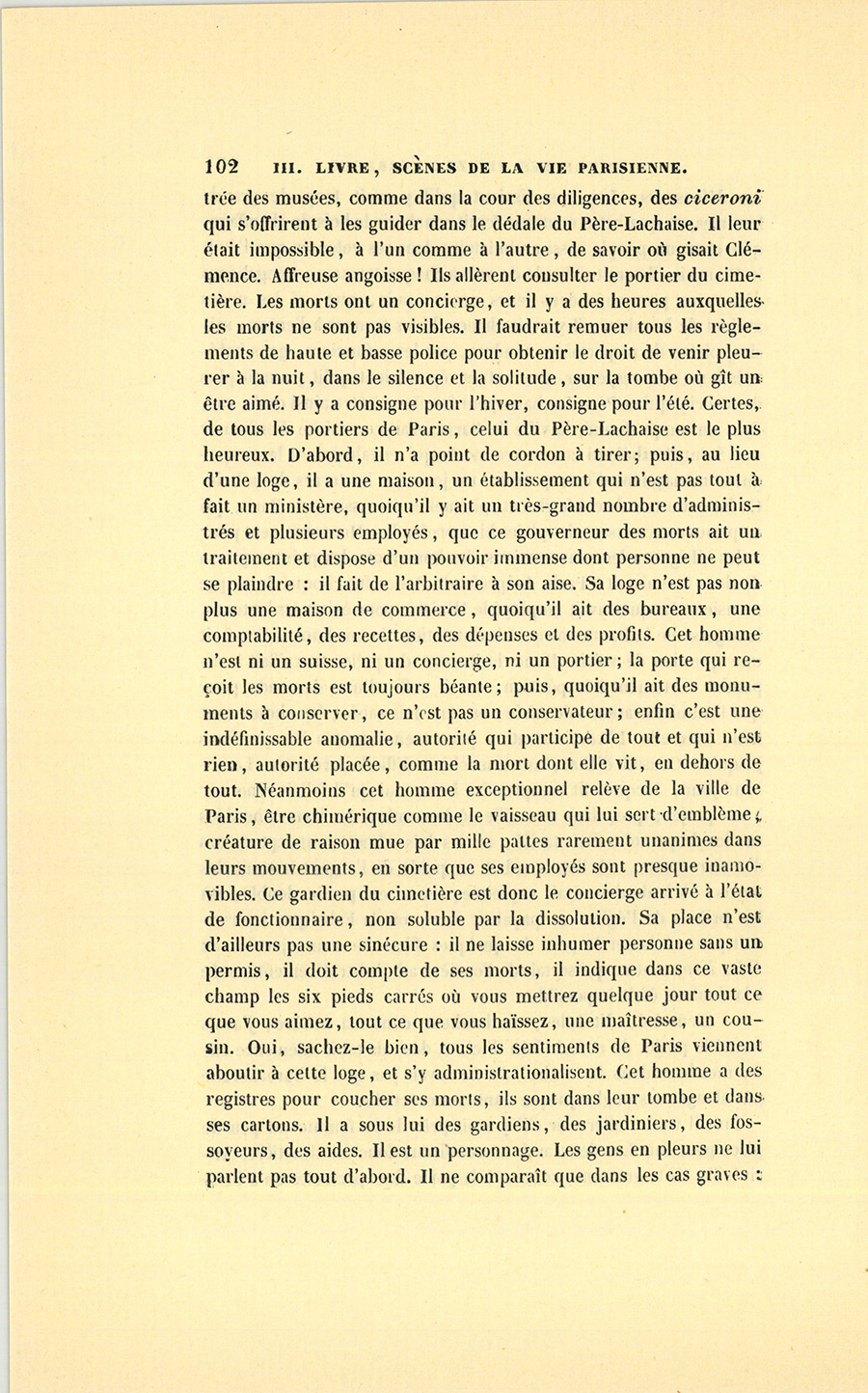 Puis il voulut aller voir s’il y avait près de sa femme un peu de place pour lui. Les deux amis se rendirent donc au cimetière. Arrivés là, ils trouvèrent, comme à la porte des spectacles ou à {p. 102} l’entrée des musées, comme dans la cour des diligences, des ciceroni qui s’offrirent à les guider dans le dédale du Père-Lachaise. Il leur était impossible, à l’un comme à l’autre, de savoir où gisait Clémence. Affreuse angoisse ! Ils allèrent consulter le portier du cimetière. Les morts ont un concierge, et il y a des heures auxquelles les morts ne sont pas visibles. Il faudrait remuer tous les règlements de haute et basse police pour obtenir le droit de venir pleurer à la nuit, dans le silence et la solitude, sur la tombe où gît un être aimé. Il y a consigne pour l’hiver, consigne pour l’été. Certes, de tous les portiers de Paris, celui du Père-Lachaise est le plus heureux. D’abord, il n’a point de cordon à tirer ; puis, au lieu d’une loge, il a une maison, un établissement qui n’est pas tout à fait un ministère, quoiqu’il y ait un très-grand nombre d’administrés et plusieurs employés, que ce gouverneur des morts ait un traitement et dispose d’un pouvoir immense dont personne ne peut se plaindre : il fait de l’arbitraire à son aise. Sa loge n’est pas non plus une maison de commerce, quoiqu’il ait des bureaux, une comptabilité, des recettes, des dépenses et des profits. Cet homme n’est ni un suisse, ni un concierge, ni un portier ; la porte qui reçoit les morts est toujours béante ; puis, quoiqu’il ait des monuments à conserver, ce n’est pas un conservateur ; enfin c’est une indéfinissable anomalie, autorité qui participe de tout et qui n’est rien, autorité placée, comme la mort dont elle vit, en dehors de tout. Néanmoins cet homme exceptionnel relève de la ville de Paris, être chimérique comme le vaisseau qui lui sert d’emblème, créature de raison mue par mille pattes rarement unanimes dans leurs mouvements, en sorte que ses employés sont presque inamovibles. Ce gardien du cimetière est donc le concierge arrivé à l’état de fonctionnaire, non soluble par la dissolution. Sa place n’est d’ailleurs pas une sinécure : il ne laisse inhumer personne sans un permis, il doit compte de ses morts, il indique dans ce vaste champ les six pieds carrés où vous mettrez quelque jour tout ce que vous aimez, tout ce que vous haïssez, une maîtresse, un cousin. Oui, sachez-le bien, tous les sentiments de Paris viennent aboutir à cette loge, et s’y administrationalisent. Cet homme a des registres pour coucher ses morts, ils sont dans leur tombe et dans ses cartons. Il a sous lui des gardiens, des jardiniers, des fossoyeurs, des aides. Il est un personnage. Les gens en pleurs ne lui parlent pas tout d’abord. Il ne comparaît que dans les cas graves : {p. 103} un mort pris pour un autre, un mort assassiné, une exhumation, un mort qui renaît. Le buste du roi régnant est dans sa salle, et il garde peut-être les anciens bustes royaux, impériaux, quasi-royaux dans quelque armoire, espèce de petit Père-Lachaise pour les révolutions. Enfin, c’est un homme public, un excellent homme, bon père et bon époux, épitaphe à part. Mais tant de sentiments divers ont passé devant lui sous forme de corbillard ; mais il a tant vu de larmes, les vraies, les fausses ; mais il a vu la douleur sous tant de faces, et sur tant de faces, il a vu six millions de douleurs éternelles ! Pour lui, la douleur n’est plus qu’une pierre de onze lignes d’épaisseur et de quatre pieds de haut sur vingt-deux pouces de large. Quant aux regrets, ce sont les ennuis de sa charge, il ne déjeune ni ne dîne jamais sans essuyer la pluie d’une inconsolable affliction. Il est bon et tendre pour toutes les autres affections : il pleurera sur quelque héros de drame, sur monsieur Germeuil de l’Auberge des Adrets, l’homme à la culotte beurre frais, assassiné par Macaire ; mais son cœur s’est ossifié à l’endroit des véritables morts. Les morts sont des chiffres pour lui ; son état est d’organiser la mort. Puis enfin, il se rencontre, trois fois par siècle, une situation où son rôle devient sublime, et alors il est sublime à toute heure… en temps de peste.