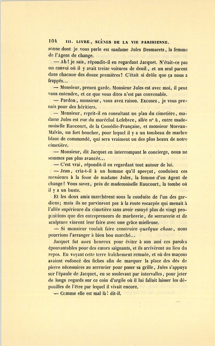 – Monsieur, reprit-il en consultant un plan du cimetière, madame Jules est rue du maréchal Lefebvre, allée nº 4, entre mademoiselle Raucourt, de la Comédie-Française, et monsieur Moreau-Malvin, un fort boucher, pour lequel il y a un tombeau de marbre blanc de commandé, qui sera vraiment un des plus beaux de notre cimetière.