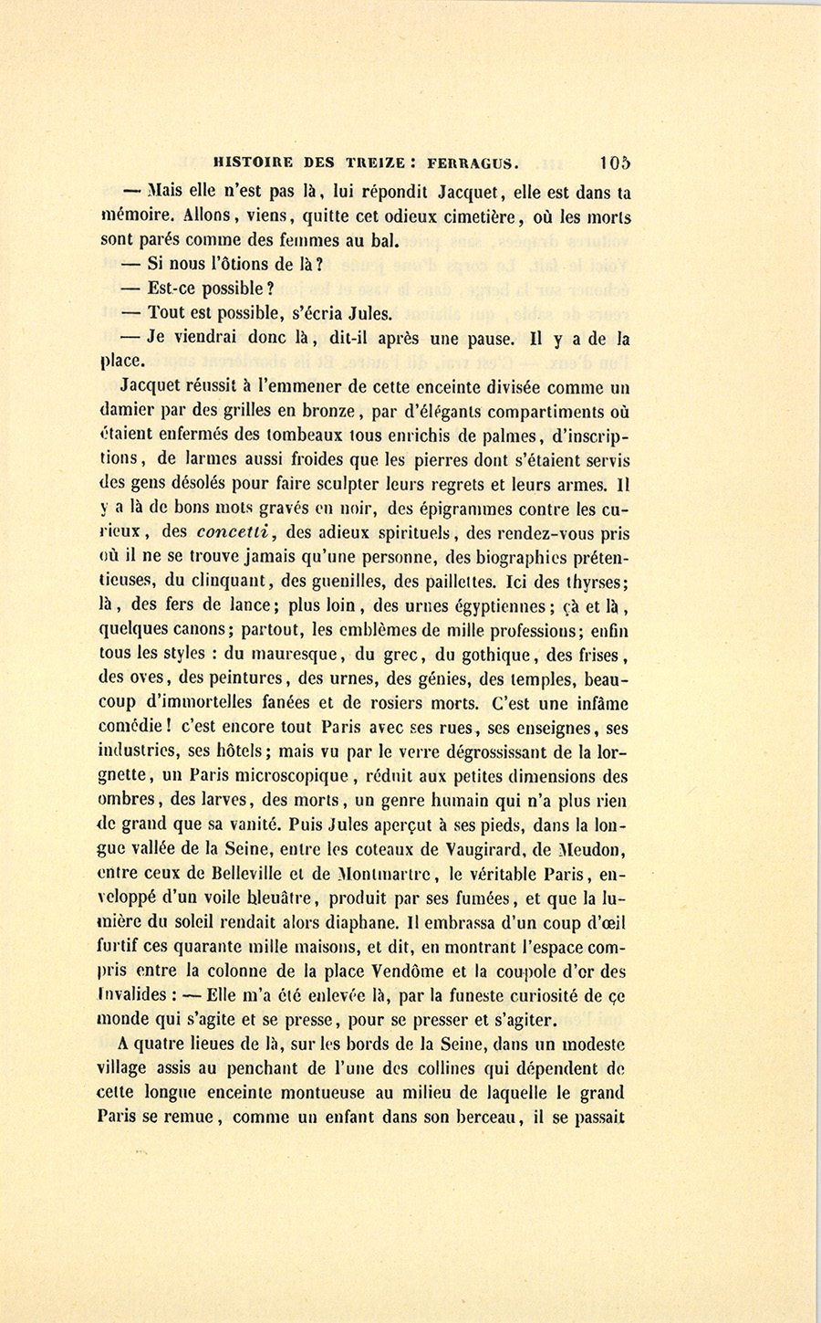 {p. 105} – Mais elle n’est pas là, lui répondit Jacquet, elle est dans ta mémoire. Allons, viens, quitte cet odieux cimetière, où les morts sont parés comme des femmes au bal.
