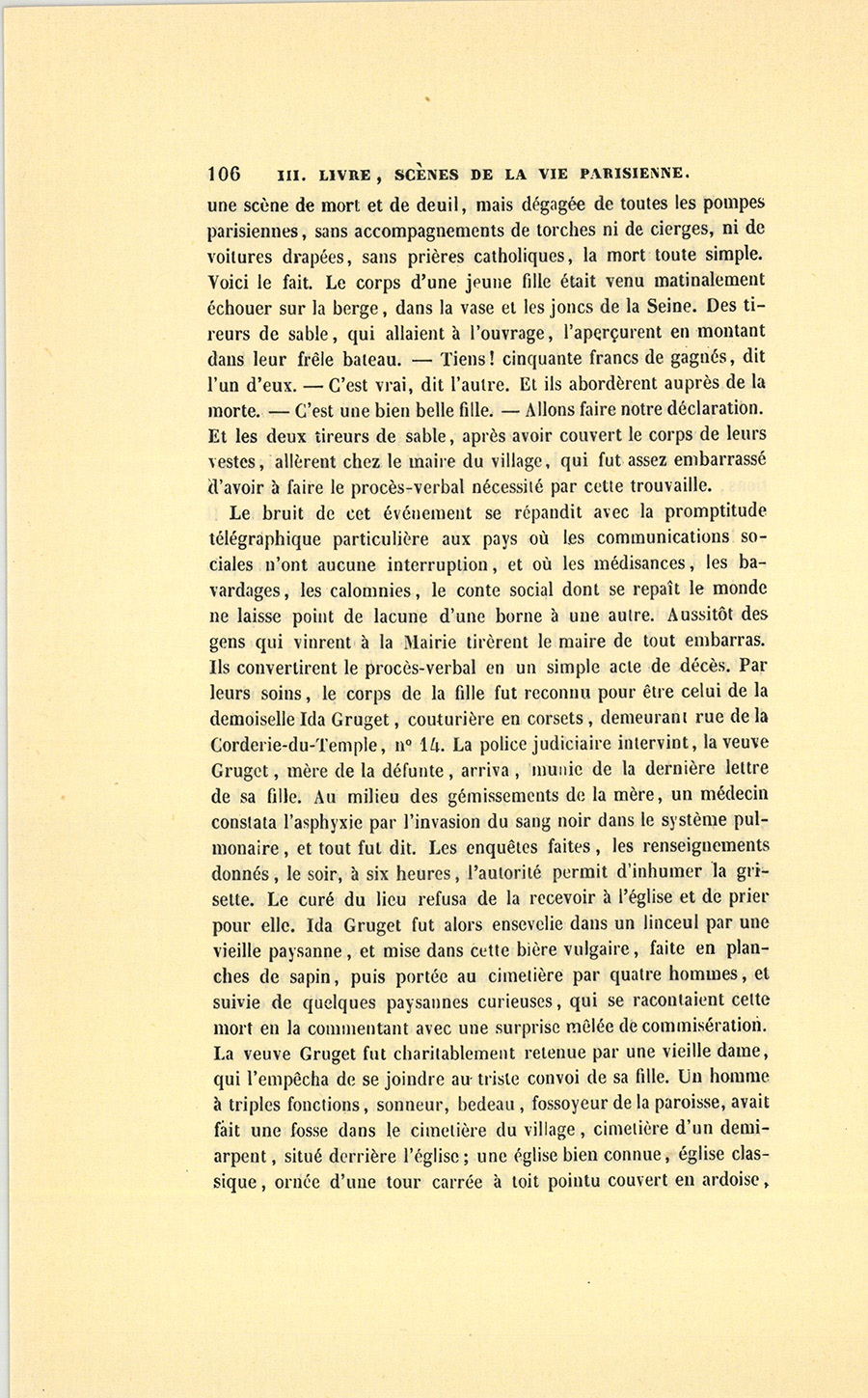 À quatre lieues de là, sur les bords de la Seine, dans un modeste village assis au penchant de l’une des collines qui dépendent de cette longue enceinte montueuse au milieu de laquelle le grand Paris se remue, comme un enfant dans son berceau, il se passait {p. 106} une scène de mort et de deuil, mais dégagée de toutes les pompes parisiennes, sans accompagnements de torches ni de cierges, ni de voitures drapées, sans prières catholiques, la mort toute simple. Voici le fait. Le corps d’une jeune fille était venu matinalement échouer sur la berge, dans la vase et les joncs de la Seine. Des tireurs de sable, qui allaient à l’ouvrage, l’aperçurent en montant dans leur frêle bateau. – Tiens ! cinquante francs de gagnés, dit l’un d’eux. – C’est vrai, dit l’autre. Et ils abordèrent auprès de la morte. – C’est une bien belle fille. – Allons faire notre déclaration. Et les deux tireurs de sable, après avoir couvert le corps de leurs vestes, allèrent chez le maire du village, qui fut assez embarrassé d’avoir à faire le procès-verbal nécessité par cette trouvaille.