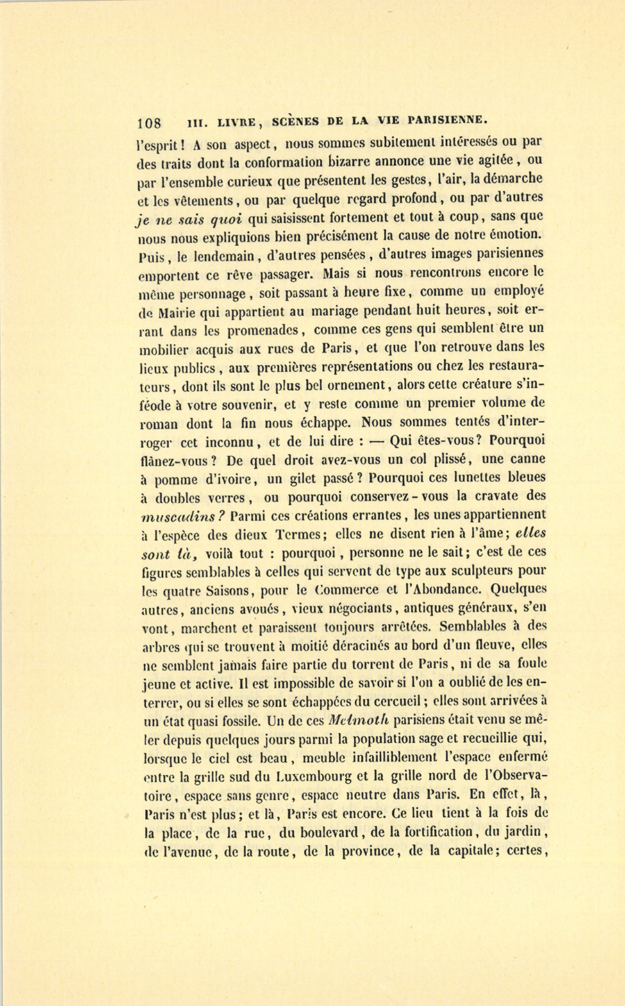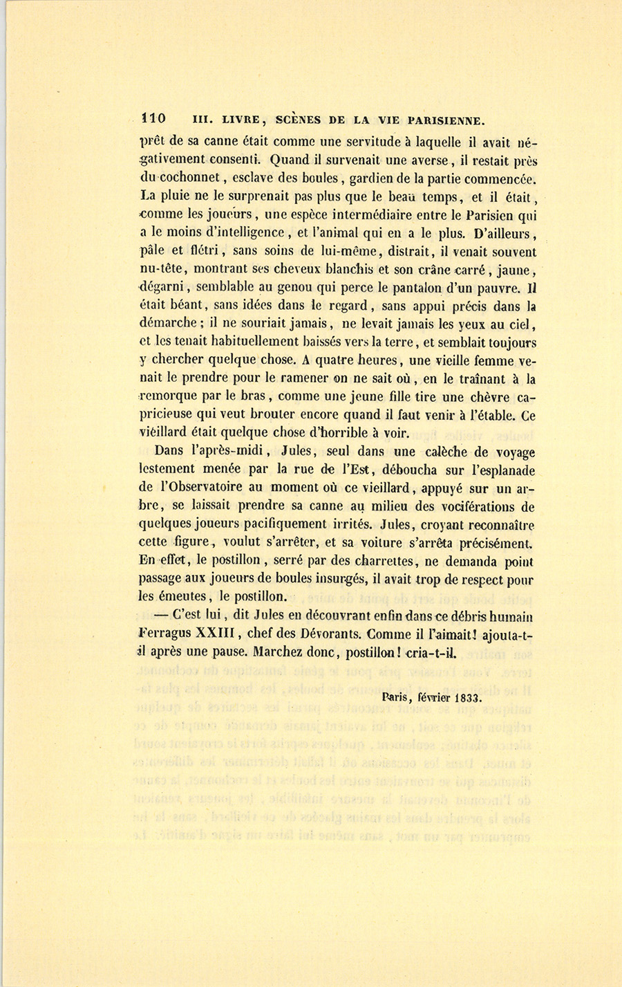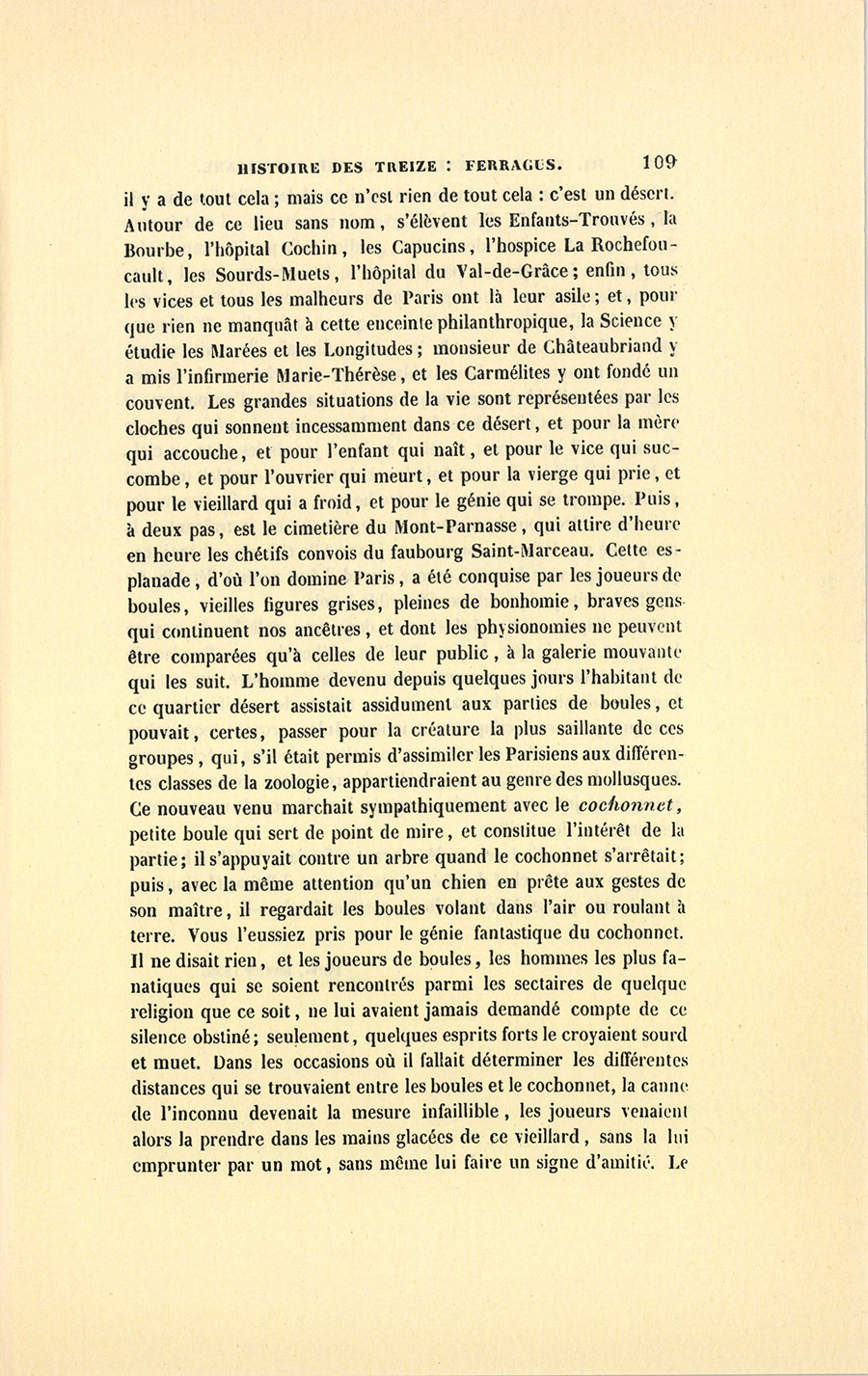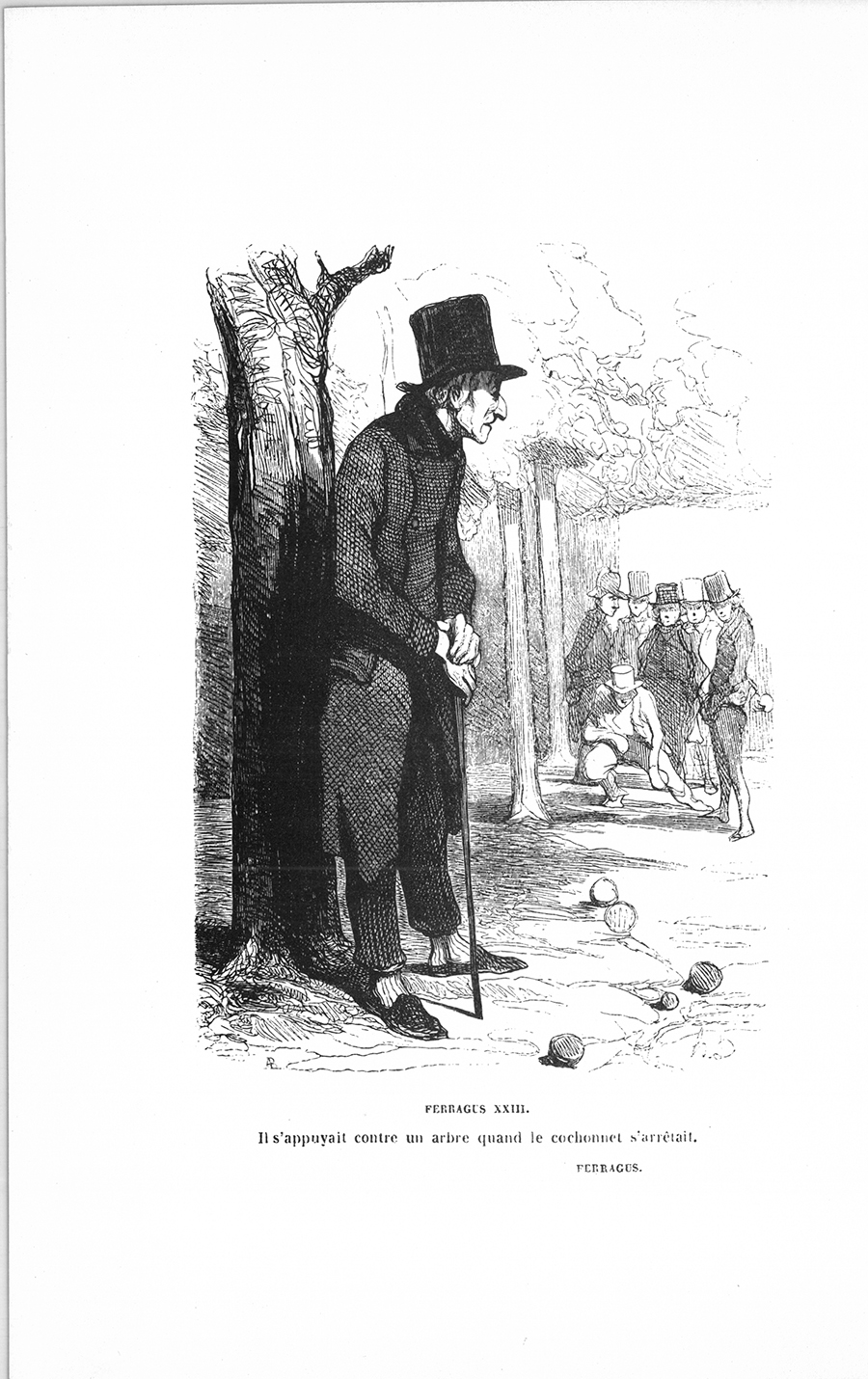 Qui n’a pas rencontré sur les boulevards de Paris, au détour d’une rue ou sous les arcades du Palais-Royal, enfin en quelque lieu du monde où le hasard veuille le présenter, un être, un homme ou femme, à l’aspect duquel mille pensées confuses naissent en {p. 108} l’esprit ! À son aspect, nous sommes subitement intéressés ou par des traits dont la conformation bizarre annonce une vie agitée, ou par l’ensemble curieux que présentent les gestes, l’air, la démarche et les vêtements, ou par quelque regard profond, ou par d’autres je ne sais quoi qui saisissent fortement et tout à coup, sans que nous nous expliquions bien précisément la cause de notre émotion. Puis, le lendemain, d’autres pensées, d’autres images parisiennes emportent ce rêve passager. Mais si nous rencontrons encore le même personnage, soit passant à heure fixe, comme un employé de Mairie qui appartient au mariage pendant huit heures, soit errant dans les promenades, comme ces gens qui semblent être un mobilier acquis aux rues de Paris, et que l’on retrouve dans les lieux publics, aux premières représentations ou chez les restaurateurs, dont ils sont le plus bel ornement, alors cette créature s’inféode à votre souvenir, et y reste comme un premier volume de roman dont la fin nous échappe. Nous sommes tentés d’interroger cet inconnu, et de lui dire : – Qui êtes-vous ? Pourquoi flânez-vous ? De quel droit avez-vous un col plissé, une canne à pomme d’ivoire, un gilet passé ? Pourquoi ces lunettes bleues à doubles verres, ou pourquoi conservez-vous la cravate des muscadins ? Parmi ces créations errantes, les unes appartiennent à l’espèce des dieux Termes ; elles ne disent rien à l’âme ; elles sont là, voilà tout : pourquoi, personne ne le sait ; c’est de ces figures semblables à celles qui servent de type aux sculpteurs pour les quatre Saisons, pour le Commerce et l’Abondance. Quelques autres, anciens avoués, vieux négociants, antiques généraux, s’en vont, marchent et paraissent toujours arrêtées. Semblables à des arbres qui se trouvent à moitié déracinés au bord d’un fleuve, elles ne semblent jamais faire partie du torrent de Paris, ni de sa foule jeune et active. Il est impossible de savoir si l’on a oublié de les enterrer, ou si elles se sont échappées du cercueil ; elles sont arrivées à un état quasi fossile. Un de ces Melmoth parisiens était venu se mêler depuis quelques jours parmi la population sage et recueillie qui, lorsque le ciel est beau, meuble infailliblement l’espace enfermé entre la grille sud du Luxembourg et la grille nord de l’Observatoire, espace sans genre, espace neutre dans Paris. En effet, là, Paris n’est plus ; et là, Paris est encore. Ce lieu tient à la fois de la place, de la rue, du boulevard, de la fortification, du jardin, de l’avenue, de la route, de la province, de la capitale ; certes, {p. 109} il y a de tout cela ; mais ce n’est rien de tout cela : c’est un désert. Autour de ce lieu sans nom, s’élèvent les Enfants-Trouvés, la Bourbe, l’hôpital Cochin, les Capucins, l’hospice La Rochefoucault, les Sourds-Muets, l’hôpital du Val-de-Grâce ; enfin, tous les vices et tous les malheurs de Paris ont là leur asile ; et, pour que rien ne manquât à cette enceinte philanthropique, la Science y étudie les Marées et les Longitudes ; monsieur de Châteaubriand y a mis l’infirmerie Marie-Thérèse, et les Carmélites y ont fondé un couvent. Les grandes situations de la vie sont représentées par les cloches qui sonnent incessamment dans ce désert, et pour la mère qui accouche, et pour l’enfant qui naît, et pour le vice qui succombe, et pour l’ouvrier qui meurt, et pour la vierge qui prie, et pour le vieillard qui a froid, et pour le génie qui se trompe. Puis, à deux pas, est le cimetière du Mont-Parnasse, qui attire d’heure en heure les chétifs convois du faubourg Saint-Marceau. Cette esplanade, d’où l’on domine Paris, a été conquise par les joueurs de boules, vieilles figures grises, pleines de bonhomie, braves gens qui continuent nos ancêtres, et dont les physionomies ne peuvent être comparées qu’à celles de leur public, à la galerie mouvante qui les suit. L’homme devenu depuis quelques jours l’habitant de ce quartier désert assistait assidument aux parties de boules, et pouvait, certes, passer pour la créature la plus saillante de ces groupes, qui, s’il était permis d’assimiler les Parisiens aux différentes classes de la zoologie, appartiendraient au genre des mollusques. Ce nouveau venu marchait sympathiquement avec le cochonnet, petite boule qui sert de point de mire, et constitue l’intérêt de la partie ; il s’appuyait contre un arbre quand le cochonnet s’arrêtait ; puis, avec la même attention qu’un chien en prête aux gestes de son maître, il regardait les boules volant dans l’air ou roulant à terre. [ill.] Vous l’eussiez pris pour le génie fantastique du cochonnet. Il ne disait rien, et les joueurs de boules, les hommes les plus fanatiques qui se soient rencontrés parmi les sectaires de quelque religion que ce soit, ne lui avaient jamais demandé compte de ce silence obstiné ; seulement, quelques esprits forts le croyaient sourd et muet. Dans les occasions où il fallait déterminer les différentes distances qui se trouvaient entre les boules et le cochonnet, la canne de l’inconnu devenait la mesure infaillible, les joueurs venaient alors la prendre dans les mains glacées de ce vieillard, sans la lui emprunter par un mot, sans même lui faire un signe d’amitié. Le {p. 110} prêt de sa canne était comme une servitude à laquelle il avait négativement consenti. Quand il survenait une averse, il restait près du cochonnet, esclave des boules, gardien de la partie commencée. La pluie ne le surprenait pas plus que le beau temps, et il était, comme les joueurs, une espèce intermédiaire entre le