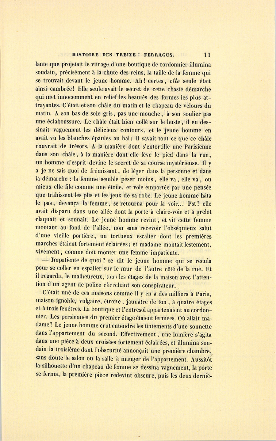 C’était une de ces maisons comme il y en a des milliers à Paris, maison ignoble, vulgaire, étroite, jaunâtre de ton, à quatre étages et à trois fenêtres. La boutique et l’entresol appartenaient au cordonnier. Les persiennes du premier étage étaient fermées. Où allait madame ? Le jeune homme crut entendre les tintements d’une sonnette dans l’appartement du second. Effectivement, une lumière s’agita dans une pièce à deux croisées fortement éclairées, et illumina soudain la troisième dont l’obscurité annonçait une première chambre, sans doute le salon ou la salle à manger de l’appartement. Aussitôt la silhouette d’un chapeau de femme se dessina vaguement, la porte se ferma, la première pièce redevint obscure, puis les deux {p. 12} dernières croisées reprirent leurs teintes rouges. Là, le jeune homme entendit : Gare, et reçut un coup à l’épaule.