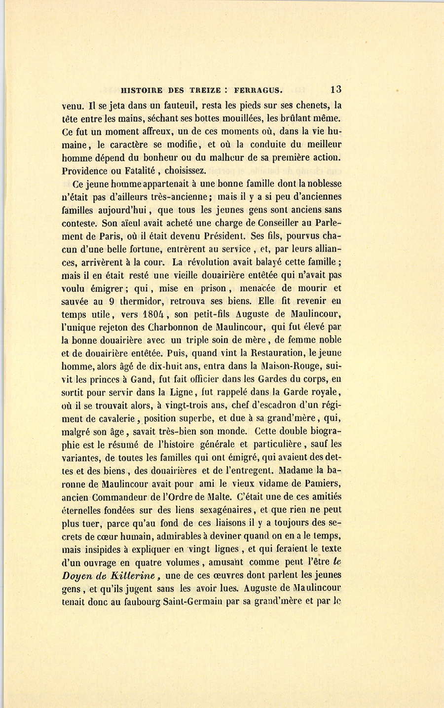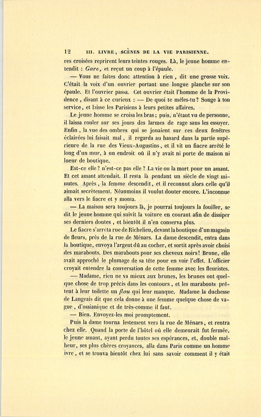 Puis la dame tourna lestement vers la rue de Ménars, et rentra chez elle. Quand la porte de l’hôtel où elle demeurait fut fermée, le jeune amant, ayant perdu toutes ses espérances, et, double malheur, ses plus chères croyances, alla dans Paris comme un homme ivre, et se trouva bientôt chez lui sans savoir comment il y était {p. 13} venu. Il se jeta dans un fauteuil, resta les pieds sur ses chenets, la tête entre les mains, séchant ses bottes mouillées, les brûlant même. Ce fut un moment affreux, un de ces moments où, dans la vie humaine, le caractère se modifie, et où la conduite du meilleur homme dépend du bonheur ou du malheur de sa première action. Providence ou Fatalité, choisissez.