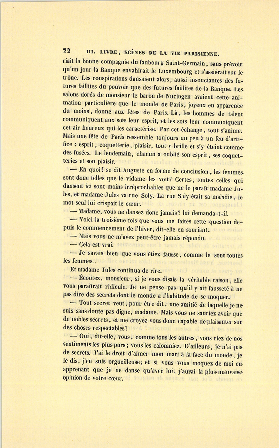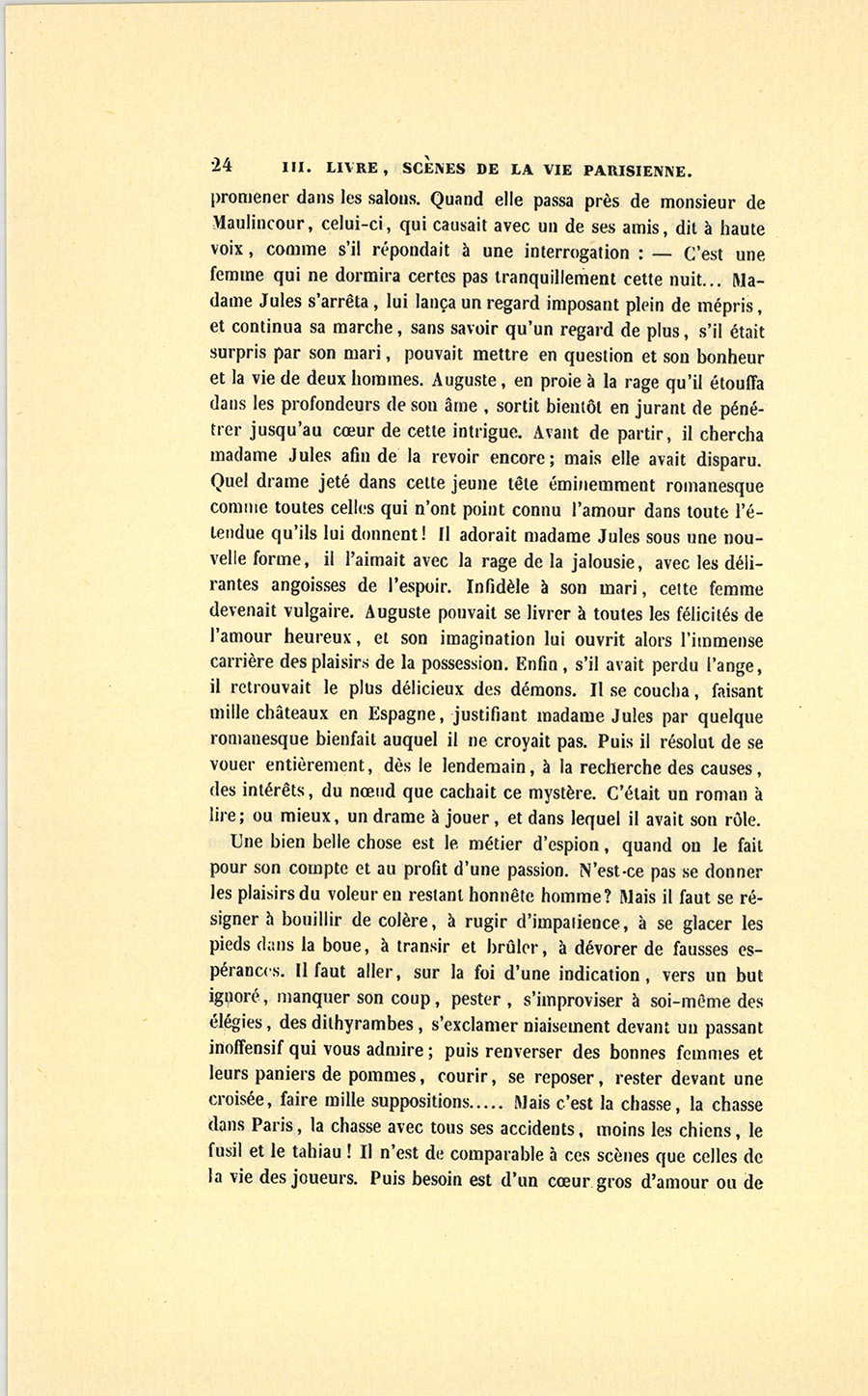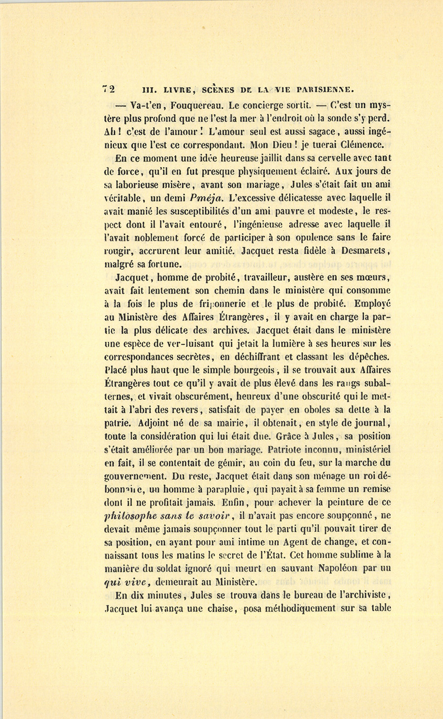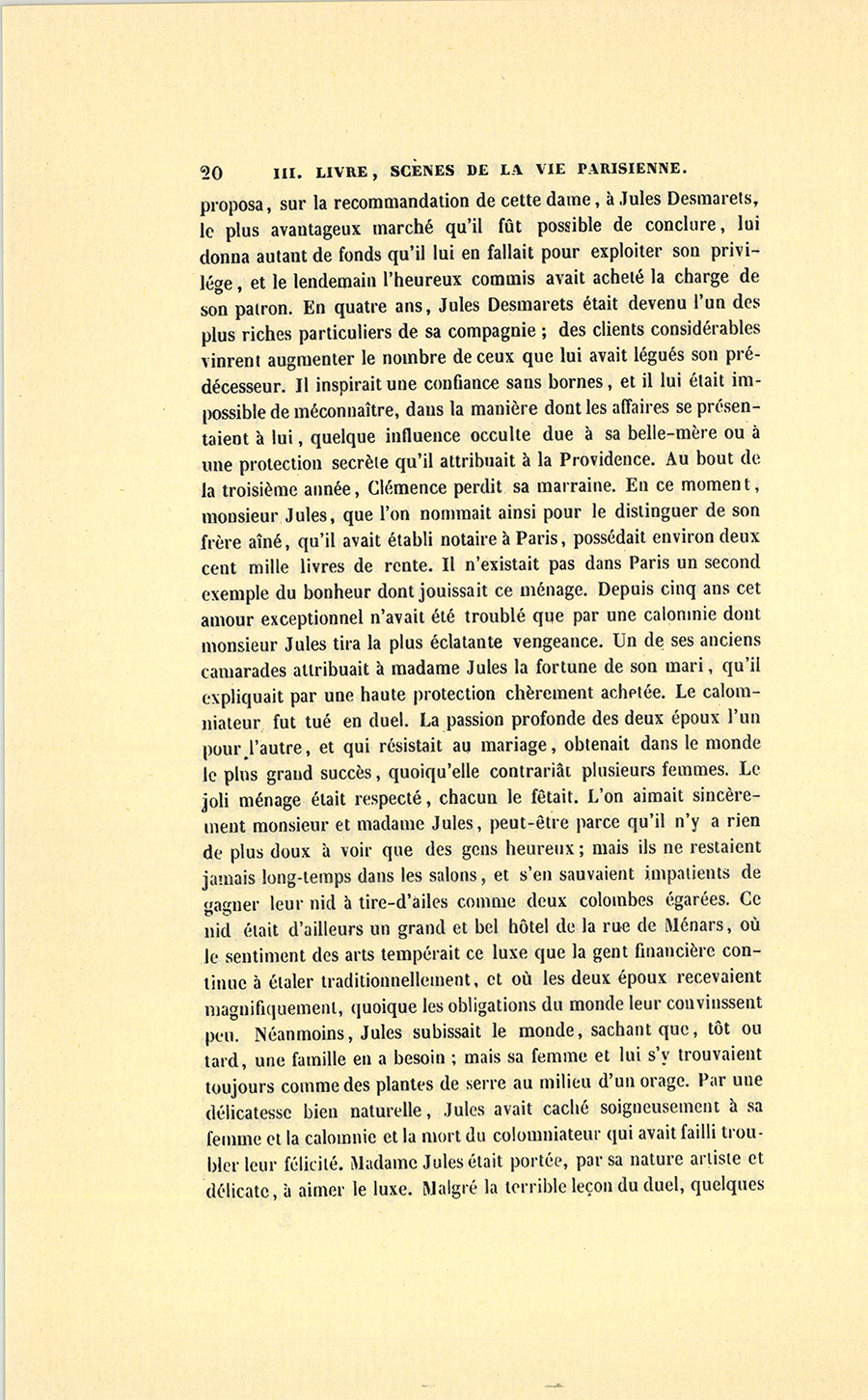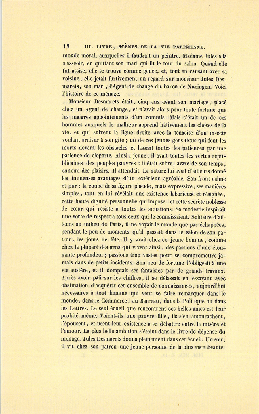 Beaucoup de jeunes gens se sont trouvés ainsi, rentrant chez eux, désespérés d’avoir rompu pour toujours avec une femme adorée en secret ; condamnée, méprisée en secret. C’est des monologues inconnus, dits aux murs d’un réduit solitaire, des orages nés et calmés sans être sortis du fond des cœurs, d’admirables scènes du {p. 18} monde moral, auxquelles il faudrait un peintre. Madame Jules alla s’asseoir, en quittant son mari qui fit le tour du salon. Quand elle fut assise, elle se trouva comme gênée, et, tout en causant avec sa voisine, elle jetait furtivement un regard sur monsieur Jules Desmarets, son mari, l’Agent de change du baron de Nucingen. Voici l’histoire de ce ménage.