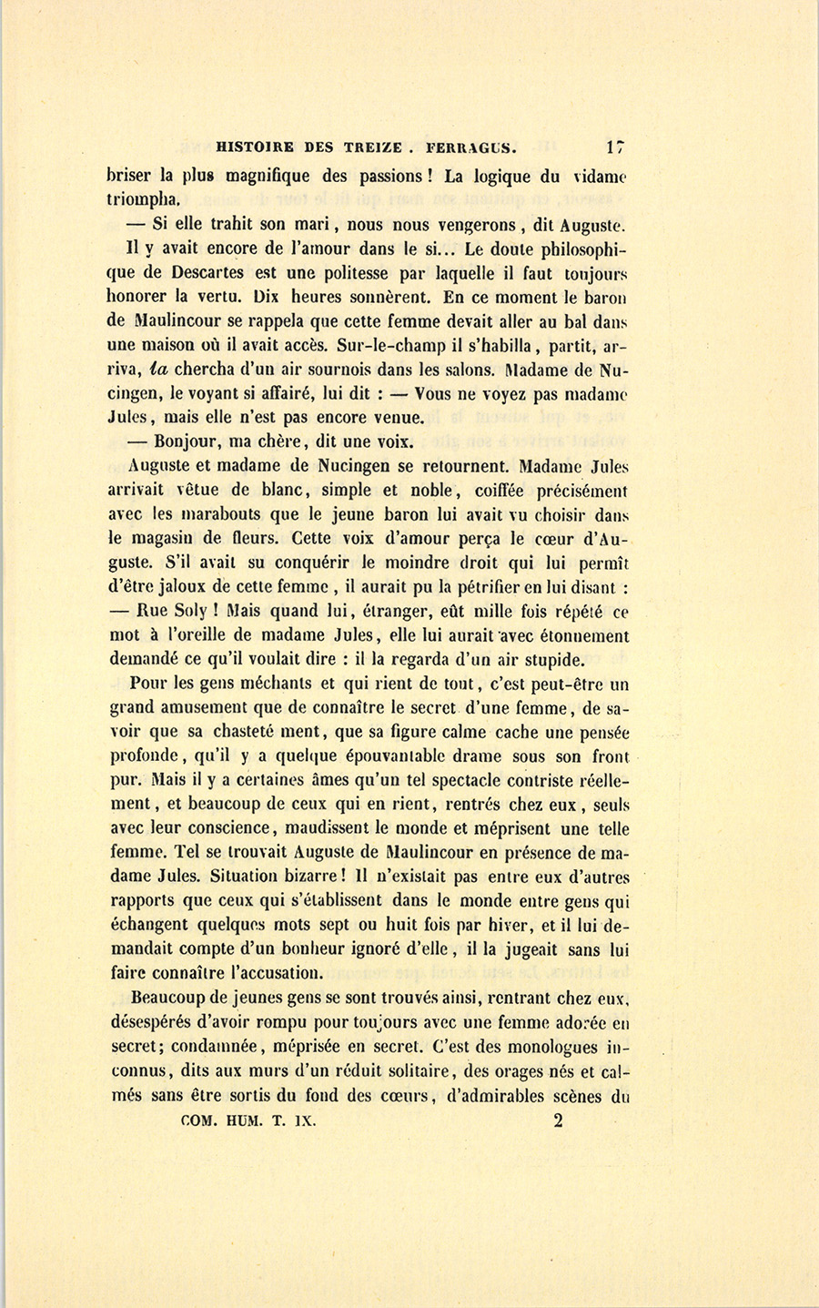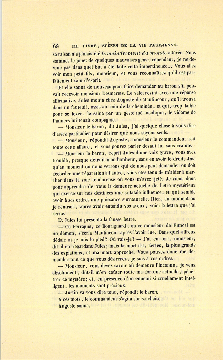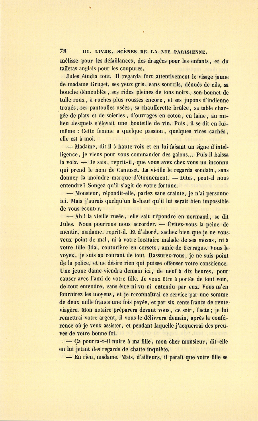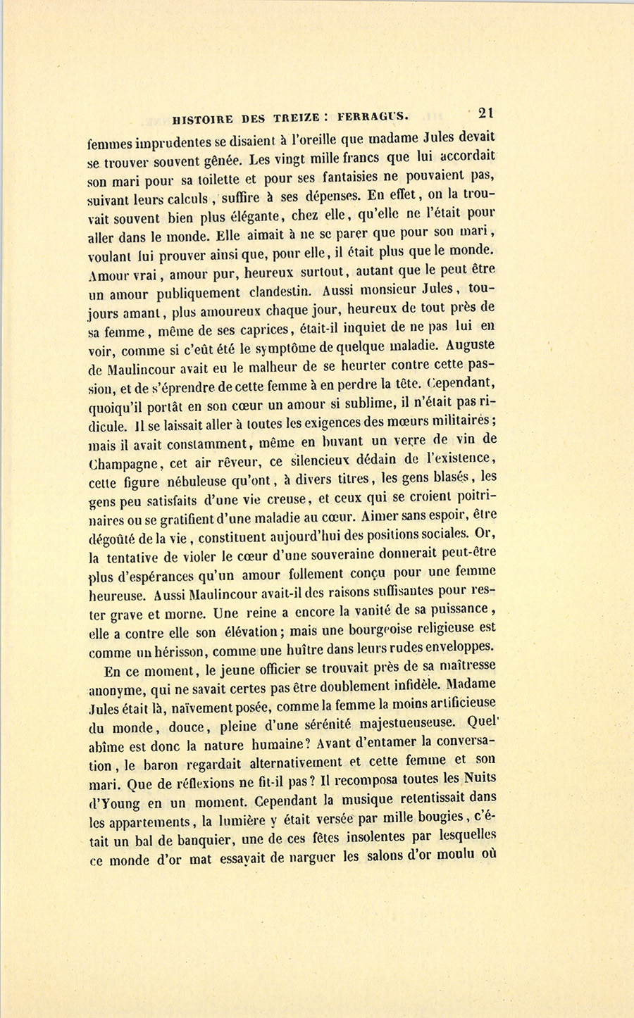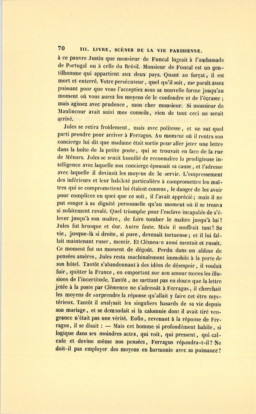 Beaucoup de jeunes gens se sont trouvés ainsi, rentrant chez eux, désespérés d’avoir rompu pour toujours avec une femme adorée en secret ; condamnée, méprisée en secret. C’est des monologues inconnus, dits aux murs d’un réduit solitaire, des orages nés et calmés sans être sortis du fond des cœurs, d’admirables scènes du {p. 18} monde moral, auxquelles il faudrait un peintre. Madame Jules alla s’asseoir, en quittant son mari qui fit le tour du salon. Quand elle fut assise, elle se trouva comme gênée, et, tout en causant avec sa voisine, elle jetait furtivement un regard sur monsieur Jules Desmarets, son mari, l’Agent de change du baron de Nucingen. Voici l’histoire de ce ménage.