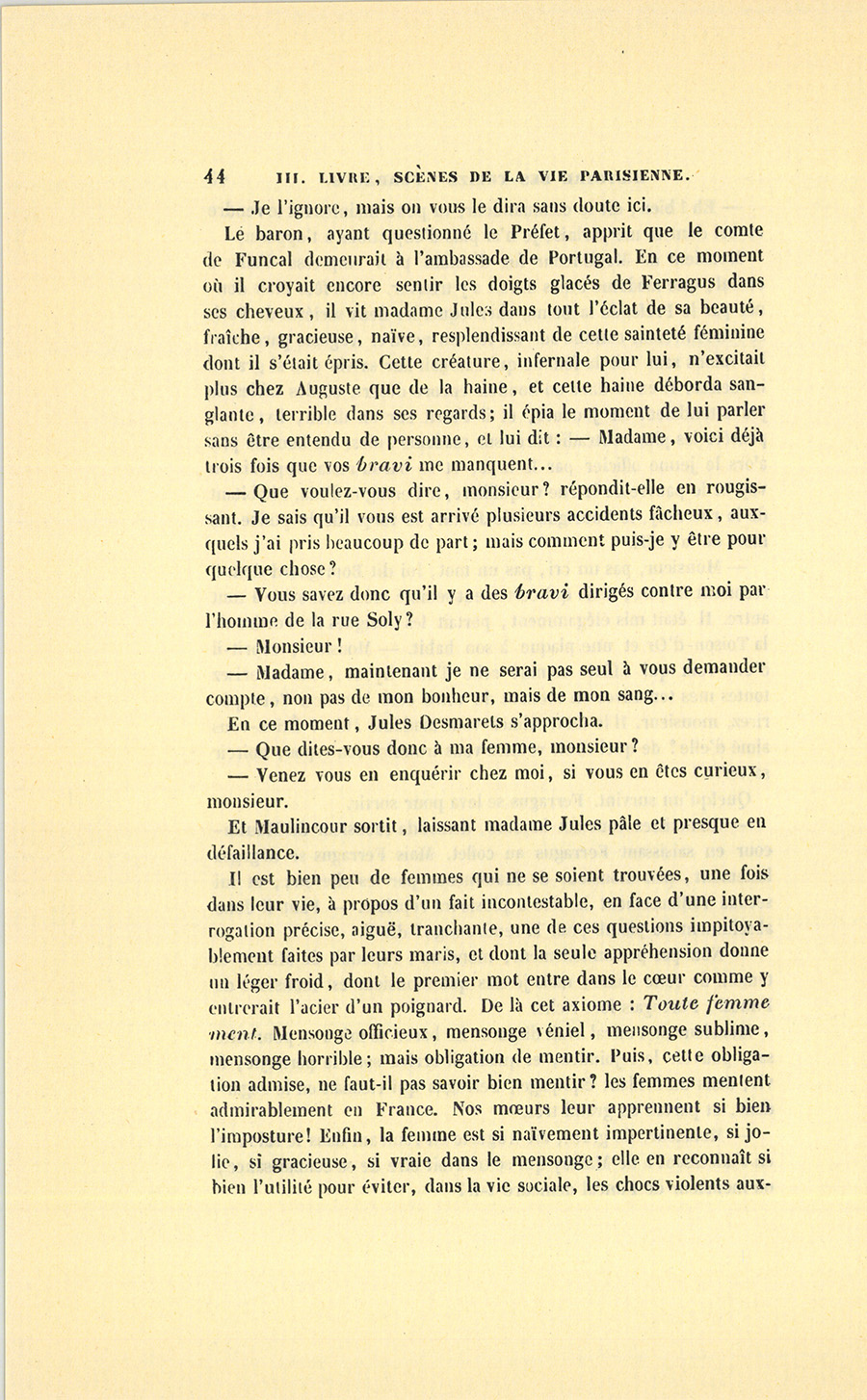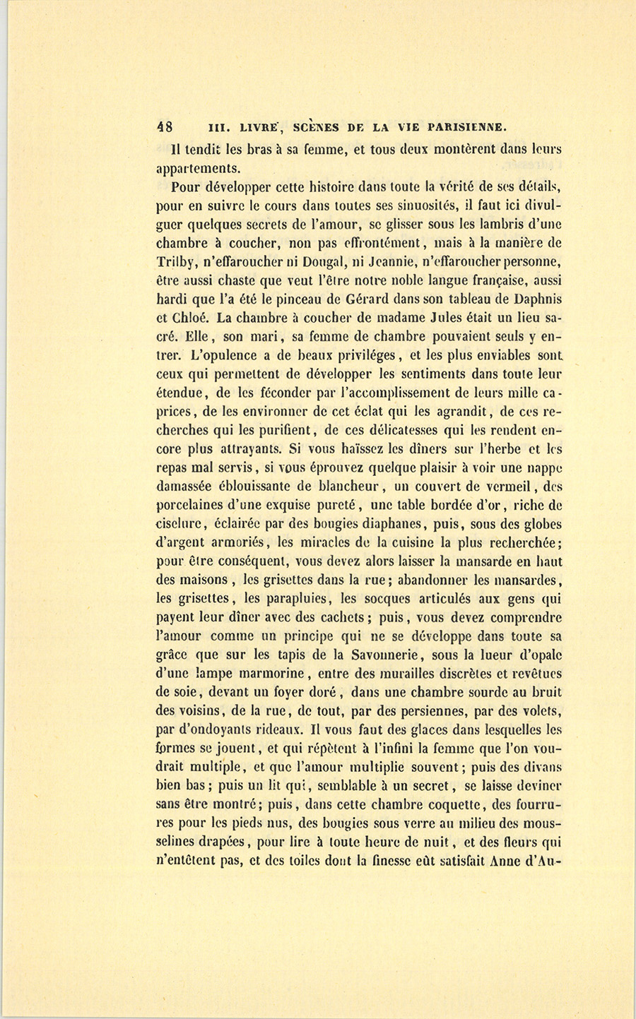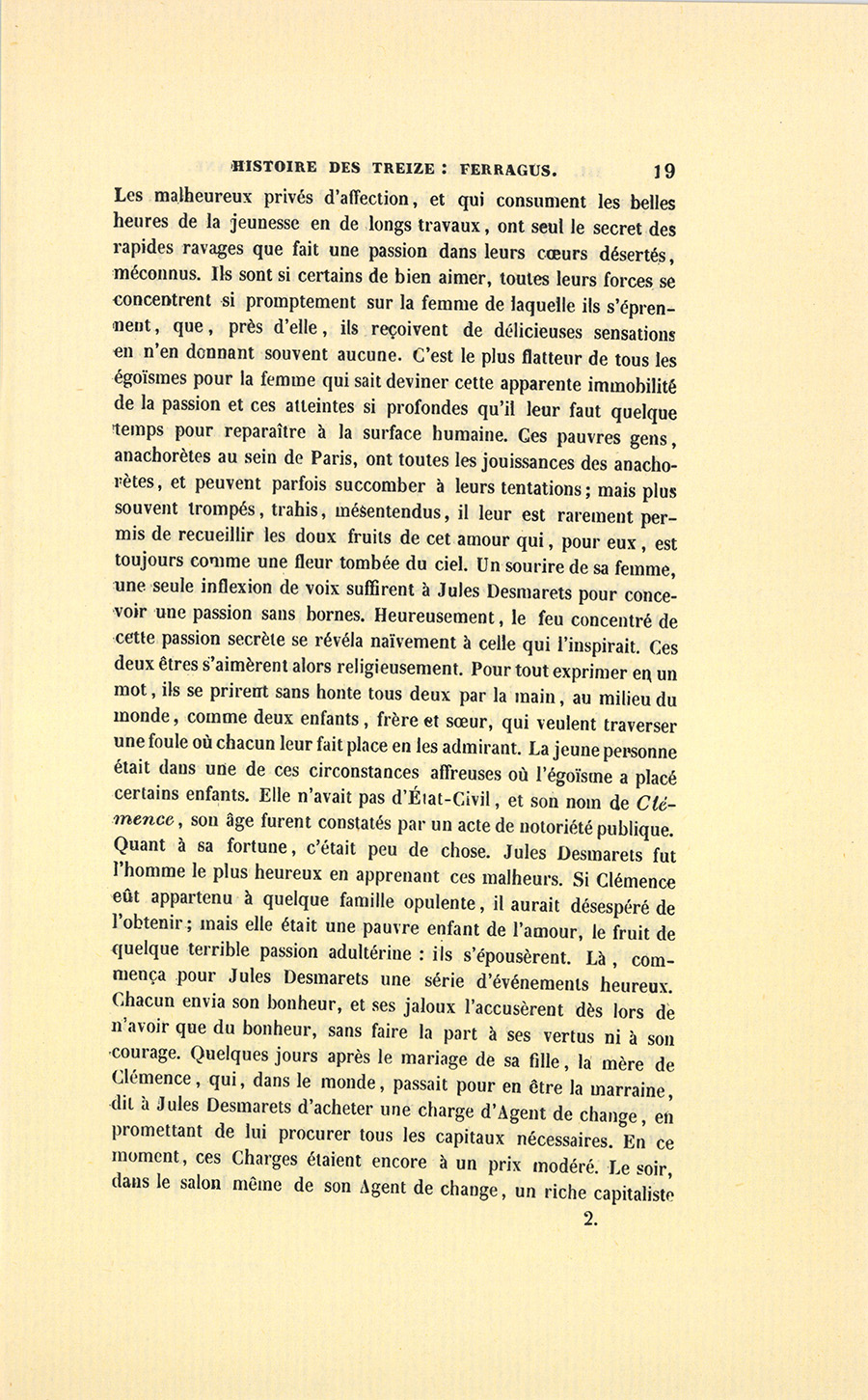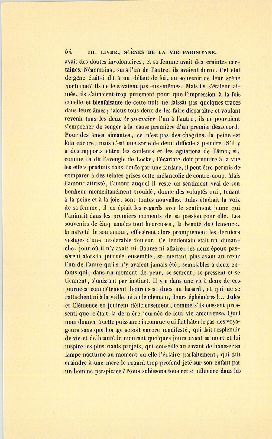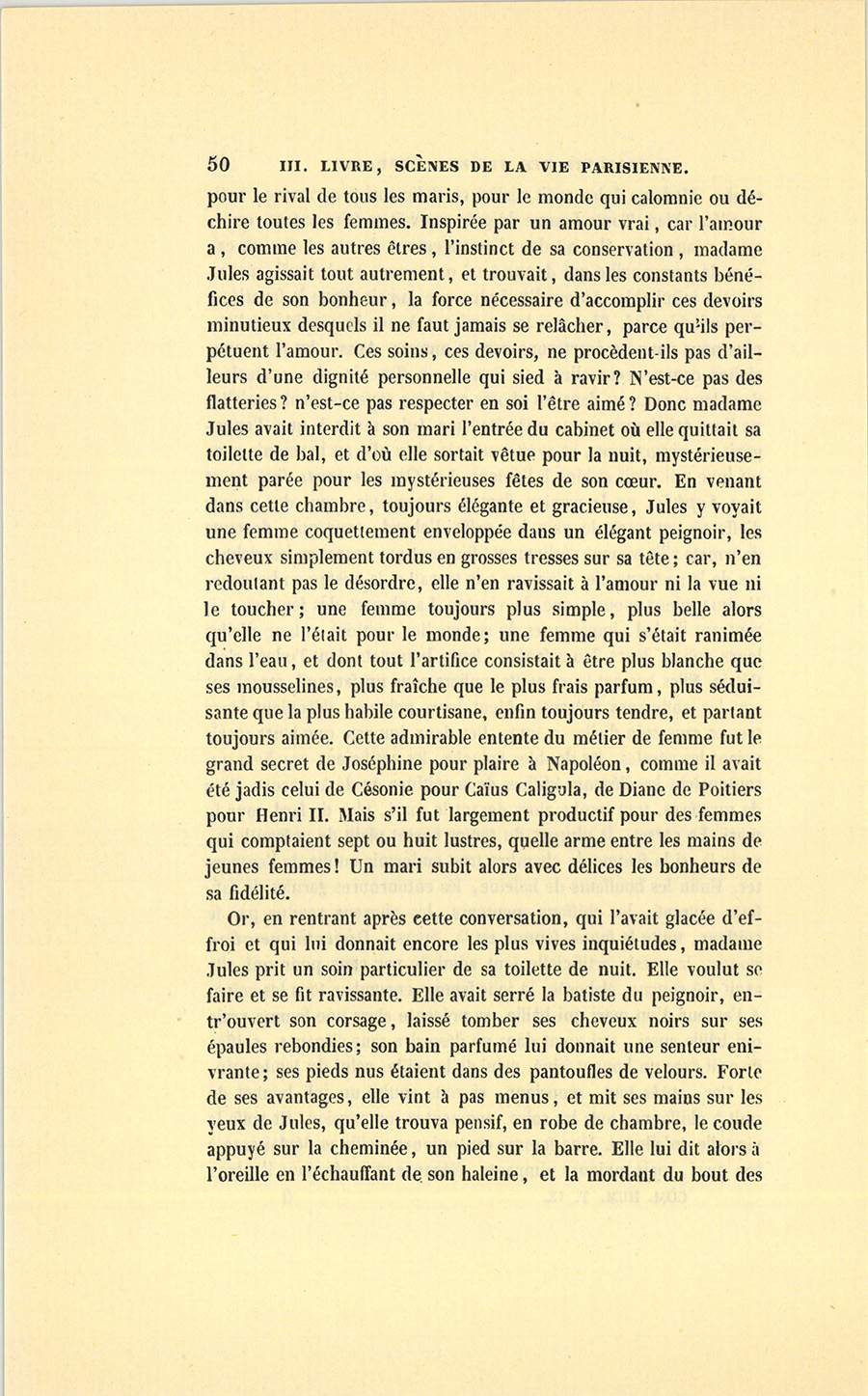 Beaucoup de jeunes gens se sont trouvés ainsi, rentrant chez eux, désespérés d’avoir rompu pour toujours avec une femme adorée en secret ; condamnée, méprisée en secret. C’est des monologues inconnus, dits aux murs d’un réduit solitaire, des orages nés et calmés sans être sortis du fond des cœurs, d’admirables scènes du {p. 18} monde moral, auxquelles il faudrait un peintre. Madame Jules alla s’asseoir, en quittant son mari qui fit le tour du salon. Quand elle fut assise, elle se trouva comme gênée, et, tout en causant avec sa voisine, elle jetait furtivement un regard sur monsieur Jules Desmarets, son mari, l’Agent de change du baron de Nucingen. Voici l’histoire de ce ménage.