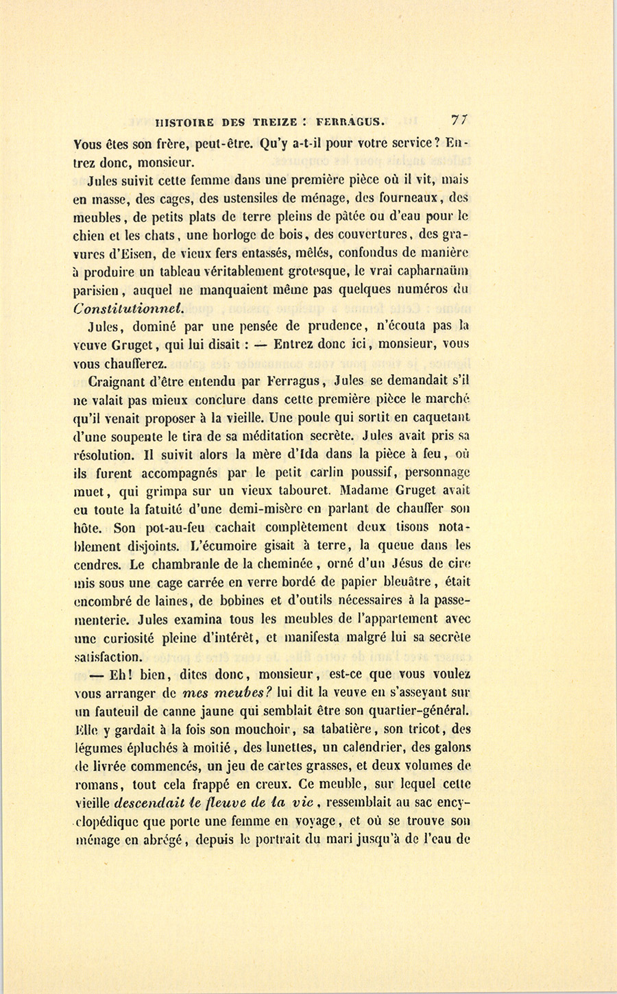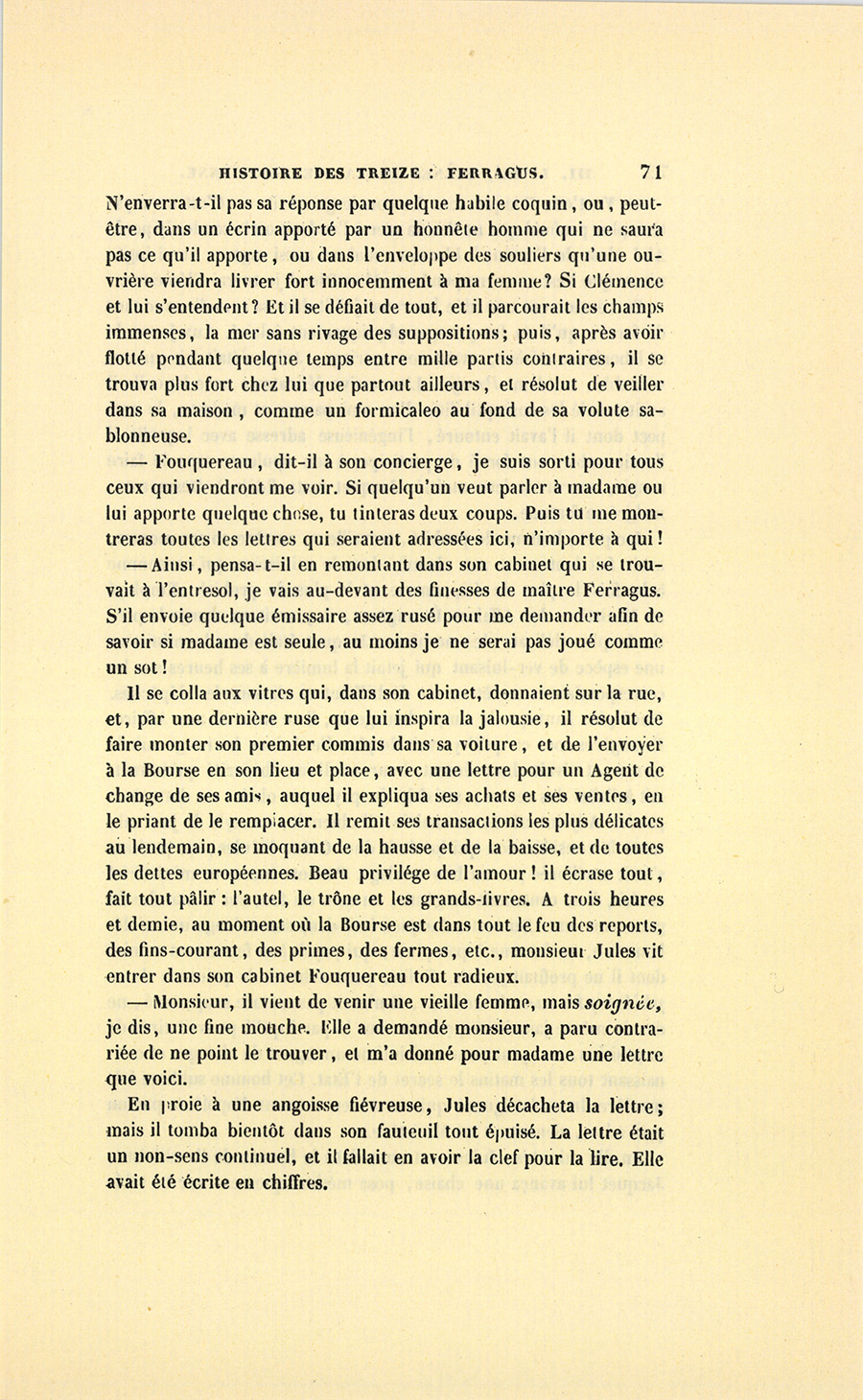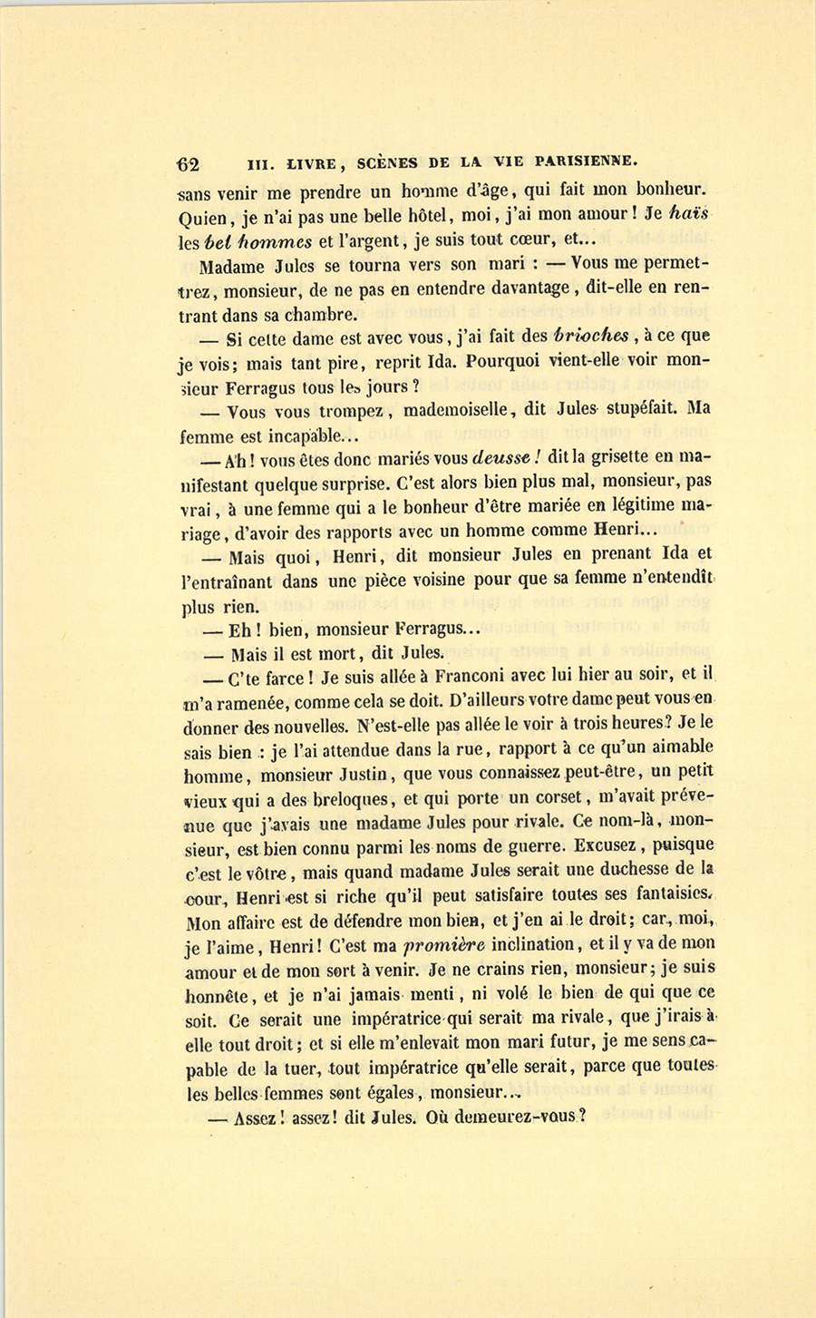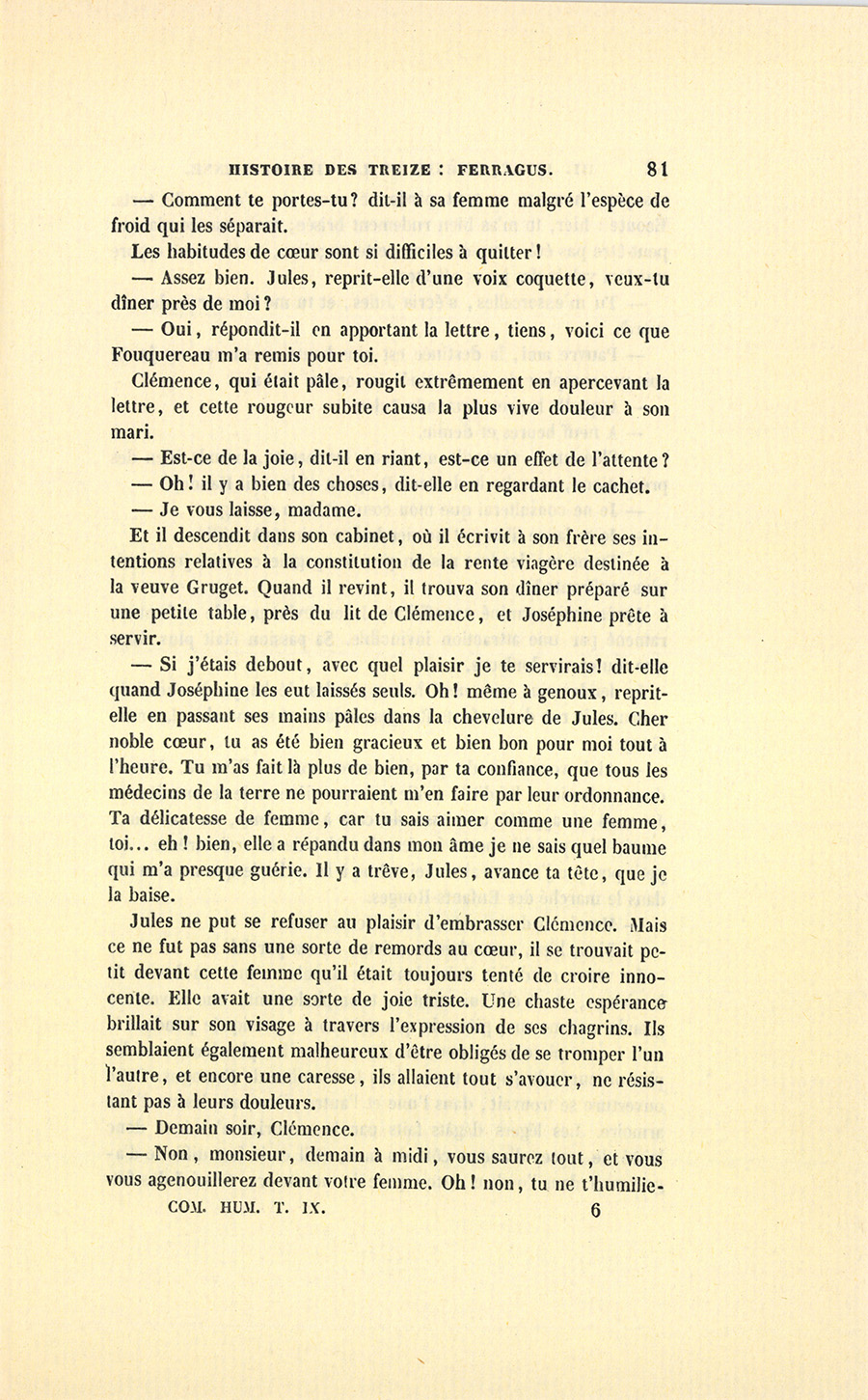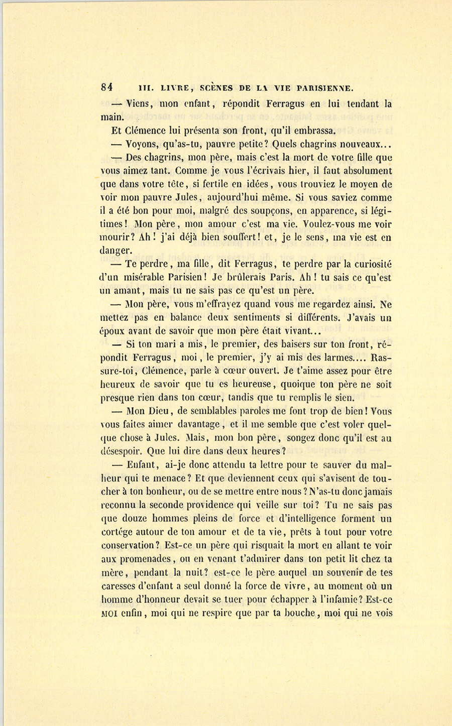 Beaucoup de jeunes gens se sont trouvés ainsi, rentrant chez eux, désespérés d’avoir rompu pour toujours avec une femme adorée en secret ; condamnée, méprisée en secret. C’est des monologues inconnus, dits aux murs d’un réduit solitaire, des orages nés et calmés sans être sortis du fond des cœurs, d’admirables scènes du {p. 18} monde moral, auxquelles il faudrait un peintre. Madame Jules alla s’asseoir, en quittant son mari qui fit le tour du salon. Quand elle fut assise, elle se trouva comme gênée, et, tout en causant avec sa voisine, elle jetait furtivement un regard sur monsieur Jules Desmarets, son mari, l’Agent de change du baron de Nucingen. Voici l’histoire de ce ménage.
