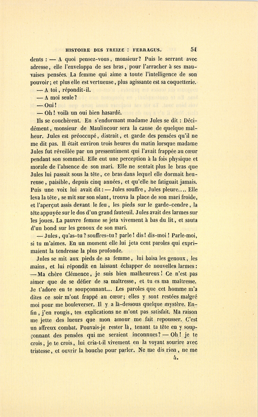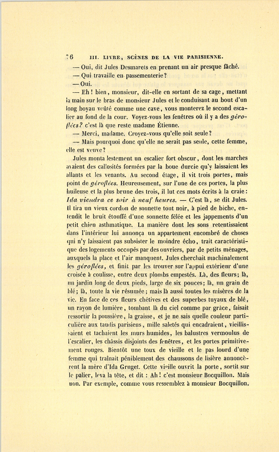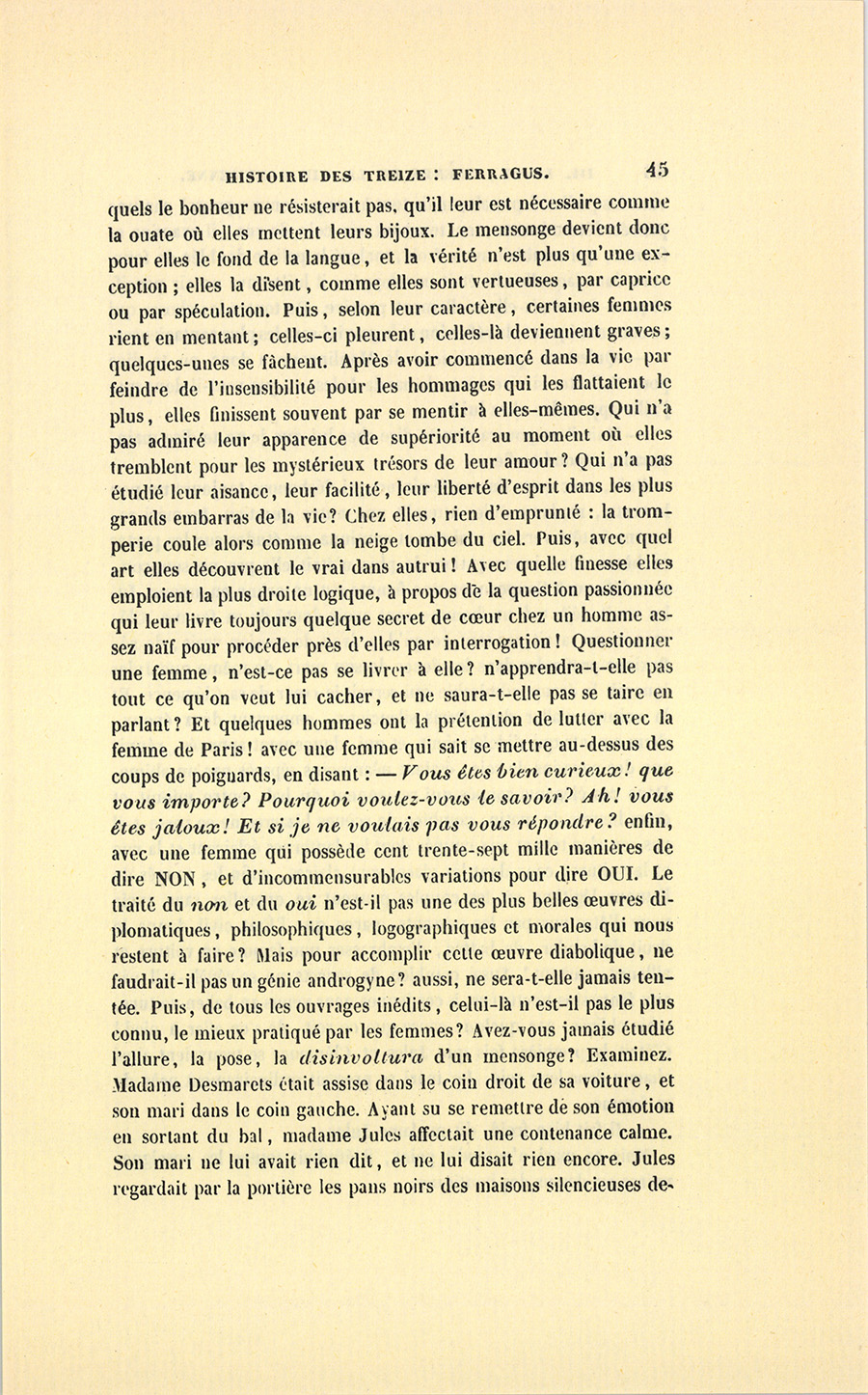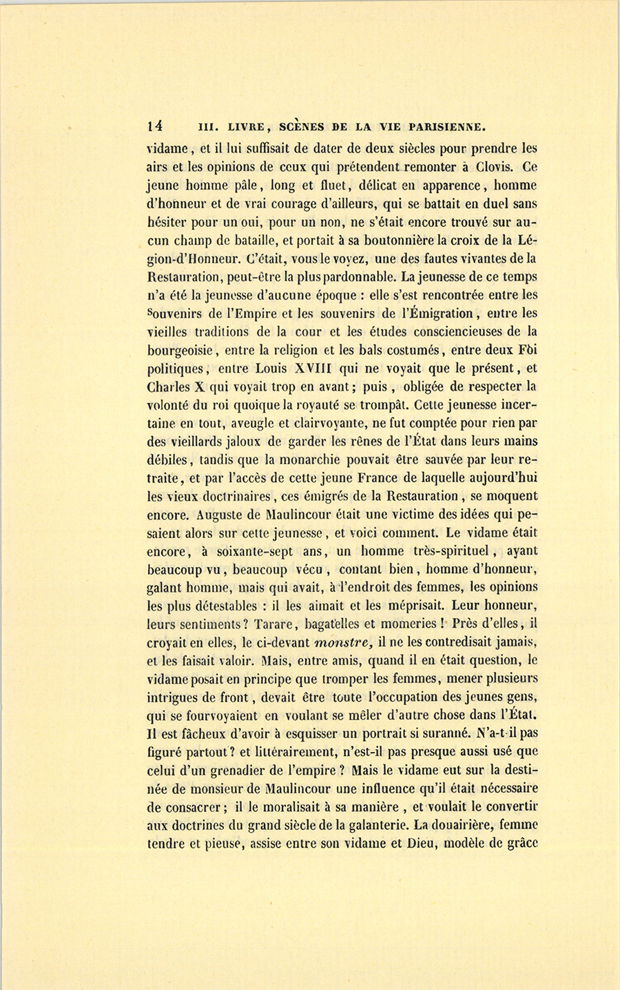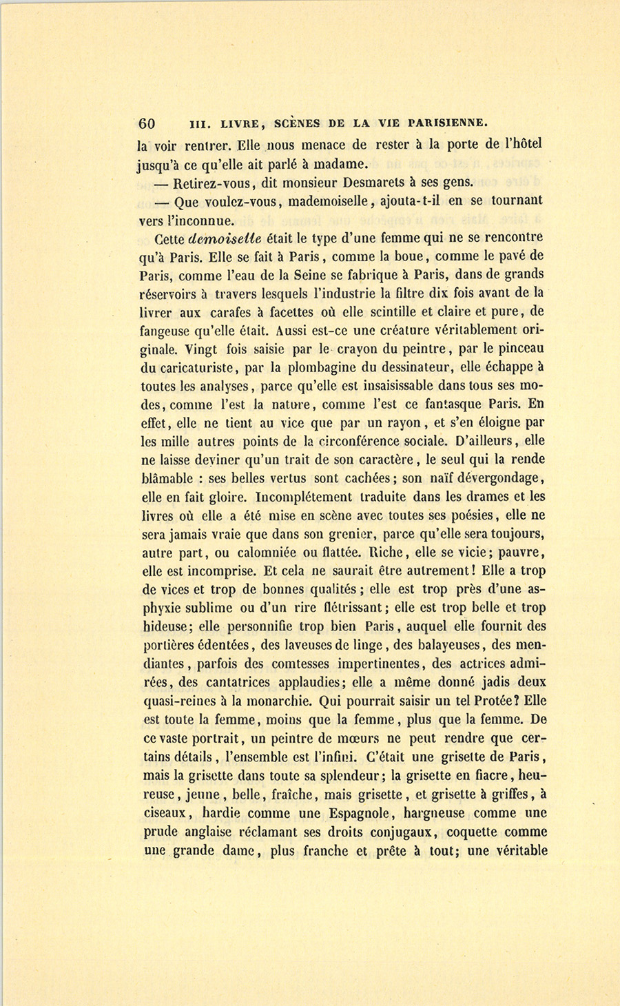 Beaucoup de jeunes gens se sont trouvés ainsi, rentrant chez eux, désespérés d’avoir rompu pour toujours avec une femme adorée en secret ; condamnée, méprisée en secret. C’est des monologues inconnus, dits aux murs d’un réduit solitaire, des orages nés et calmés sans être sortis du fond des cœurs, d’admirables scènes du {p. 18} monde moral, auxquelles il faudrait un peintre. Madame Jules alla s’asseoir, en quittant son mari qui fit le tour du salon. Quand elle fut assise, elle se trouva comme gênée, et, tout en causant avec sa voisine, elle jetait furtivement un regard sur monsieur Jules Desmarets, son mari, l’Agent de change du baron de Nucingen. Voici l’histoire de ce ménage.