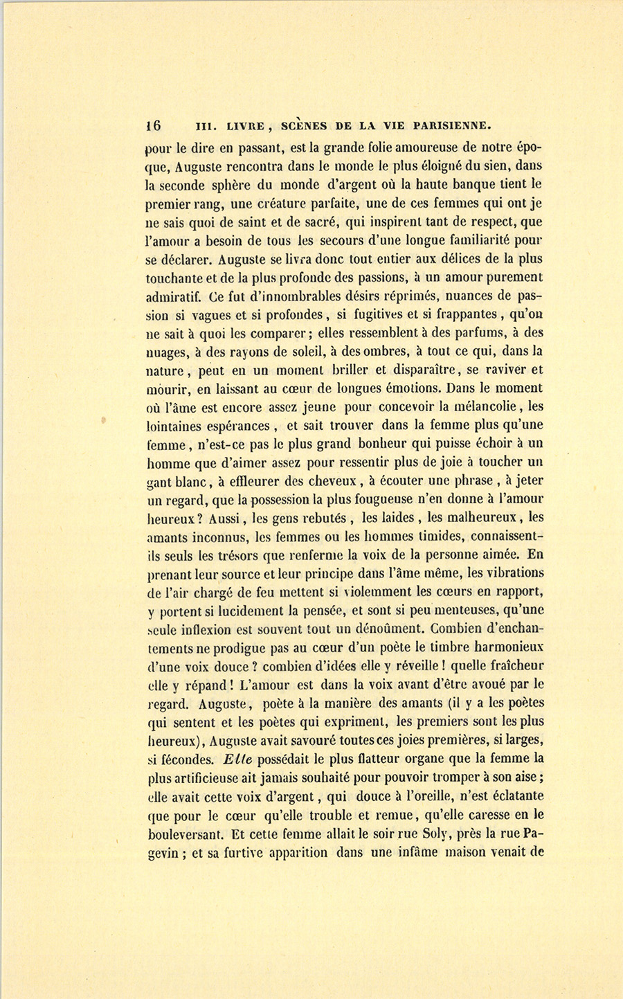 Au milieu des secrets désastres de son cœur, pendant qu’il cherchait une femme par laquelle il pût être compris, recherche qui, {p. 16} pour le dire en passant, est la grande folie amoureuse de notre époque, Auguste rencontra dans le monde le plus éloigné du sien, dans la seconde sphère du monde d’argent où la haute banque tient le premier rang, une créature parfaite, une de ces femmes qui ont je ne sais quoi de saint et de sacré, qui inspirent tant de respect, que l’amour a besoin de tous les secours d’une longue familiarité pour se déclarer. Auguste se livra donc tout entier aux délices de la plus touchante et de la plus profonde des passions, à un amour purement admiratif. Ce fut d’innombrables désirs réprimés, nuances de passion si vagues et si profondes, si fugitives et si frappantes, qu’on ne sait à quoi les comparer ; elles ressemblent à des parfums, à des nuages, à des rayons de soleil, à des ombres, à tout ce qui, dans la nature, peut en un moment briller et disparaître, se raviver et mourir, en laissant au cœur de longues émotions. Dans le moment où l’âme est encore assez jeune pour concevoir la mélancolie, les lointaines espérances, et sait trouver dans la femme plus qu’une femme, n’est-ce pas le plus grand bonheur qui puisse échoir à un homme que d’aimer assez pour ressentir plus de joie à toucher un gant blanc, à effleurer des cheveux, à écouter une phrase, à jeter un regard, que la possession la plus fougueuse n’en donne à l’amour heureux ? Aussi, les gens rebutés, les laides, les malheureux, les amants inconnus, les femmes ou les hommes timides, connaissent-ils seuls les trésors que renferme la voix de la personne aimée. En prenant leur source et leur principe dans l’âme même, les vibrations de l’air chargé de feu mettent si violemment les cœurs en rapport, y portent si lucidement la pensée, et sont si peu menteuses, qu’une seule inflexion est souvent tout un dénoûment. Combien d’enchantements ne prodigue pas au cœur d’un poète le timbre harmonieux d’une voix douce ? combien d’idées elle y réveille ! quelle fraîcheur elle y répand ! L’amour est dans la voix avant d’être avoué par le regard. Auguste, poète à la manière des amants (il y a les poètes qui sentent et les poètes qui expriment, les premiers sont les plus heureux), Auguste avait savouré toutes ces joies premières, si larges, si fécondes. Elle possédait le plus flatteur organe que la femme la plus artificieuse ait jamais souhaité pour pouvoir tromper à son aise ; elle avait cette voix d’argent, qui douce à l’oreille, n’est éclatante que pour le cœur qu’elle trouble et remue, qu’elle caresse en le bouleversant. Et cette femme allait le soir rue Soly, près la rue Pagevin ; et sa furtive apparition dans une infâme maison venait de {p. 17} briser la plus magnifique des passions ! La logique du vidame triompha.