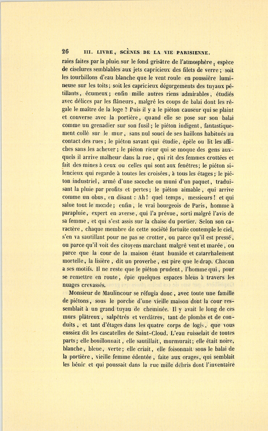 Dans les premiers jours du mois de mars, au milieu des plans qu’il méditait pour frapper un grand coup, et en quittant son échiquier après une de ces factions assidues qui ne lui avaient encore rien appris, il s’en retournait vers quatre heures à son hôtel où l’appelait une affaire relative à son service, lorsqu’il fut pris, rue Coquillière, par une de ces belles pluies qui grossissent tout à coup les ruisseaux, et dont chaque goutte fait cloche en tombant sur les flaques d’eau de la voie publique. Un fantassin de Paris est alors obligé de s’arrêter tout court, de se réfugier dans une boutique ou dans un café, s’il est assez riche pour y payer son hospitalité forcée ; ou, selon l’urgence, sous une porte cochère, asile des gens pauvres ou mal mis. Comment aucun de nos peintres n’a-t-il pas encore essayé de reproduire la physionomie d’un essaim de Parisiens groupés, par un temps d’orage, sous le porche humide d’une maison ? Où rencontrer un plus riche tableau ? N’y a-t-il pas d’abord le piéton rêveur ou philosophe qui observe avec plaisir, soit les {p. 26} raies faites par la pluie sur le fond grisâtre de l’atmosphère, espèce de ciselures semblables aux jets capricieux des filets de verre ; soit les tourbillons d’eau blanche que le vent roule en poussière lumineuse sur les toits ; soit les capricieux dégorgements des tuyaux pétillants, écumeux ; enfin mille autres riens admirables, étudiés avec délices par les flâneurs, malgré les coups de balai dont les régale le maître de la loge ? Puis il y a le piéton causeur qui se plaint et converse avec la portière, quand elle se pose sur son balai comme un grenadier sur son fusil ; le piéton indigent, fantastiquement collé sur le mur, sans nul souci de ses haillons habitués au contact des rues ; le piéton savant qui étudie, épèle ou lit les affiches sans les achever ; le piéton rieur qui se moque des gens auxquels il arrive malheur dans la rue, qui rit des femmes crottées et fait des mines à ceux ou celles qui sont aux fenêtres ; le piéton silencieux qui regarde à toutes les croisées, à tous les étages ; le piéton industriel, armé d’une sacoche ou muni d’un paquet, traduisant la pluie par profits et pertes ; le piéton aimable, qui arrive comme un obus, en disant : Ah ! quel temps, messieurs ! et qui salue tout le monde ; enfin, le vrai bourgeois de Paris, homme à parapluie, expert en averse, qui l’a prévue, sorti malgré l’avis de sa femme, et qui s’est assis sur la chaise du portier. Selon son caractère, chaque membre de cette société fortuite contemple le ciel, s’en va sautillant pour ne pas se crotter, ou parce qu’il est pressé, ou parce qu’il voit des citoyens marchant malgré vent et marée, ou parce que la cour de la maison étant humide et catarrhalement mortelle, la lisière, dit un proverbe, est pire que le drap. Chacun a ses motifs. Il ne reste que le piéton prudent, l’homme qui, pour se remettre en route, épie quelques espaces bleus à travers les nuages crevassés.