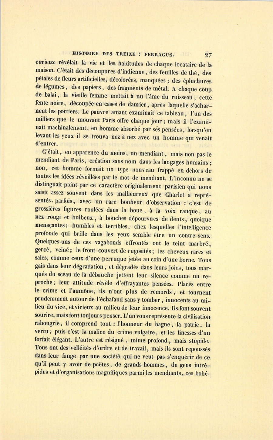 C’était, en apparence du moins, un mendiant, mais non pas le mendiant de Paris, création sans nom dans les langages humains ; non, cet homme formait un type nouveau frappé en dehors de toutes les idées réveillées par le mot de mendiant. L’inconnu ne se distinguait point par ce caractère originalement parisien qui nous saisit assez souvent dans les malheureux que Charlet a représentés parfois, avec un rare bonheur d’observation : c’est de grossières figures roulées dans la boue, à la voix rauque, au nez rougi et bulbeux, à bouches dépourvues de dents, quoique menaçantes ; humbles et terribles, chez lesquelles l’intelligence profonde qui brille dans les yeux semble être un contre-sens. Quelques-uns de ces vagabonds effrontés ont le teint marbré, gercé, veiné ; le front couvert de rugosités ; les cheveux rares et sales, comme ceux d’une perruque jetée au coin d’une borne. Tous gais dans leur dégradation, et dégradés dans leurs joies, tous marqués du sceau de la débauche jettent leur silence comme un reproche ; leur attitude révèle d’effrayantes pensées. Placés entre le crime et l’aumône, ils n’ont plus de remords, et tournent prudemment autour de l’échafaud sans y tomber, innocents au milieu du vice, et vicieux au milieu de leur innocence. Ils font souvent sourire, mais font toujours penser. L’un vous représente la civilisation rabougrie, il comprend tout : l’honneur du bagne, la patrie, la vertu ; puis c’est la malice du crime vulgaire, et les finesses d’un forfait élégant. L’autre est résigné, mime profond, mais stupide. Tous ont des velléités d’ordre et de travail, mais ils sont repoussés dans leur fange par une société qui ne veut pas s’enquérir de ce qu’il peut y avoir de poëtes, de grands hommes, de gens intrépides et d’organisations magnifiques parmi les mendiants, ces {p. 28} bohémiens de Paris ; peuple souverainement bon et souverainement méchant, comme toutes les masses qui ont souffert ; habitué à supporter des maux inouïs, et qu’une fatale puissance maintient toujours au niveau de la boue. Ils ont tous un rêve, une espérance, un bonheur : le jeu, la loterie ou le vin. Il n’y avait rien de cette vie étrange dans le personnage collé fort insouciamment sur le mur, devant monsieur de Maulincour, comme une fantaisie dessinée par un habile artiste derrière quelque toile retournée de son atelier. Cet homme long et sec, dont le visage plombé trahissait une pensée profonde et glaciale, séchait la pitié dans le cœur des curieux, par une attitude pleine d’ironie et par un regard noir qui annonçaient sa prétention de traiter d’égal à égal avec eux. Sa figure était d’un blanc sale, et son crâne ridé, dégarni de cheveux, avait une vague ressemblance avec un quartier de granit. Quelques mèches plates et grises, placées de chaque côté de sa tête, descendaient sur le collet de son habit crasseux et boutonné jusqu’au cou. Il ressemblait tout à la fois à Voltaire et à don Quichotte ; il était railleur et mélancolique, plein de mépris, de philosophie, mais à demi aliéné. Il paraissait ne pas avoir de chemise. Sa barbe était longue. Sa méchante cravate noire tout usée, déchirée, laissait voir un cou protubérant, fortement sillonné, composé de veines grosses comme des cordes. Un large cercle brun, meurtri, se dessinait sous chacun de ses yeux. Il semblait avoir au moins soixante ans. Ses mains étaient blanches et propres. Il portait des bottes éculées et percées. Son pantalon bleu, raccommodé en plusieurs endroits, était blanchi par une espèce de duvet qui le rendait ignoble à voir. Soit que ses vêtements mouillés exhalassent une odeur fétide, soit qu’il eût à l’état normal cette senteur de misère qu’ont les taudis parisiens, de même que les Bureaux, les Sacristies et les Hospices ont la leur, goût fétide et rance, dont rien ne saurait donner l’idée, les voisins de cet homme quittèrent leurs places et le laissèrent seul ; il jeta sur eux, puis reporta sur l’officier son regard calme et sans expression, le regard si célèbre de monsieur de Talleyrand, coup d’œil terne et sans chaleur, espèce de voile impénétrable sous lequel une âme forte cache de profondes émotions et les plus exacts calculs sur les hommes, les choses et les événements. Aucun pli de son visage ne se creusa. Sa bouche et son front furent impassibles ; mais ses yeux s’abaissèrent par un mouvement d’une lenteur noble et presque tragique. Il y {p. 29} eut enfin tout un drame dans le mouvement de ses paupières flétries.