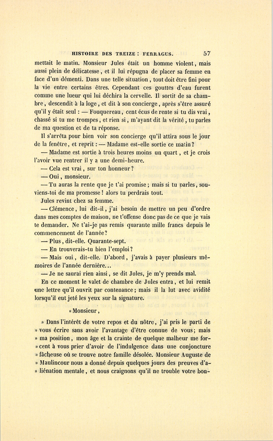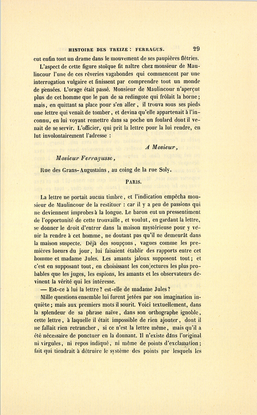 Mille questions ensemble lui furent jetées par son imagination inquiète ; mais aux premiers mots il sourit. Voici textuellement, dans la splendeur de sa phrase naïve, dans son orthographe ignoble, cette lettre, à laquelle il était impossible de rien ajouter, dont il ne fallait rien retrancher, si ce n’est la lettre même, mais qu’il a été nécessaire de ponctuer en la donnant. Il n’existe dans l’original ni virgules, ni repos indiqué, ni même de points d’exclamation ; fait qui tiendrait à détruire le système des points par lesquels les {p. 30} auteurs modernes ont essayé de peindre les grands désastres de toutes les passions.