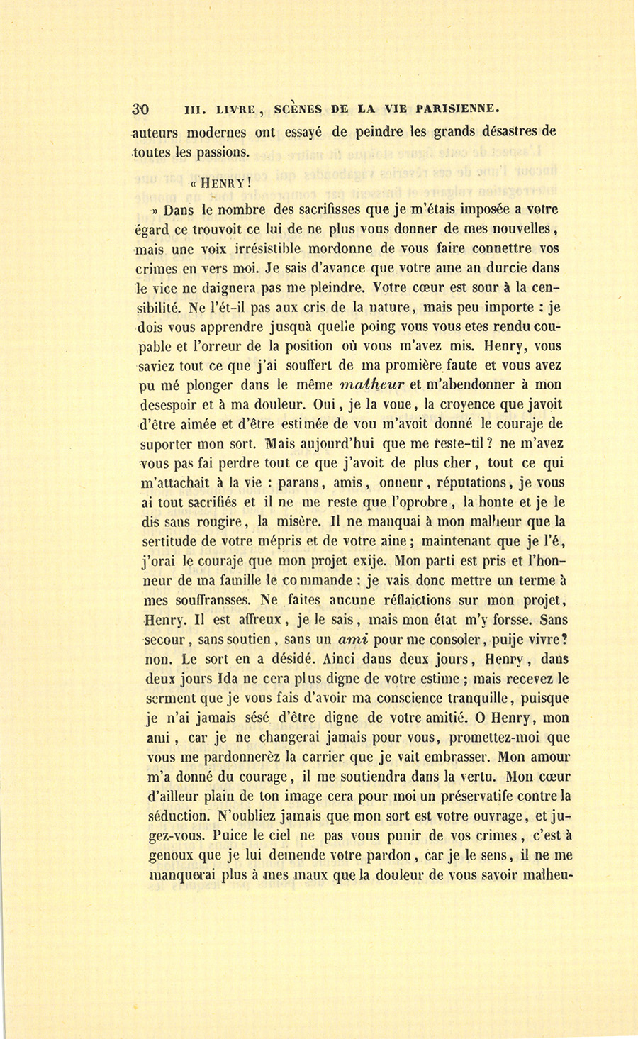 Dans le nombre des sacrifisses que je m’étais imposée a votre égard ce trouvoit ce lui de ne plus vous donner de mes nouvelles, mais une voix irrésistible mordonne de vous faire connettre vos crimes en vers moi. Je sais d’avance que votre ame an durcie dans le vice ne daignera pas me pleindre. Votre cœur est sour à la censibilité. Ne l’ét-il pas aux cris de la nature, mais peu importe : je dois vous apprendre jusquà quelle poing vous vous etes rendu coupable et l’orreur de la position où vous m’avez mis. Henry, vous saviez tout ce que j’ai souffert de ma promière faute et vous avez pu mé plonger dans le même malheur et m’abendonner à mon desespoir et à ma douleur. Oui, je la voue, la croyence que javoit d’être aimée et d’être estimée de vou m’avoit donné le couraje de suporter mon sort. Mais aujourd’hui que me reste-til ? ne m’avez vous pas fai perdre tout ce que j’avoit de plus cher, tout ce qui m’attachait à la vie : parans, amis, onneur, réputations, je vous ai tout sacrifiés et il ne me reste que l’oprobre, la honte et je le dis sans rougire, la misère. Il ne manquai à mon malheur que la sertitude de votre mépris et de votre aine ; maintenant que je l’é, j’orai le couraje que mon projet exije. Mon parti est pris et l’honneur de ma famille le commande : je vais donc mettre un terme à mes souffransses. Ne faites aucune réflaictions sur mon projet, Henry. Il est affreux, je le sais, mais mon état m’y forsse. Sans secour, sans soutien, sans un ami pour me consoler, puije vivre ? non. Le sort en a désidé. Ainci dans deux jours, Henry, dans deux jours Ida ne cera plus digne de votre estime ; mais recevez le serment que je vous fais d’avoir ma conscience tranquille, puisque je n’ai jamais sésé d’être digne de votre amitié. Ô Henry, mon ami, car je ne changerai jamais pour vous, promettez-moi que vous me pardonnerèz la carrier que je vait embrasser. Mon amour m’a donné du courage, il me soutiendra dans la vertu. Mon cœur d’ailleur plain de ton image cera pour moi un préservatife contre la séduction. N’oubliez jamais que mon sort est votre ouvrage, et jugez-vous. Puice le ciel ne pas vous punir de vos crimes, c’est à genoux que je lui demende votre pardon, car je le sens, il ne me manquerai plus à mes maux que la douleur de vous savoir {p. 31} malheureux. Malgré le dénument où je me trouve, je refuserai tout èspec de secour de vous. Si vous m’aviez aimé, j’orai pu les recevoir comme venent de la mitié, mais un bienfait exité par la pitié, mon ame le repousse et je cerois plus lache en le resevent que celui qui me le proposerai. J’ai une grâce a vous demander. Je ne sais pas le temps que je dois rester chez madame Meynardie, soyez assez généreux déviter di paroitre devent moi. Vos deux dernier visites mon fait un mal dont je me résentirai longtemps : je ne veux point entrer dans des détailles sur votre condhuite à ce sujet. Vous me haisez, ce mot est gravé dans mon cœur et la glassé défroit. Hélas ! c’est au moment où j’ai besoin de tout mon courage que toutes mes facultés ma bandonnent, Henry, mon ami, avant que j’aie mis une barrier entre nous, donne moi une dernier preuve de ton estime : écris-moi, répons moi, dis moi que tu mestime encore quoique ne m’aimant plus. Malgré que mes yeux soit toujours dignes de rencontrer les vôtres, je ne solicite pas d’entrevue : je crains tout de ma faiblesse et de mon amour. Mais de grâce écrivez moi un mot de suite, il me donnera le courage dont j’ai besoin pour supporter mes adversités. Adieu l’oteur de tous mes maux, mais le seul ami que mon cœur ai choisi et qu’il n’oublira jamais.