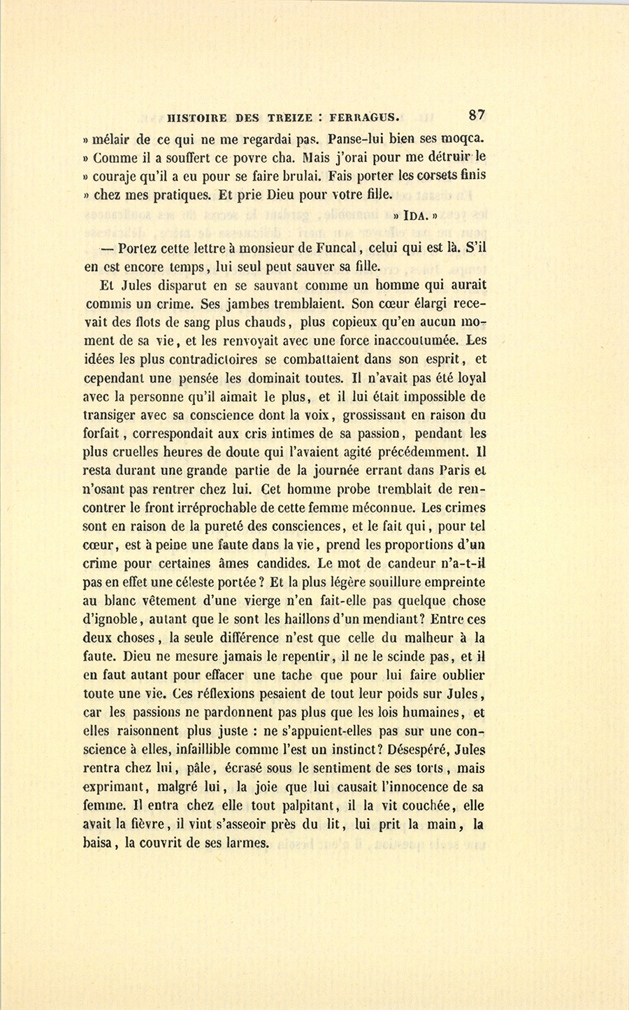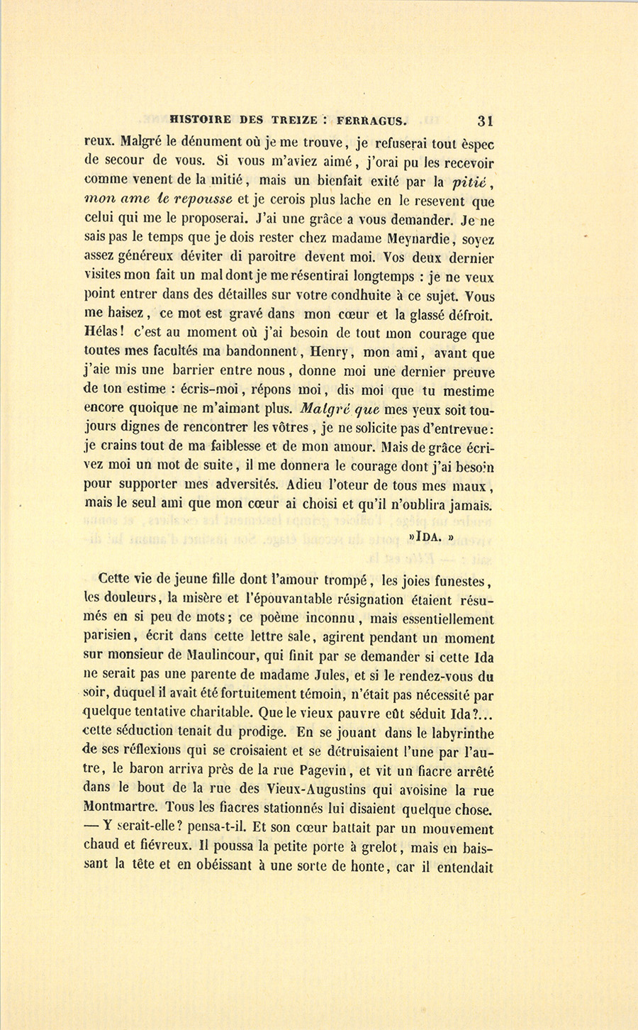 Cette vie de jeune fille dont l’amour trompé, les joies funestes, les douleurs, la misère et l’épouvantable résignation étaient résumés en si peu de mots ; ce poème inconnu, mais essentiellement parisien, écrit dans cette lettre sale, agirent pendant un moment sur monsieur de Maulincour, qui finit par se demander si cette Ida ne serait pas une parente de madame Jules, et si le rendez-vous du soir, duquel il avait été fortuitement témoin, n’était pas nécessité par quelque tentative charitable. Que le vieux pauvre eût séduit Ida ?… cette séduction tenait du prodige. En se jouant dans le labyrinthe de ses réflexions qui se croisaient et se détruisaient l’une par l’autre, le baron arriva près de la rue Pagevin, et vit un fiacre arrêté dans le bout de la rue des Vieux-Augustins qui avoisine la rue Montmartre. Tous les fiacres stationnés lui disaient quelque chose. – Y serait-elle ? pensa-t-il. Et son cœur battait par un mouvement chaud et fiévreux. Il poussa la petite porte à grelot, mais en baissant la tête et en obéissant à une sorte de honte, car il entendait {p. 32} une voix secrète qui lui disait : – Pourquoi mets-tu le pied dans ce mystère ?