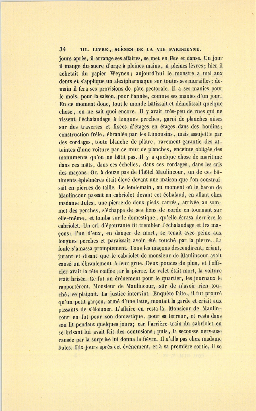 En ce temps-là, Paris avait la fièvre des constructions. Si Paris est un monstre, il est assurément le plus maniaque des monstres. Il s’éprend de mille fantaisies : tantôt il bâtit comme un grand seigneur qui aime la truelle ; puis, il laisse sa truelle, et devient militaire ; il s’habille de la tête aux pieds en garde national, fait l’exercice et fume ; tout à coup, il abandonne les répétitions militaires et jette son cigare ; puis il se désole, fait faillite, vend ses meubles sur la place du Châtelet, dépose son bilan ; mais quelques {p. 34} jours après, il arrange ses affaires, se met en fête et danse. Un jour il mange du sucre d’orge à pleines mains, à pleines lèvres ; hier il achetait du papier Weynen ; aujourd’hui le monstre a mal aux dents et s’applique un alexipharmaque sur toutes ses murailles ; demain il fera ses provisions de pâte pectorale. Il a ses manies pour le mois, pour la saison, pour l’année, comme ses manies d’un jour. En ce moment donc, tout le monde bâtissait et démolissait quelque chose, on ne sait quoi encore. Il y avait très-peu de rues qui ne vissent l’échafaudage à longues perches, garni de planches mises sur des traverses et fixées d’étages en étages dans des boulins ; construction frêle, ébranlée par les Limousins, mais assujettie par des cordages, toute blanche de plâtre, rarement garantie des atteintes d’une voiture par ce mur de planches, enceinte obligée des monuments qu’on ne bâtit pas. Il y a quelque chose de maritime dans ces mâts, dans ces échelles, dans ces cordages, dans les cris des maçons. Or, à douze pas de l’hôtel Maulincour, un de ces bâtiments éphémères était élevé devant une maison que l’on construisait en pierres de taille. Le lendemain, au moment où le baron de Maulincour passait en cabriolet devant cet échafaud, en allant chez madame Jules, une pierre de deux pieds carrés, arrivée au sommet des perches, s’échappa de ses liens de corde en tournant sur elle-même, et tomba sur le domestique, qu’elle écrasa derrière le cabriolet. Un cri d’épouvante fit trembler l’échafaudage et les maçons ; l’un d’eux, en danger de mort, se tenait avec peine aux longues perches et paraissait avoir été touché par la pierre. La foule s’amassa promptement. Tous les maçons descendirent, criant, jurant et disant que le cabriolet de monsieur de Maulincour avait causé un ébranlement à leur grue. Deux pouces de plus, et l’officier avait la tête coiffée par la pierre. Le valet était mort, la voiture était brisée. Ce fut un événement pour le quartier, les journaux le rapportèrent. Monsieur de Maulincour, sûr de n’avoir rien touché, se plaignit. La justice intervint. Enquête faite, il fut prouvé qu’un petit garçon, armé d’une latte, montait la garde et criait aux passants de s’éloigner. L’affaire en resta là. Monsieur de Maulincour en fut pour son domestique, pour sa terreur, et resta dans son lit pendant quelques jours ; car l’arrière-train du cabriolet en se brisant lui avait fait des contusions ; puis, la secousse nerveuse causée par la surprise lui donna la fièvre. Il n’alla pas chez madame Jules. Dix jours après cet événement, et à sa première sortie, il se {p. 35} rendait au bois de Boulogne dans son cabriolet restauré, lorsqu’en descendant la rue de Bourgogne, à l’endroit où se trouve l’égout, en face la Chambre des Députés, l’essieu se cassa net par le milieu, et le baron allait si rapidement que cette cassure eut pour effet de faire tendre les deux roues à se rejoindre assez violemment pour lui fracasser la tête ; mais il fut préservé de ce danger par la résistance qu’opposa la capote. Néanmoins il reçut une blessure grave au côté. Pour la seconde fois en dix jours il fut rapporté quasi mort chez la douairière éplorée. Ce second accident lui donna quelque défiance, et il pensa, mais vaguement, à Ferragus et à madame Jules. Pour éclaircir ses soupçons, il garda l’essieu brisé dans sa chambre, et manda son carrossier. Le carrossier vint, regarda l’essieu, la cassure, et prouva deux choses à monsieur de Maulincour. D’abord l’essieu ne sortait pas de ses ateliers ; il n’en fournissait aucun qu’il n’y gravât grossièrement les initiales de son nom, et il ne pouvait pas expliquer par quels moyens cet essieu avait été substitué à l’autre ; puis la cassure de cet essieu suspect avait été ménagée par une chambre, espèce de creux intérieur, par des soufflures et par des pailles très-habilement pratiquées.