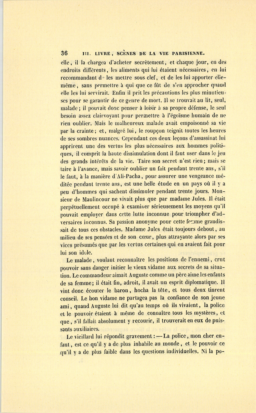 Enfin monsieur de Maulincour, quoique brave et militaire, ne put s’empêcher de frémir. Au milieu de toutes les pensées qui l’assaillirent, il y en eut une contre laquelle il se trouva sans défense et sans courage : le poison ne serait-il pas bientôt employé par ses ennemis secrets ? Aussitôt, dominé par des craintes que sa faiblesse momentanée, que la diète et la fièvre augmentaient encore, il fit venir une vieille femme attachée depuis long-temps à sa grand’mère, une femme qui avait pour lui un de ces sentiments à demi maternels, le sublime du commun. Sans s’ouvrir entièrement à {p. 36} elle, il la chargea d’acheter secrètement, et chaque jour, en des endroits différents, les aliments qui lui étaient nécessaires, en lui recommandant de les mettre sous clef, et de les lui apporter elle-même, sans permettre à qui que ce fût de s’en approcher quand elle les lui servirait. Enfin il prit les précautions les plus minutieuses pour se garantir de ce genre de mort. Il se trouvait au lit, seul, malade ; il pouvait donc penser à loisir à sa propre défense, le seul besoin assez clairvoyant pour permettre à l’égoïsme humain de ne rien oublier. Mais le malheureux malade avait empoisonné sa vie par la crainte ; et, malgré lui, le soupçon teignit toutes les heures de ses sombres nuances. Cependant ces deux leçons d’assassinat lui apprirent une des vertus les plus nécessaires aux hommes politiques, il comprit la haute dissimulation dont il faut user dans le jeu des grands intérêts de la vie. Taire son secret n’est rien ; mais se taire à l’avance, mais savoir oublier un fait pendant trente ans, s’il le faut, à la manière d’Ali-Pacha, pour assurer une vengeance méditée pendant trente ans, est une belle étude en un pays où il y a peu d’hommes qui sachent dissimuler pendant trente jours. Monsieur de Maulincour ne vivait plus que par madame Jules. Il était perpétuellement occupé à examiner sérieusement les moyens qu’il pouvait employer dans cette lutte inconnue pour triompher d’adversaires inconnus. Sa passion anonyme pour cette femme grandissait de tous ces obstacles. Madame Jules était toujours debout, au milieu de ses pensées et de son cœur, plus attrayante alors par ses vices présumés que par les vertus certaines qui en avaient fait pour lui son idole.