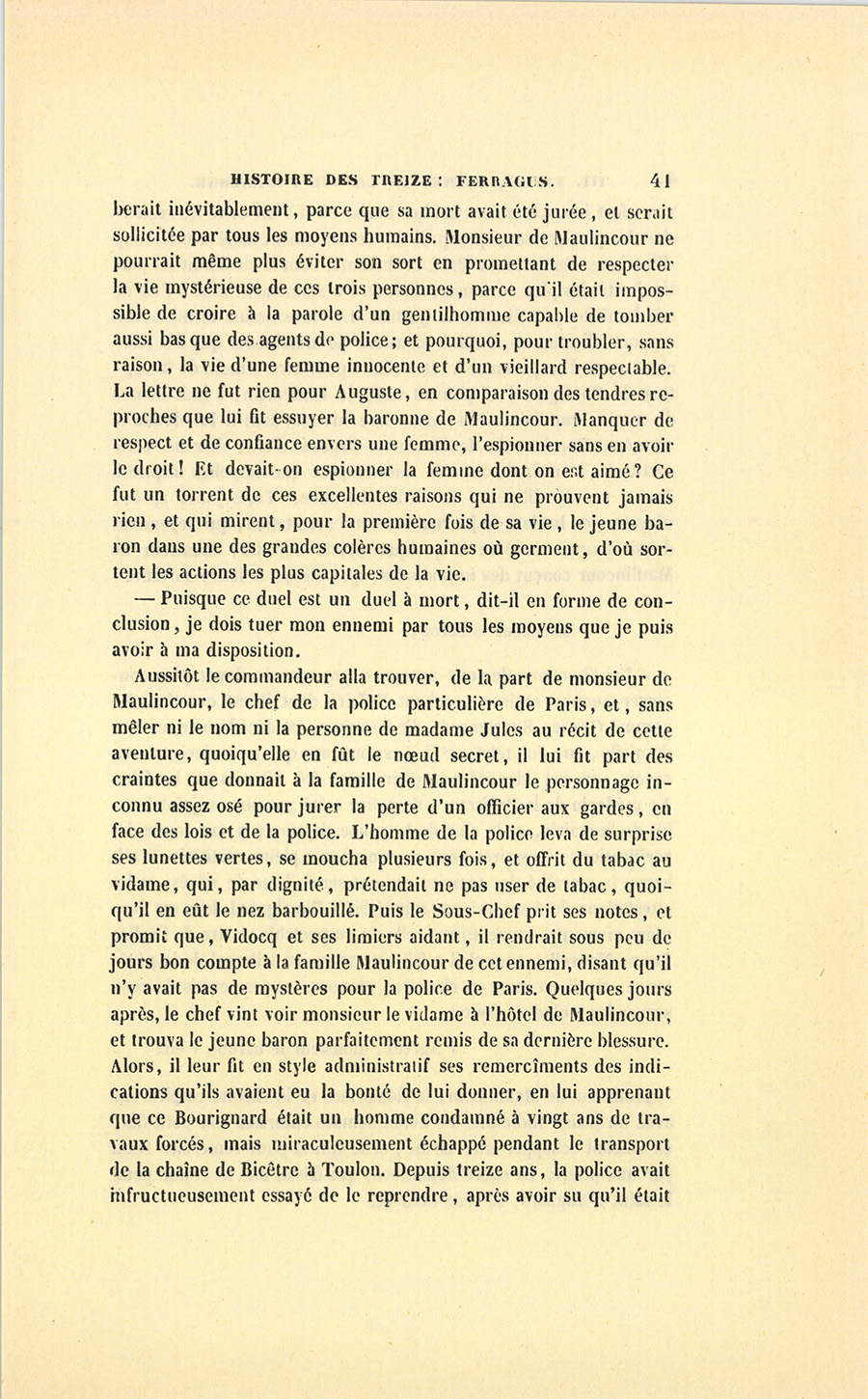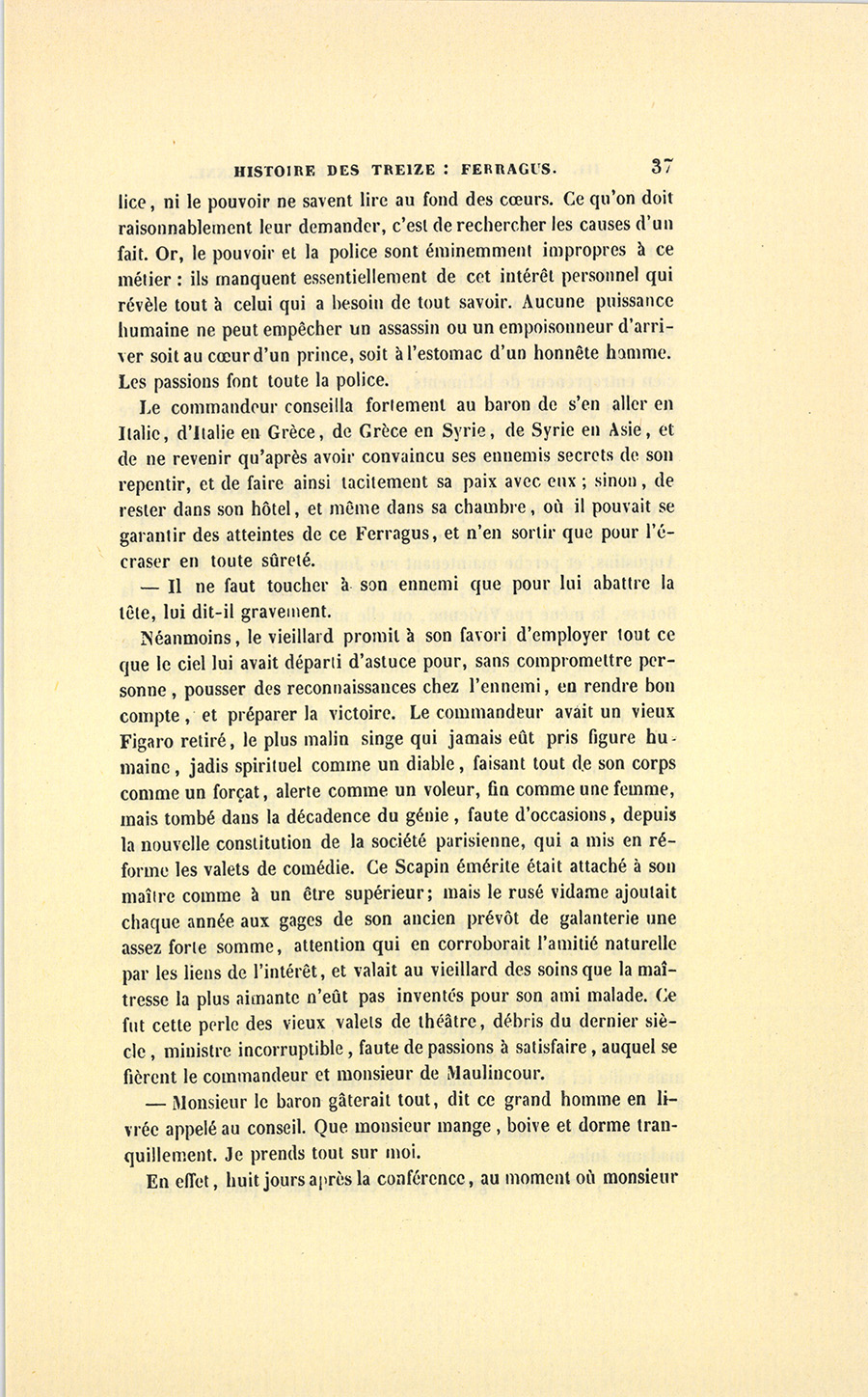 Le vieillard lui répondit gravement : – La police, mon cher enfant, est ce qu’il y a de plus inhabile au monde, et le pouvoir ce qu’il y a de plus faible dans les questions individuelles. Ni la {p. 37} police, ni le pouvoir ne savent lire au fond des cœurs. Ce qu’on doit raisonnablement leur demander, c’est de rechercher les causes d’un fait. Or, le pouvoir et la police sont éminemment impropres à ce métier : ils manquent essentiellement de cet intérêt personnel qui révèle tout à celui qui a besoin de tout savoir. Aucune puissance humaine ne peut empêcher un assassin ou un empoisonneur d’arriver soit au cœur d’un prince, soit à l’estomac d’un honnête homme. Les passions font toute la police.