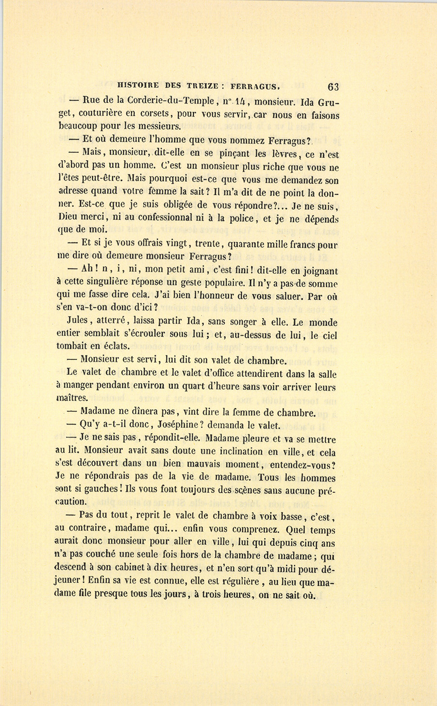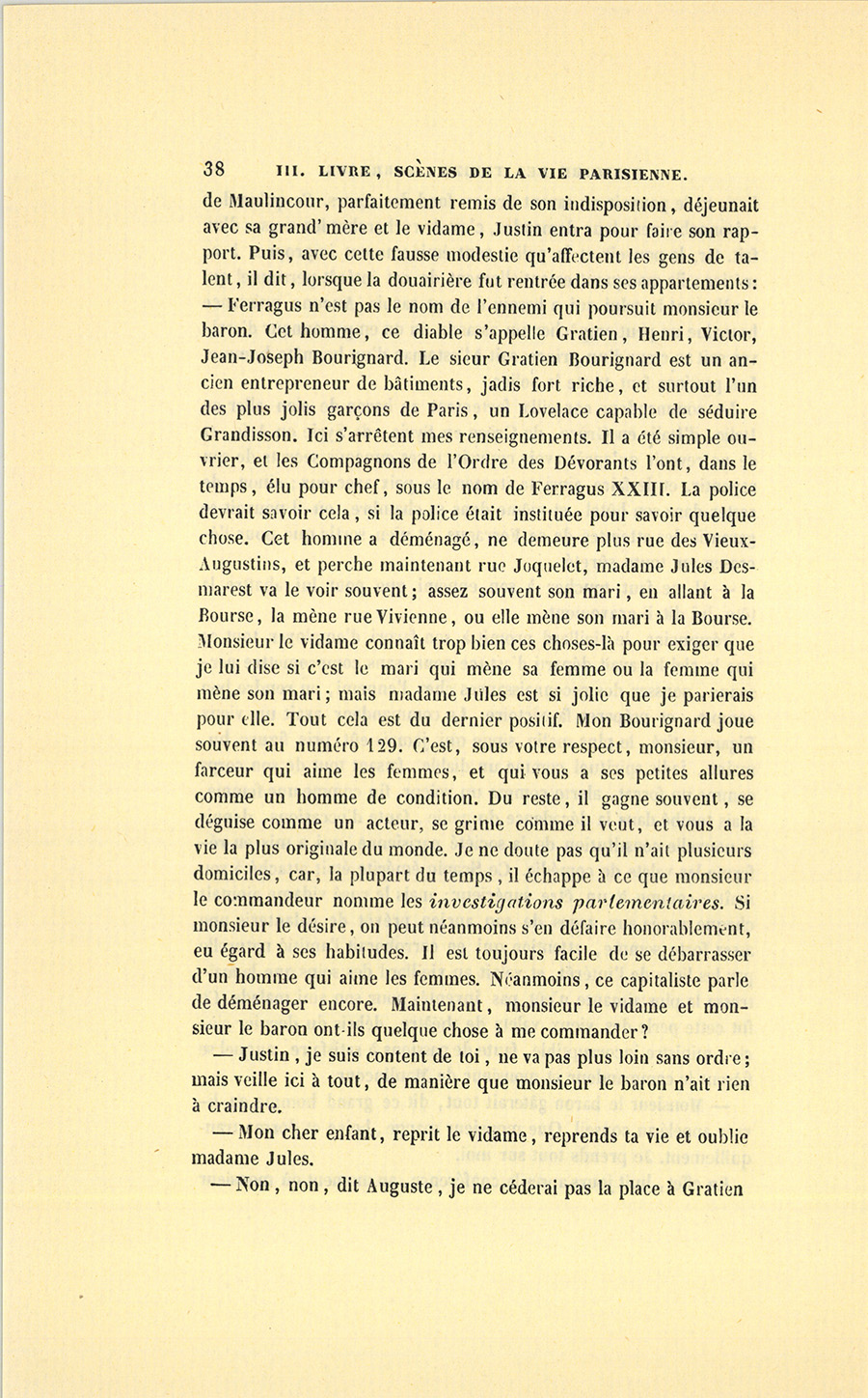 En effet, huit jours après la conférence, au moment où monsieur {p. 38} de Maulincour, parfaitement remis de son indisposition, déjeunait avec sa grand’mère et le vidame, Justin entra pour faire son rapport. Puis, avec cette fausse modestie qu’affectent les gens de talent, il dit, lorsque la douairière fut rentrée dans ses appartements : – Ferragus n’est pas le nom de l’ennemi qui poursuit monsieur le baron. Cet homme, ce diable s’appelle Gratien, Henri, Victor, Jean-Joseph Bourignard. Le sieur Gratien Bourignard est un ancien entrepreneur de bâtiments, jadis fort riche, et surtout l’un des plus jolis garçons de Paris, un Lovelace capable de séduire Grandisson. Ici s’arrêtent mes renseignements. Il a été simple ouvrier, et les Compagnons de l’Ordre des Dévorants l’ont, dans le temps, élu pour chef, sous le nom de Ferragus XXIII. La police devrait savoir cela, si la police était instituée pour savoir quelque chose. Cet homme a déménagé, ne demeure plus rue des Vieux-Augustins, et perche maintenant rue Joquelet, madame Jules Desmarest va le voir souvent ; assez souvent son mari, en allant à la Bourse, la mène rue Vivienne, ou elle mène son mari à la Bourse. Monsieur le vidame connaît trop bien ces choses là pour exiger que je lui dise si c’est le mari qui mène sa femme ou la femme qui mène son mari ; mais madame Jules est si jolie que je parierais pour elle. Tout cela est du dernier positif. Mon Bourignard joue souvent au numéro 129. C’est, sous votre respect, monsieur, un farceur qui aime les femmes, et qui vous a ses petites allures comme un homme de condition. Du reste, il gagne souvent, se déguise comme un acteur, se grime comme il veut, et vous a la vie la plus originale du monde. Je ne doute pas qu’il n’ait plusieurs domiciles, car, la plupart du temps, il échappe à ce que monsieur le commandeur nomme les investigations parlementaires. Si monsieur le désire, on peut néanmoins s’en défaire honorablement, eu égard à ses habitudes. Il est toujours facile de se débarrasser d’un homme qui aime les femmes. Néanmoins, ce capitaliste parle de déménager encore. Maintenant, monsieur le vidame et monsieur le baron ont-ils quelque chose à me commander ?