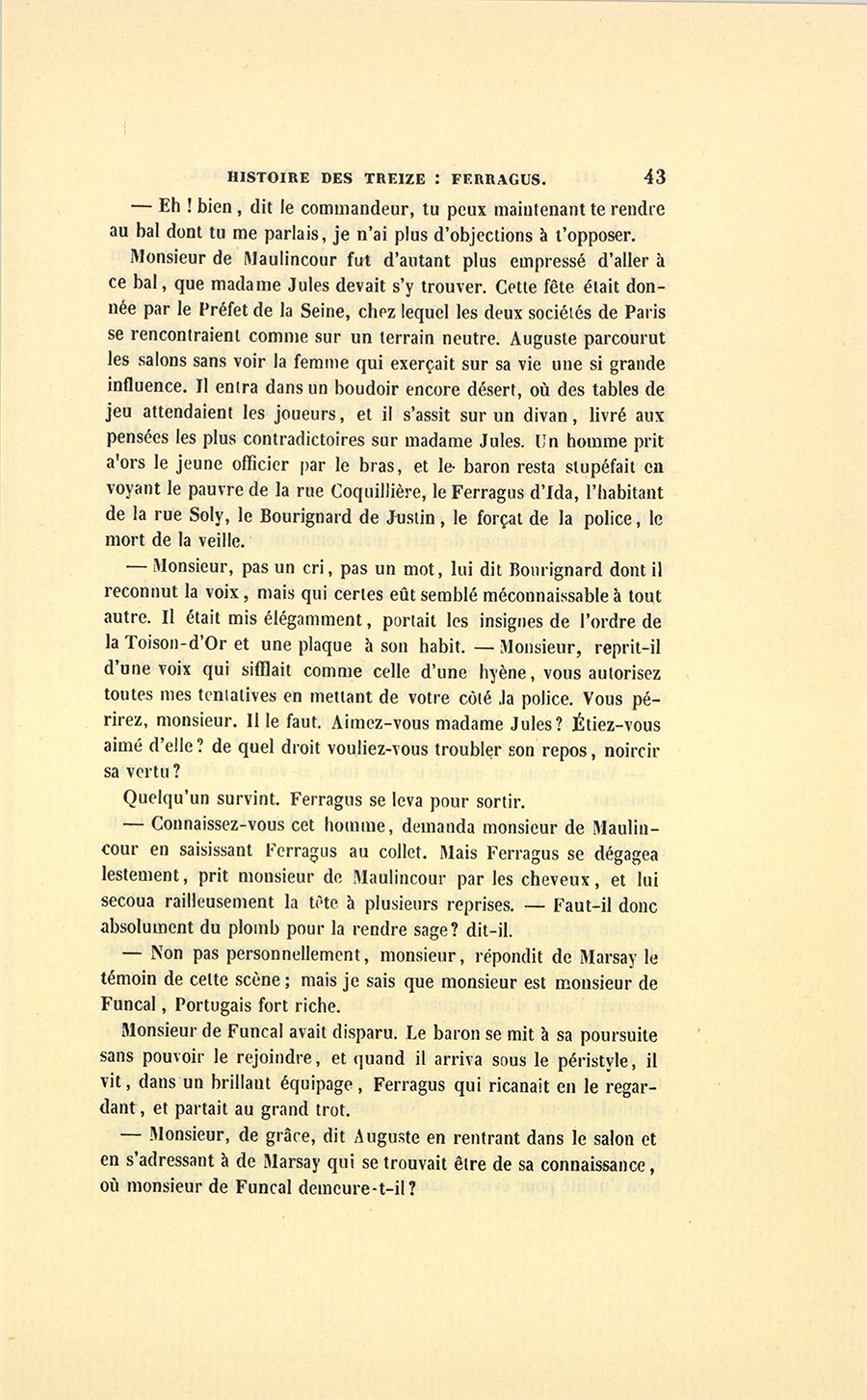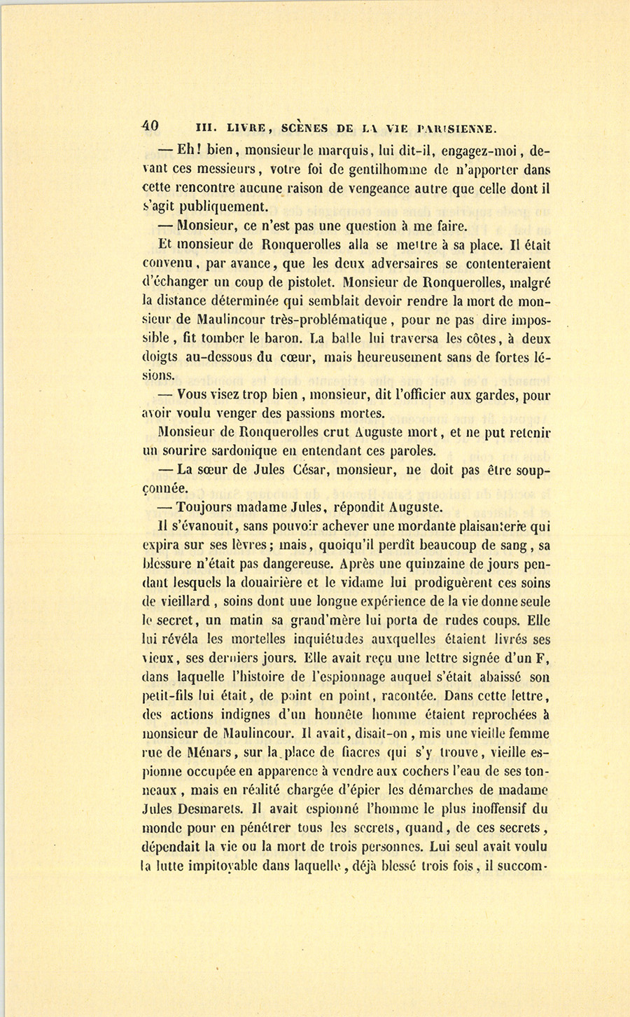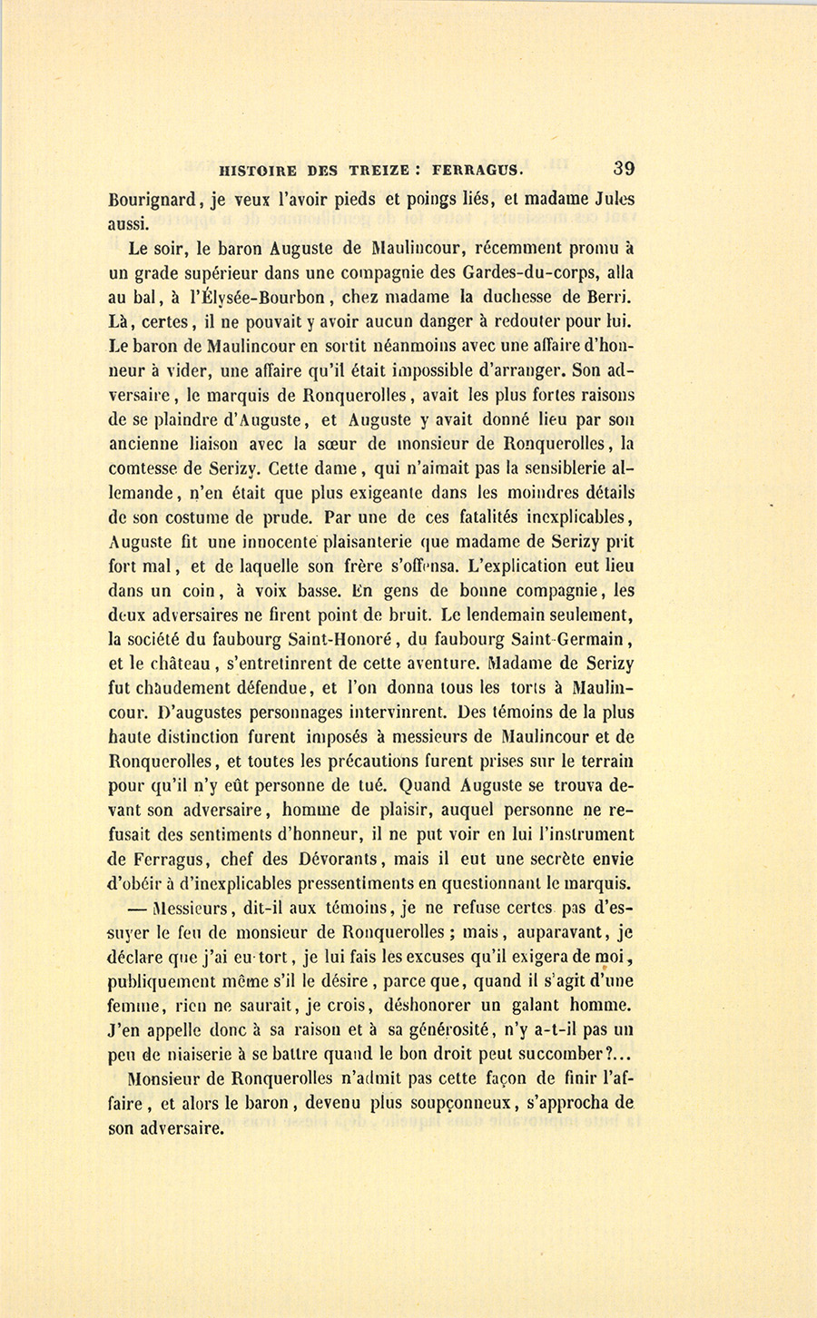 {p. 40} – Eh ! bien, monsieur le marquis, lui dit-il, engagez-moi, devant ces messieurs, votre foi de gentilhomme de n’apporter dans cette rencontre aucune raison de vengeance autre que celle dont il s’agit publiquement.