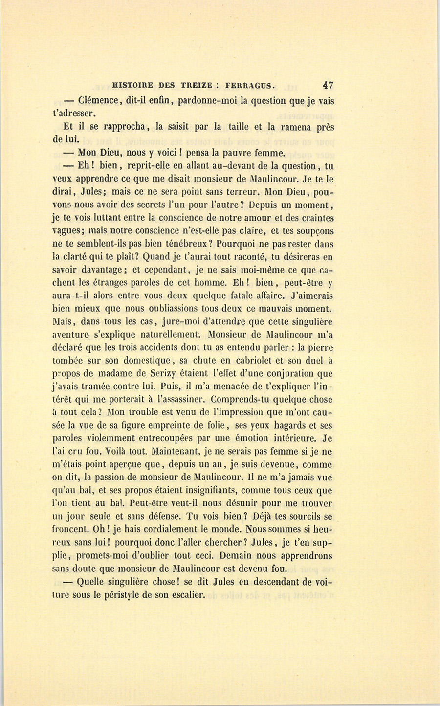 – C’est une guerre à mort, se dit-il en s’agitant dans son lit, une guerre de sauvage, une guerre de surprise, d’embuscade, de traîtrise, déclarée au nom de madame Jules. À quel homme appartient-elle donc ? De quel pouvoir dispose donc ce Ferragus ?